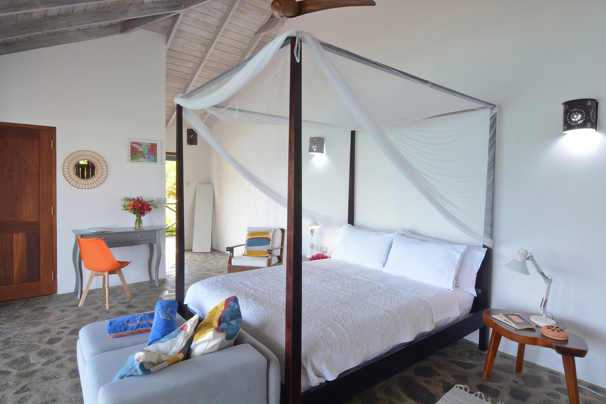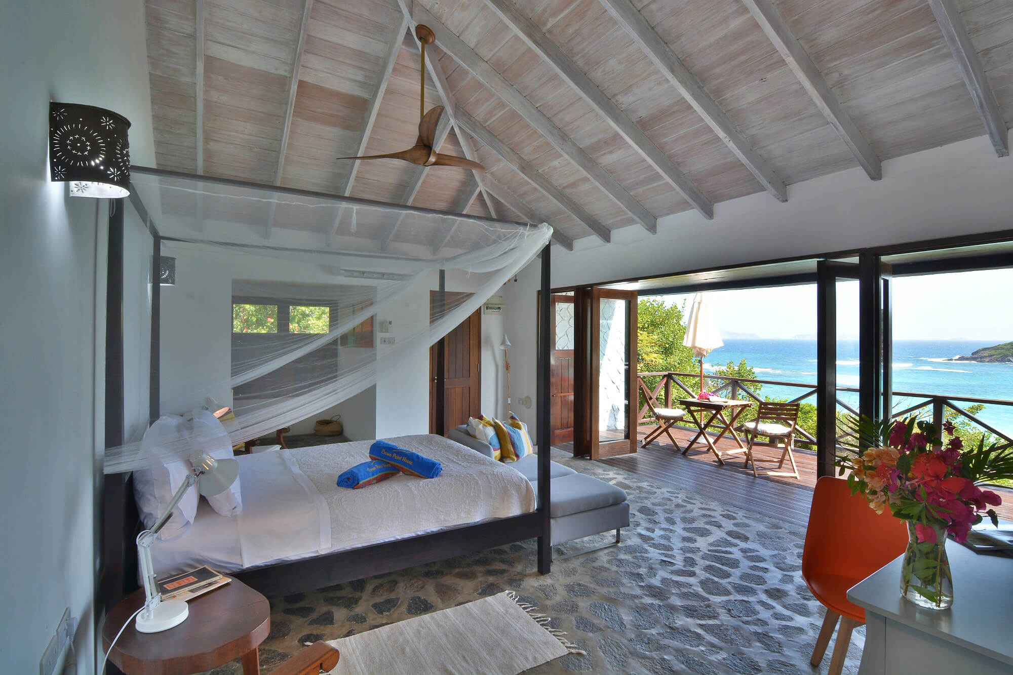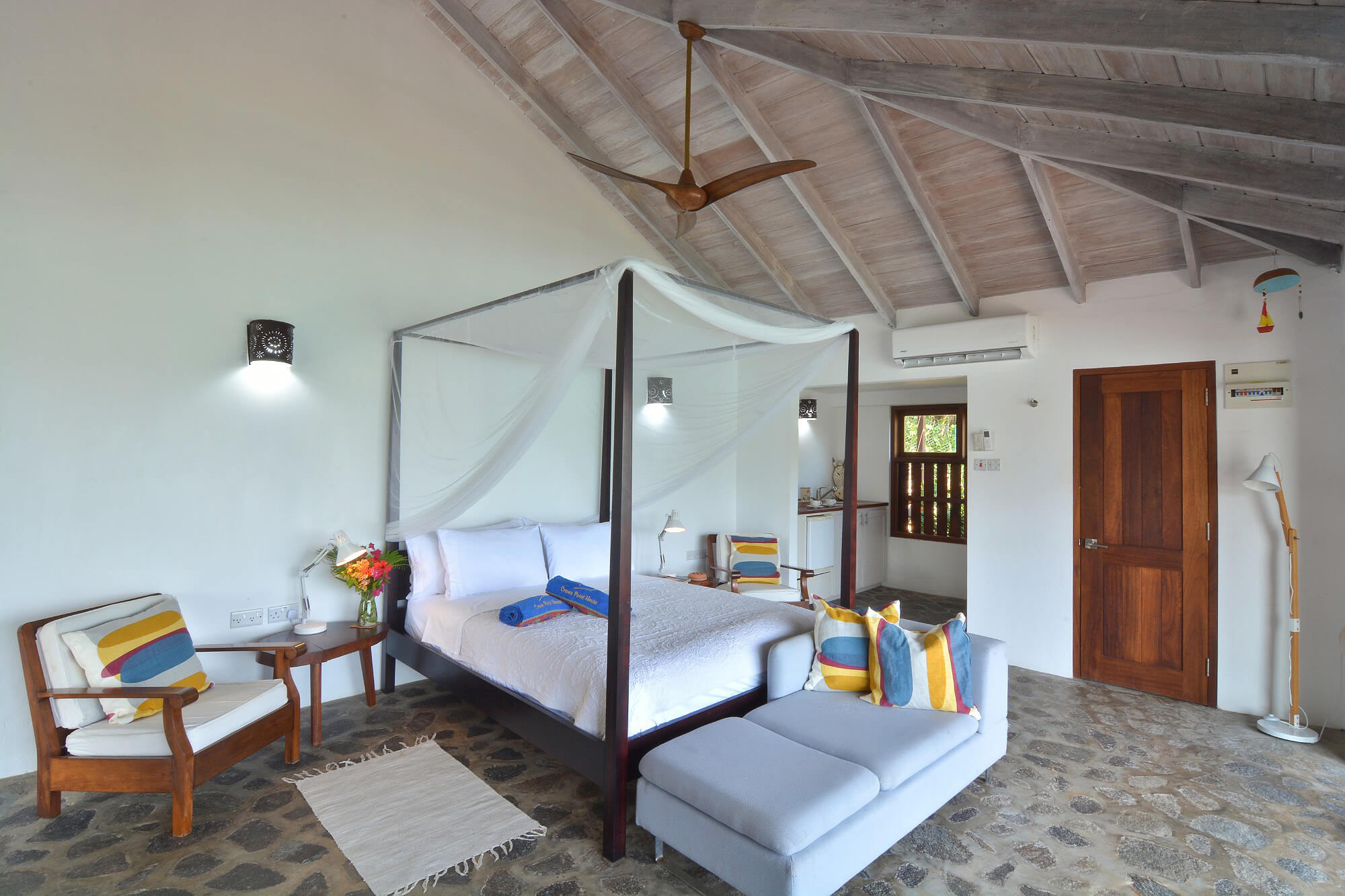 The floors throughout are made from local stone and maintain a cool temperature underfoot. Due to Crown Point House being located upon the windward side of the island guests can enjoy the year round natural air conditioning that cools the house via the floor to ceiling height windows and the wrap around verandah. Air conditioning is also provided in each bedroom.