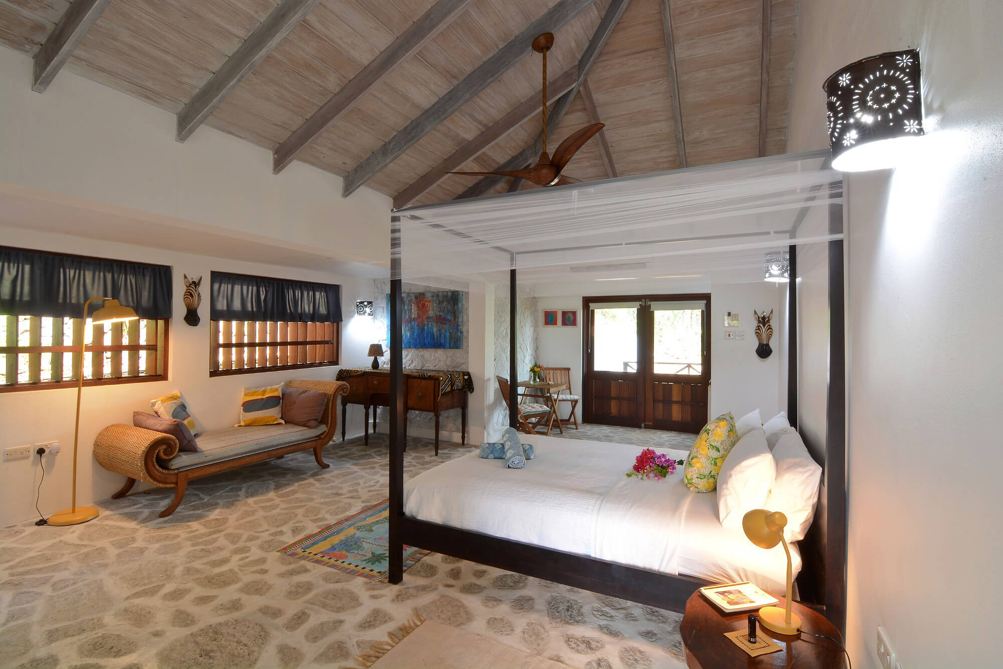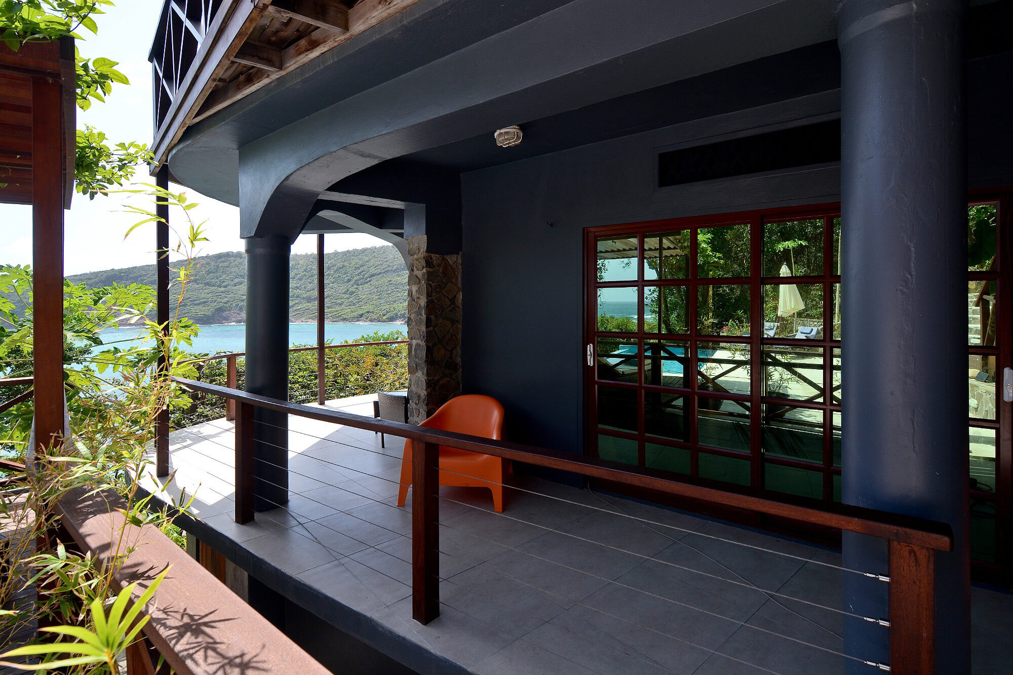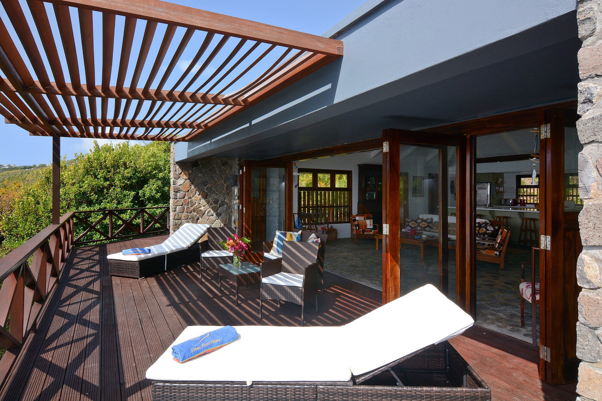 The floors throughout are made from local stone and maintain a cool temperature underfoot. Due to Crown Point House being located upon the windward side of the island guests can enjoy the year round natural air conditioning that cools the house via the floor to ceiling height windows and the wrap around verandah. Air conditioning is also provided in each bedroom.