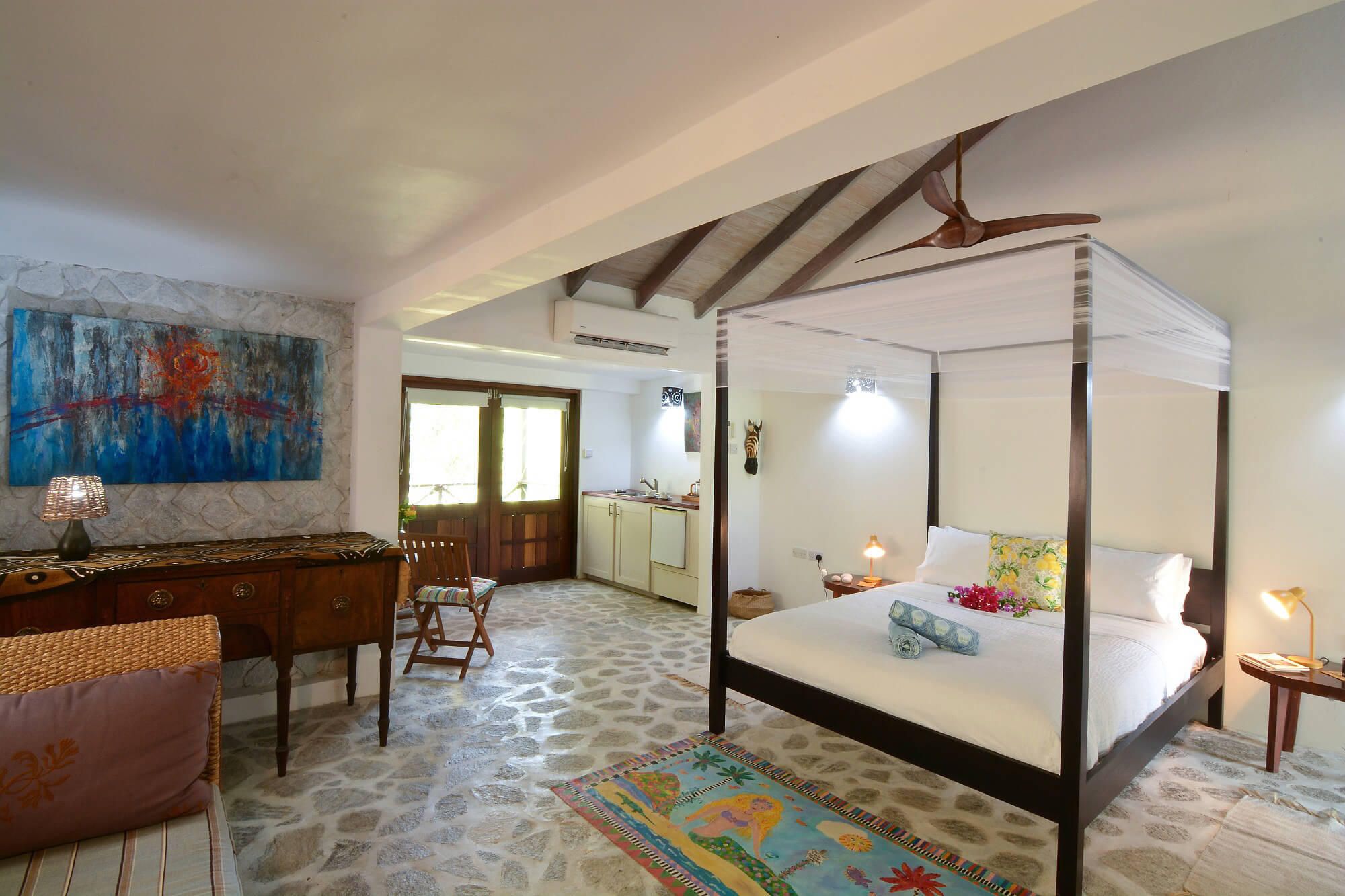 There are 4 bedrooms in total, 2 in each section of the property. The second building contains the two bedroom suites, and is accessed via some steps outside. The master suite with panoramic ocean views, and the second garden bedroom have 4 poster king sized beds, en suite bathrooms, air conditioning, high lofted ceilings with fans and with kitchenettes including mini fridge with ice compartment.