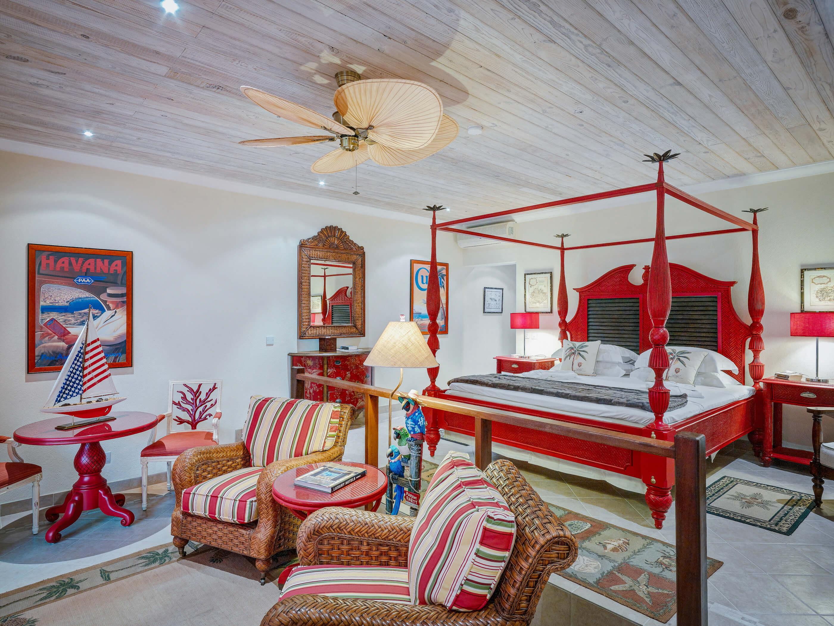 Tastefully Furnished in a bespoke colonial style, the suite has a comfortable seating area, plenty of storage space and a private covered terrace with more seating and sun loungers with views over the Caribbean Sea towards the island of Mustique. The large one bedroom suite has a luxurious double bed, and add on room with a twin bed if required. There is also a good sized en suite bathroom. The room has a calm colour scheme, and has wooden beam ceilings with ceiling fan along with the air conditioning to keep guests cool at night. This is a great space to relax in after a busy day of Bequia exploring.