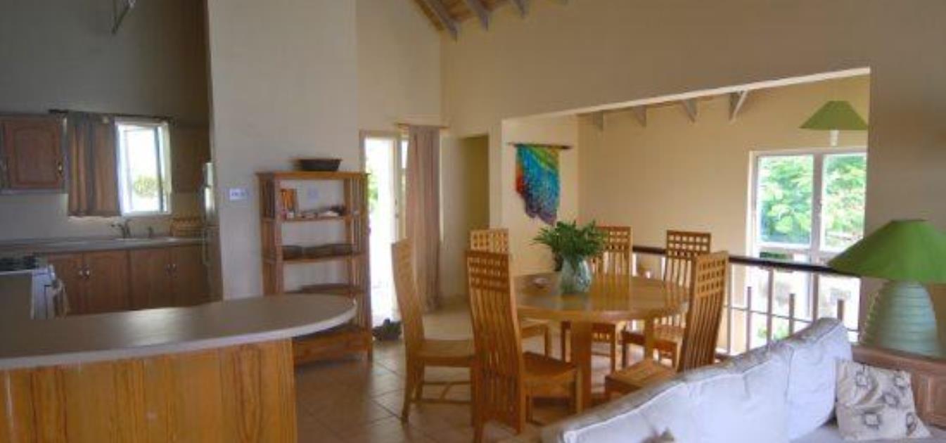 The open-plan living area features soaring vaulted ceilings and wide, inviting doors that lead out to a private balcony — the perfect spot to lounge on sunbeds and soak up the warm Caribbean sunshine. The stylish seating area is fresh, bright, and tastefully decorated, creating a welcoming atmosphere throughout the apartment.