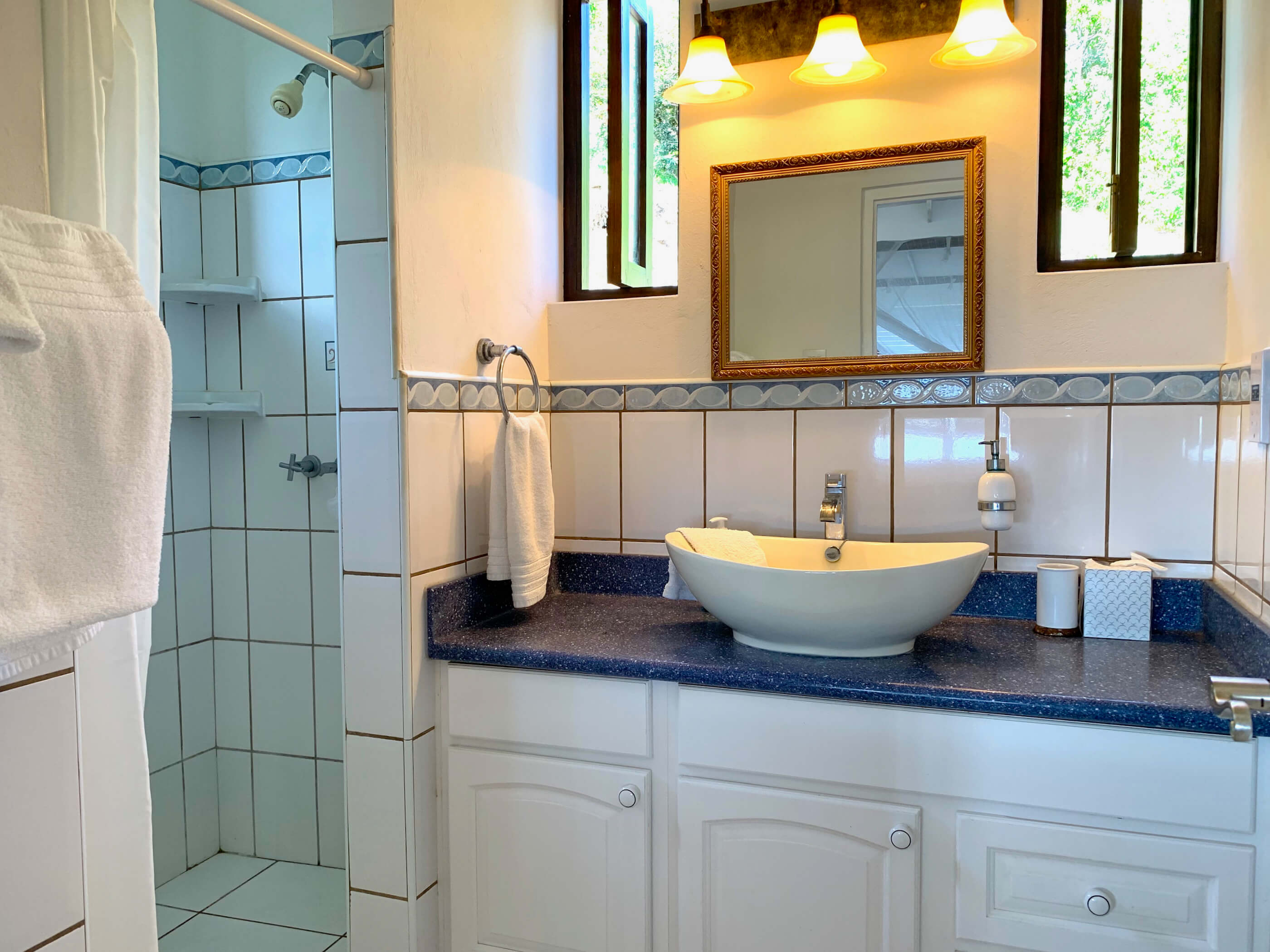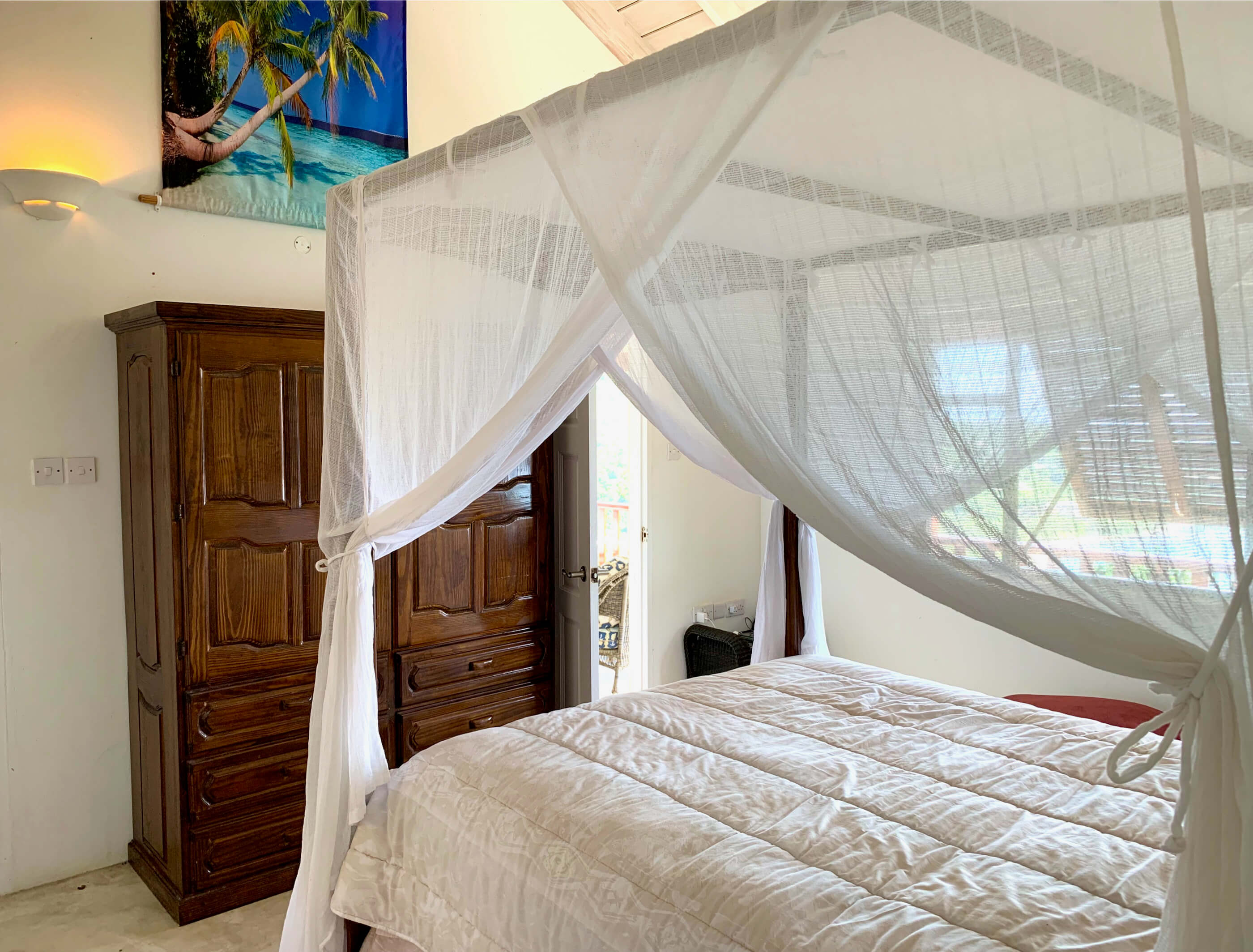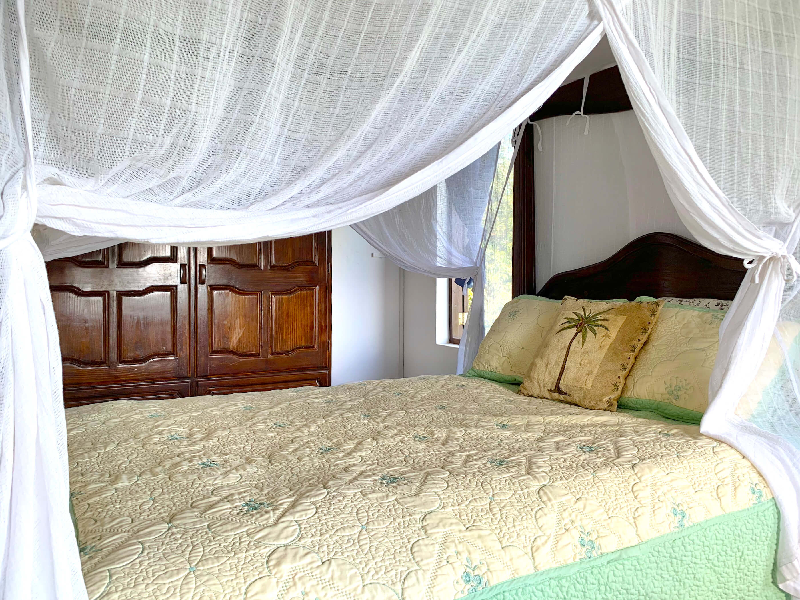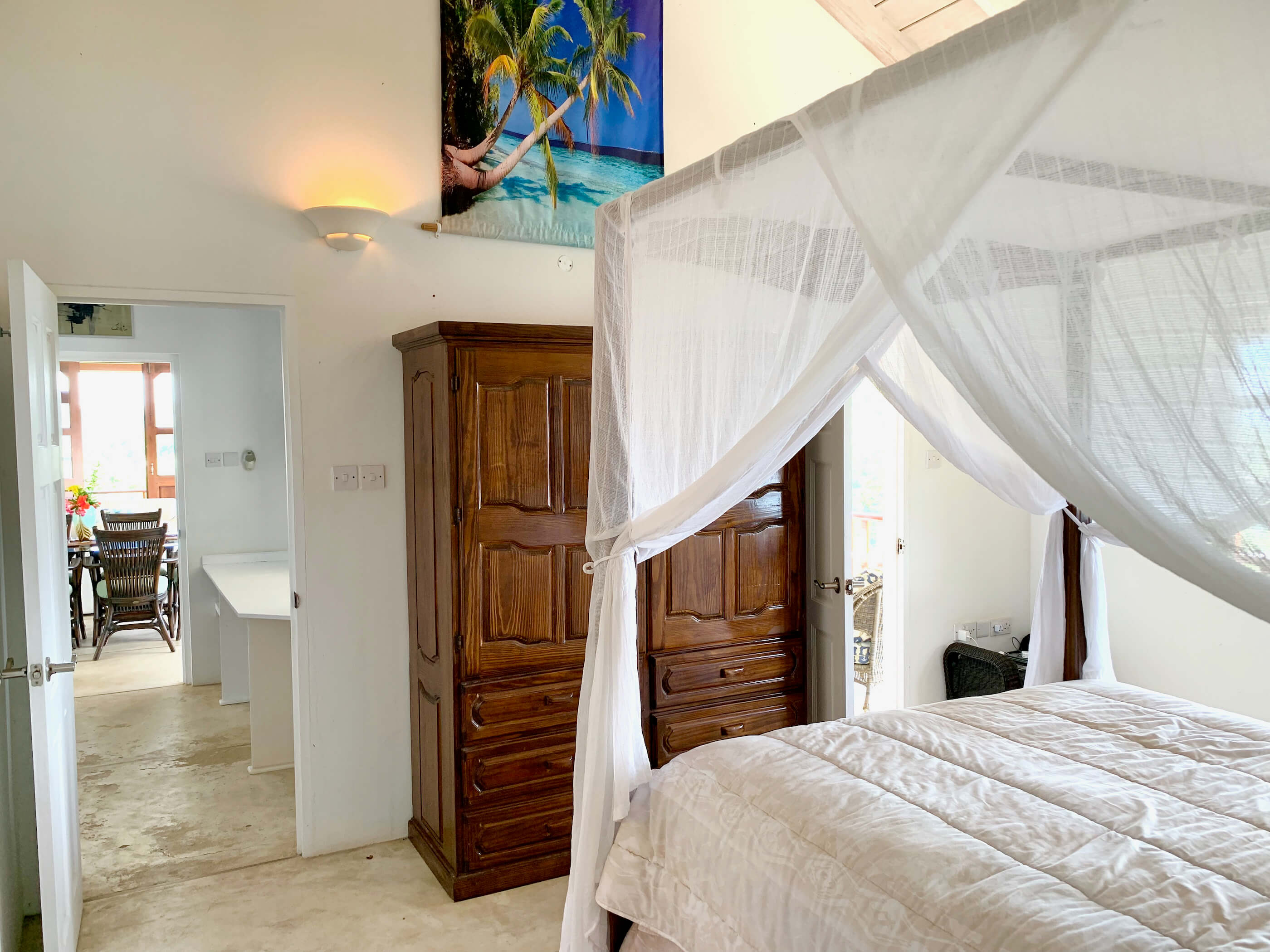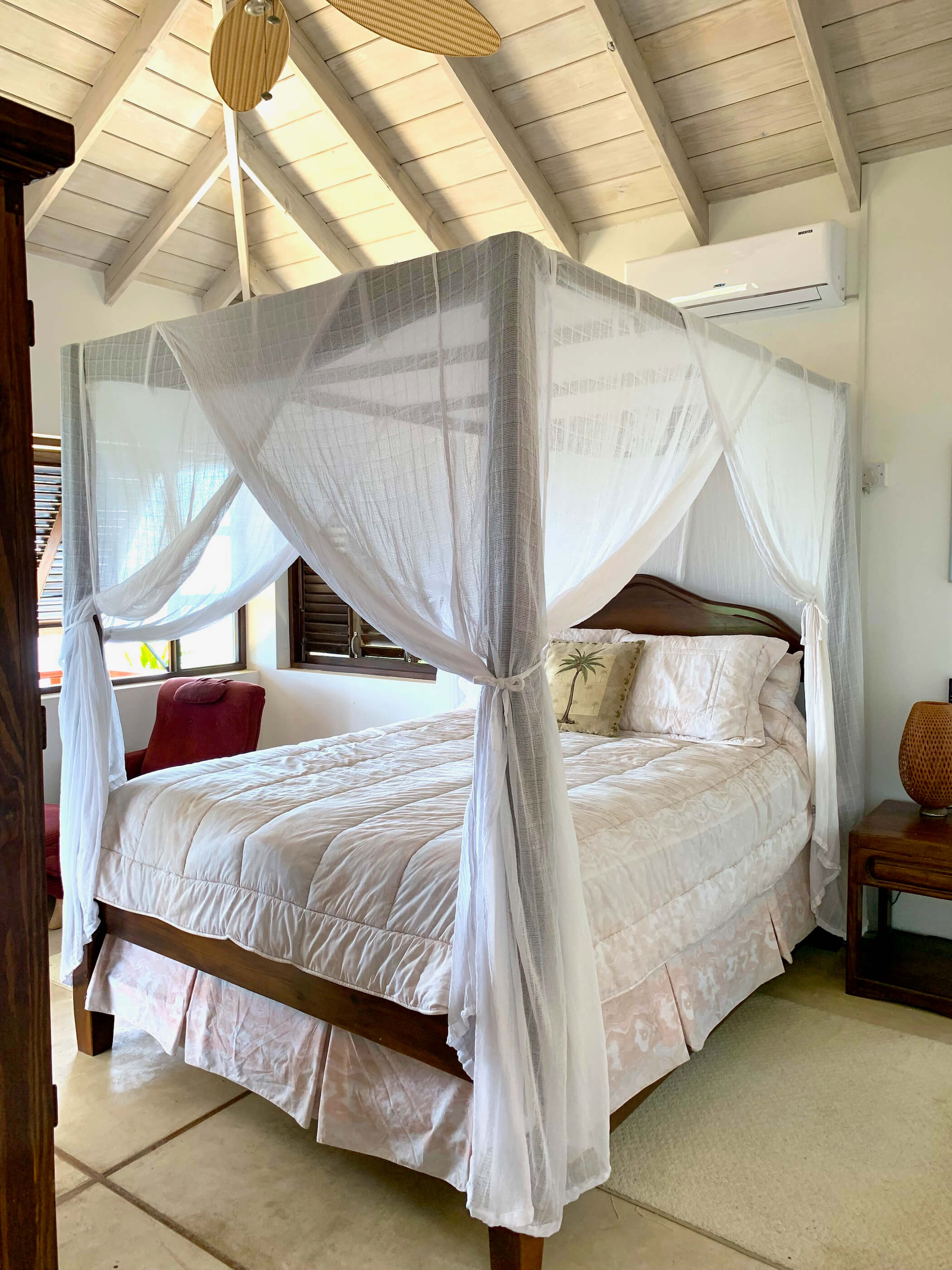 The bedrooms are equipped with air conditioning, ceiling fans and mosquito netting, although neither are used often as the trade winds are almost constant and keep the house comfortable and mosquito free. The office is located next to the master bedroom and has a double futon that can be used as an extra bed if needed. The bedrooms on the upper level are located either side of the living area. Access to the lower self contained bedroom is via the pool deck.