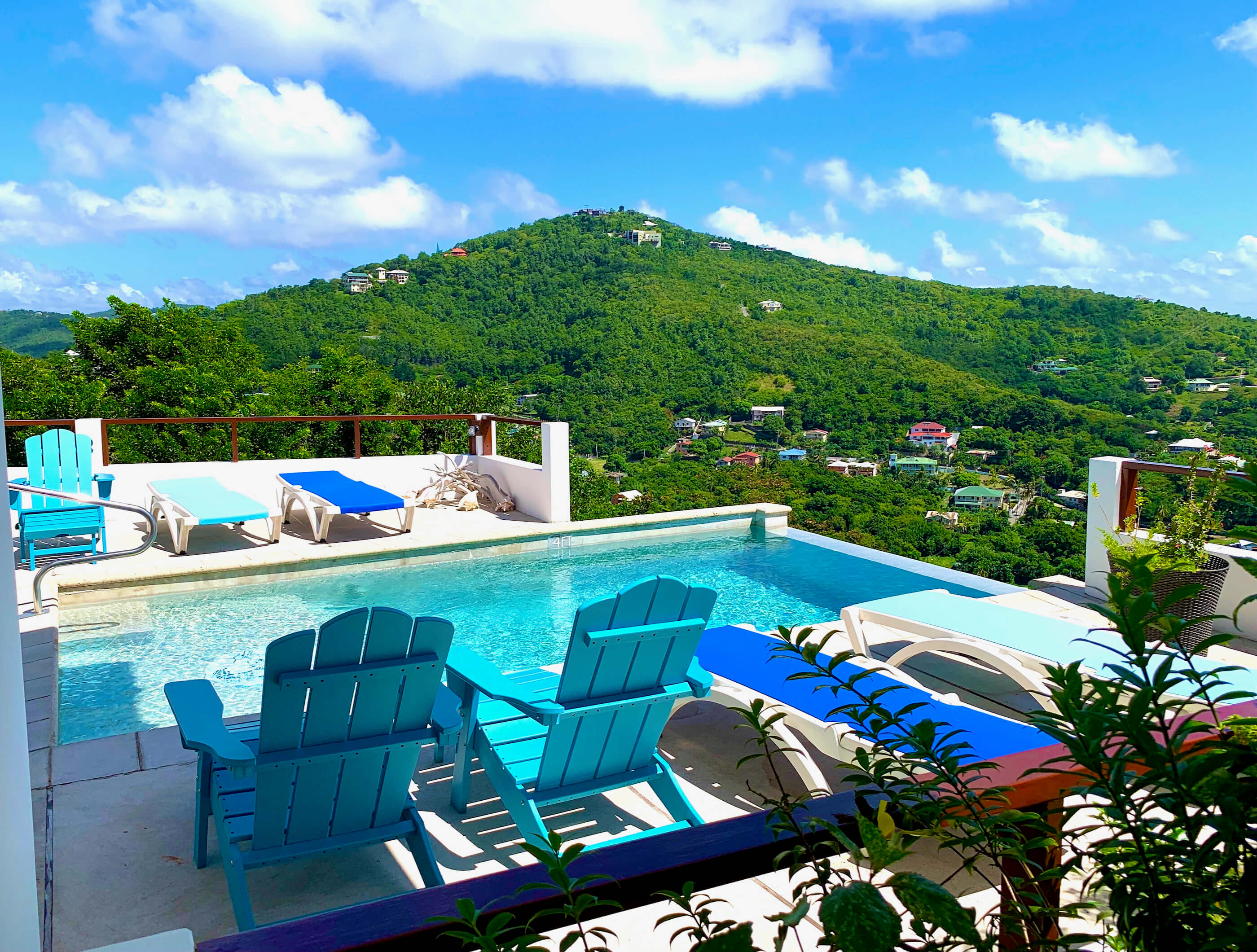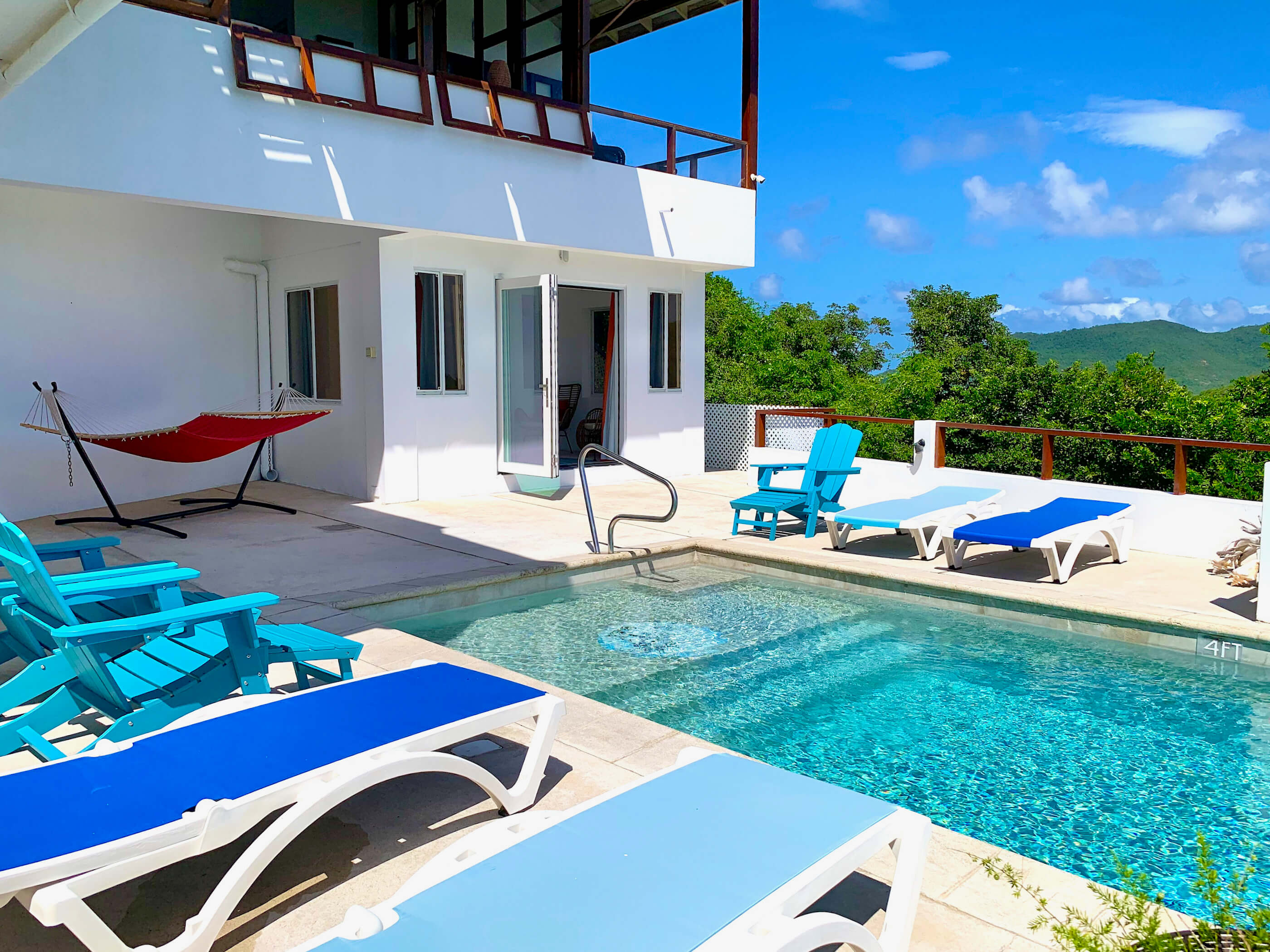 Friendship Breezes has a nice sized salt water swimming pool - 18ft by 10ft by 4.5ft Deep with infinity edge. Surrounding the pool is a spacious pool deck / verandah with the balcony above offering partial shade.