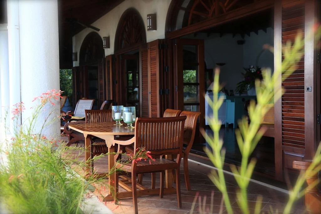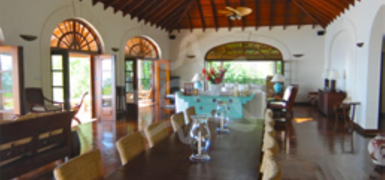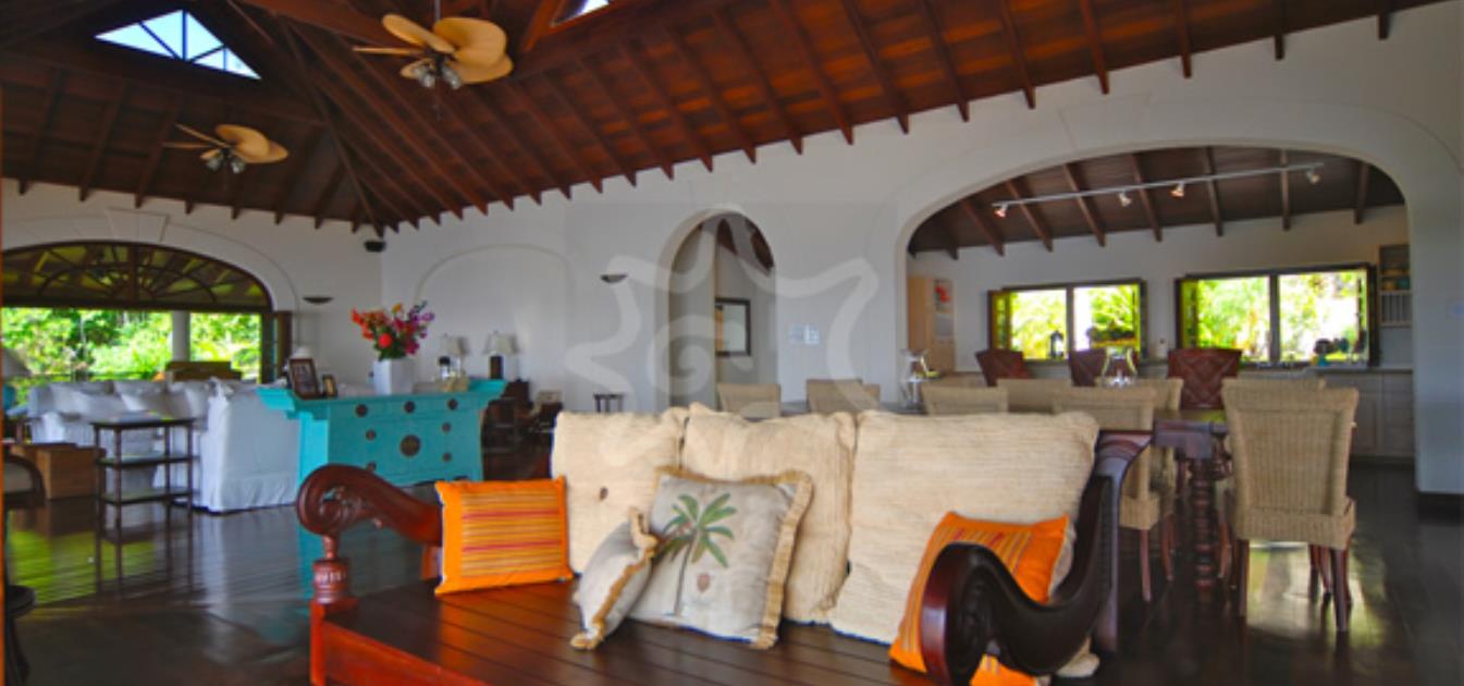 The architect of Sights & Sounds is Beyer Binder Belle of New York City. World renowned Architects for many landmark buildings in New York, London and Washington DC, as well as premier homes. This is an ideal property for discerning clients looking to avoid commercial areas and enjoy wonderful seclusion with a special ambiance, sophisticated interior design and world class build quality. The heart of this 6000 square-foot property is the great room, which encompasses the living and dining areas. This room literally "opens" up to the views through a series of five large tri-fold doors located on three sides of the room all leading to a generously-sized covered veranda - seamlessly integrating indoor and outdoor living space. The living area is cool and light, with a spectacular vaulted Brazilian Ipe wood ceiling and architecturally designed Ipe floors. The room is elegantly and comfortably furnished with two oversized white sofas, tables, lounge chairs and ottomans. A perfect place to retire at the end of a busy day and enjoy the ocean breezes while playing cards or board games with the family. Please note that there is no TV at this villa.