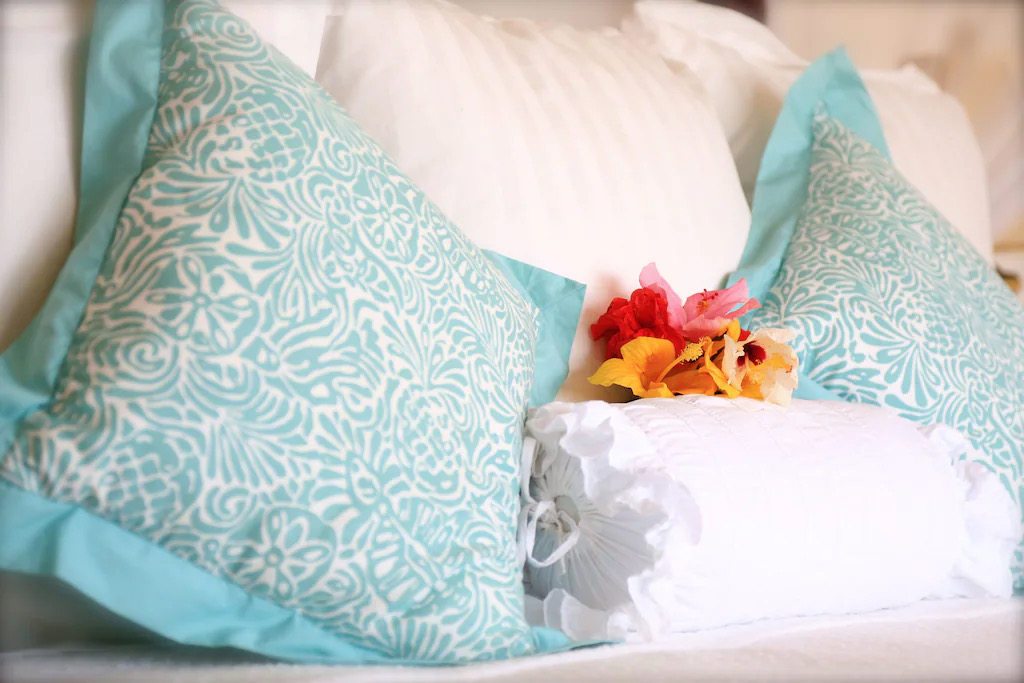 On the lower level, the bedroom layout is very spacious and well suited for family 2 adults and 2 children. The twin bed portion of the room can be separated by a screen for privacy. The Twins can also be made into a bunk bed and it is decorated in fresh, Caribbean colors. There is also a pack n' play portable crib available if needed.