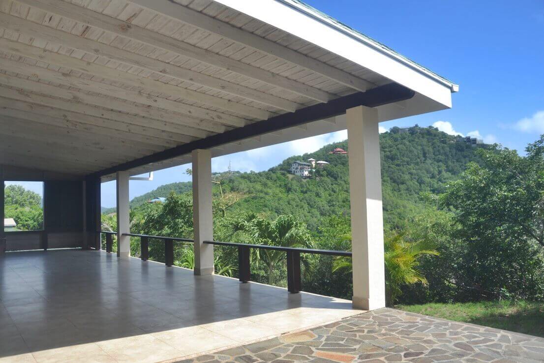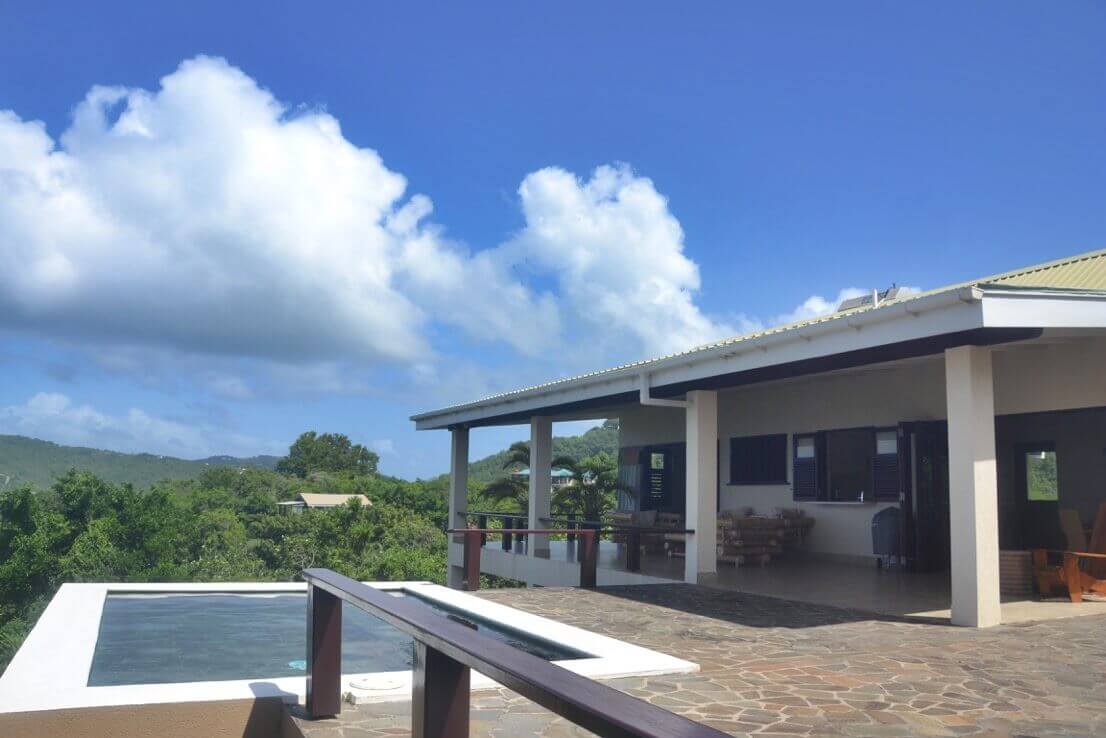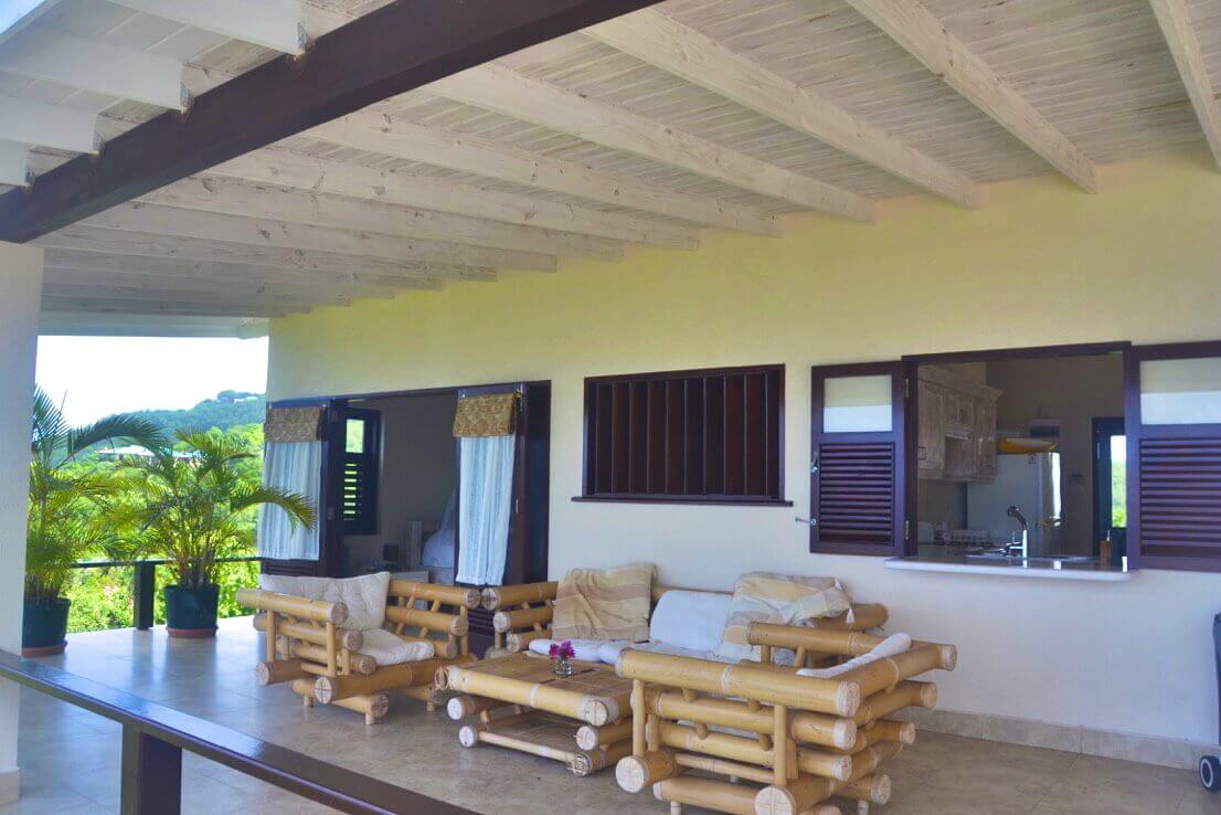 The spacious upper level contains the en suite master bedroom and open plan living spaces, kitchen / dining, opening out onto the large covered balcony and sun deck with swimming pool. All with ocean views over Lower Bay, Princess Margaret & Admiralty Bay. There is also a further verandah on the windward side with the Eastern views of Friendship Bay, the island of Battawia and Mustique.