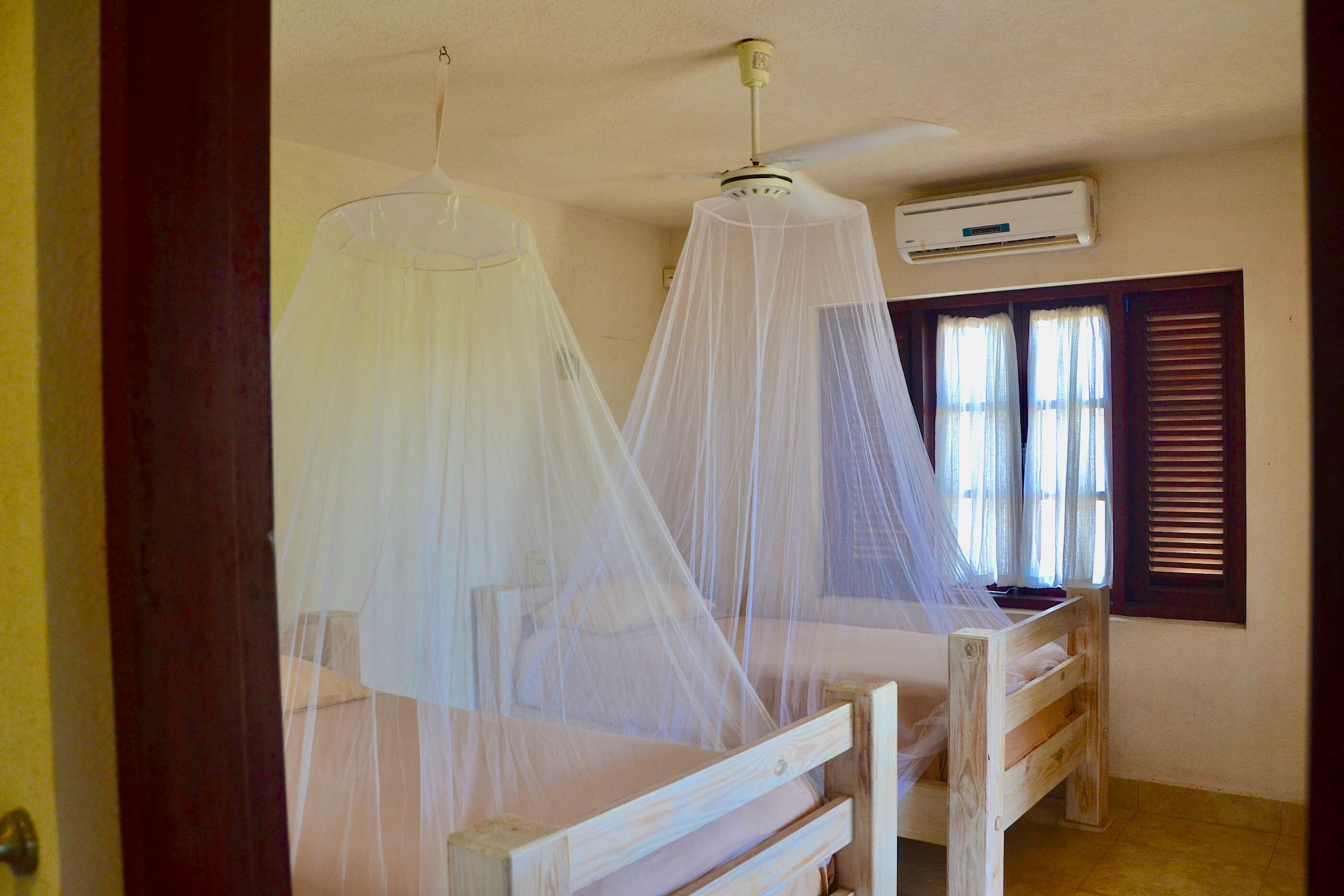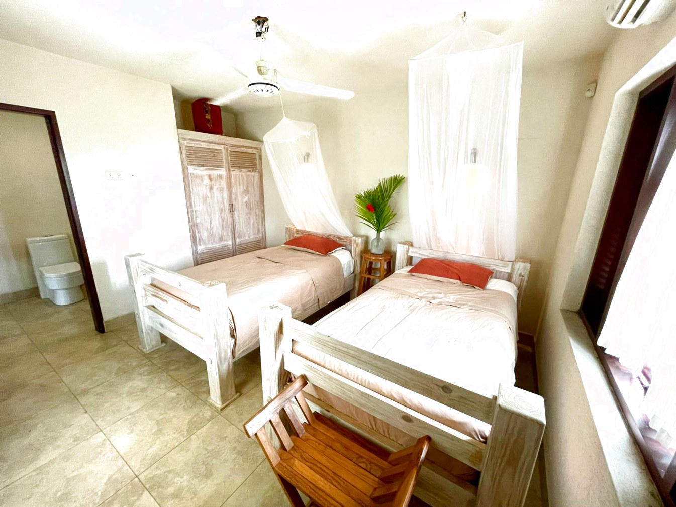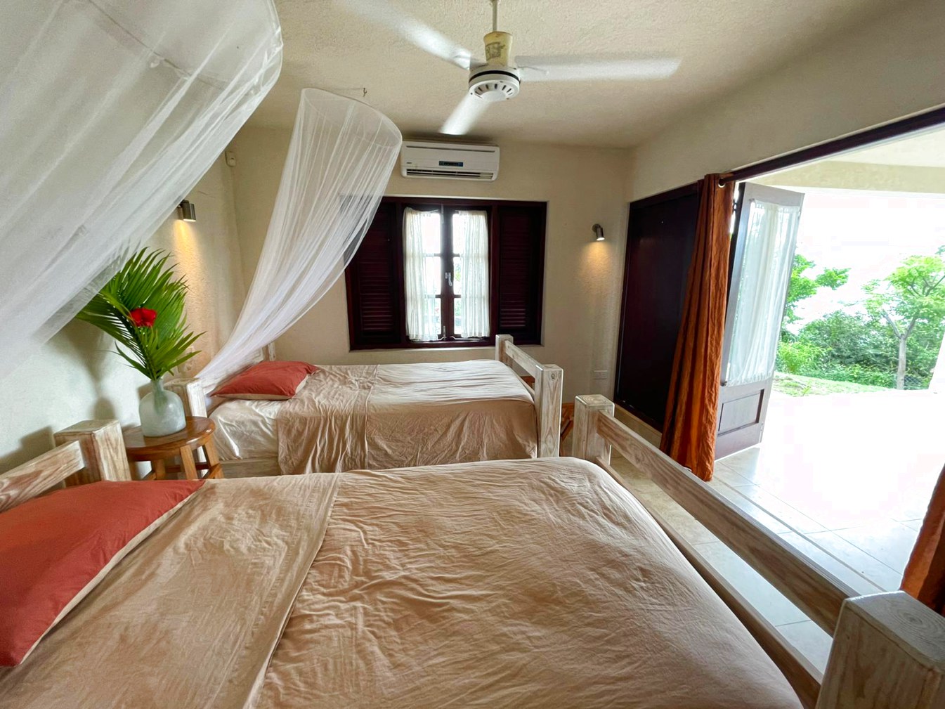 - 1 x Twin beds with shared bathroom and air conditioning