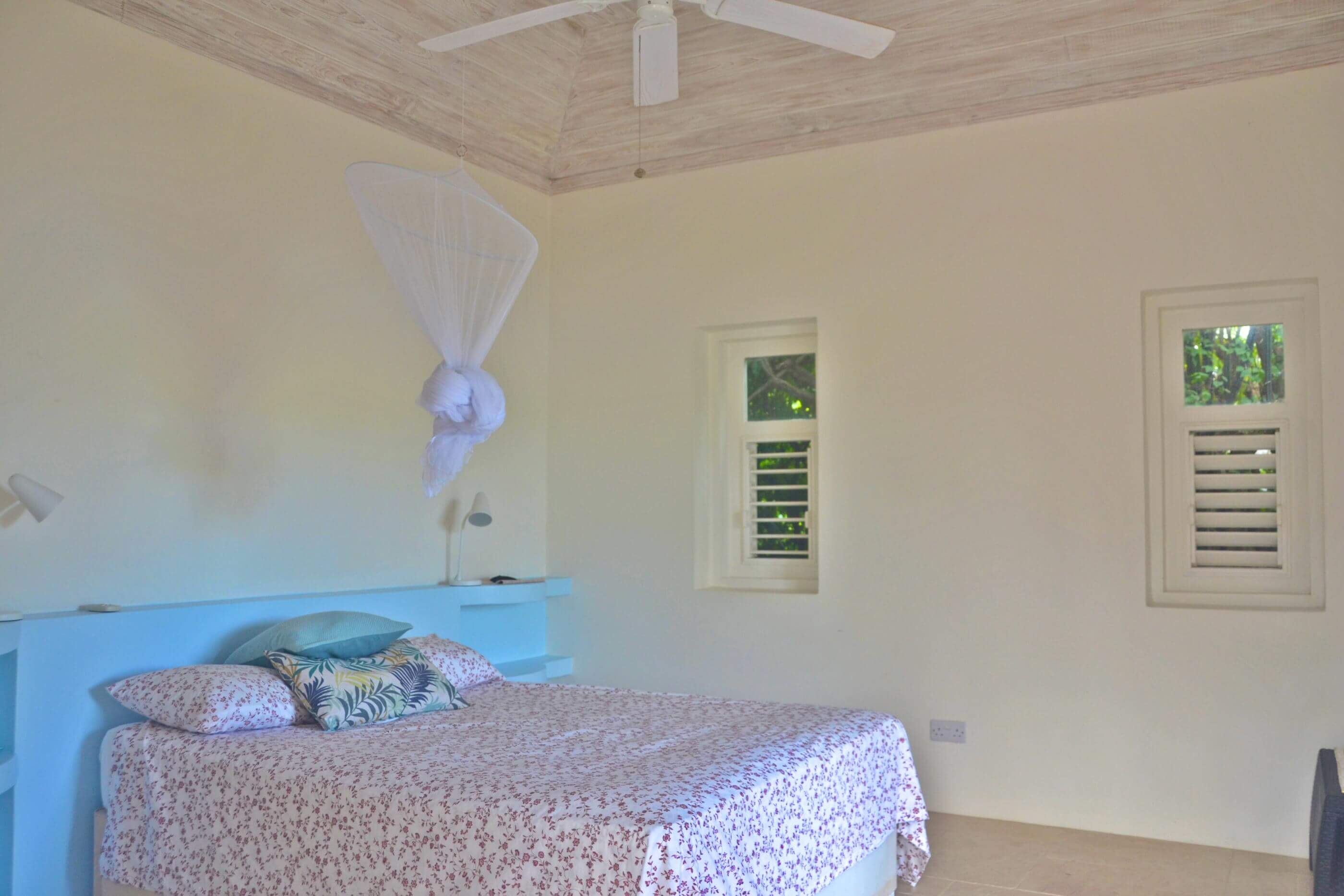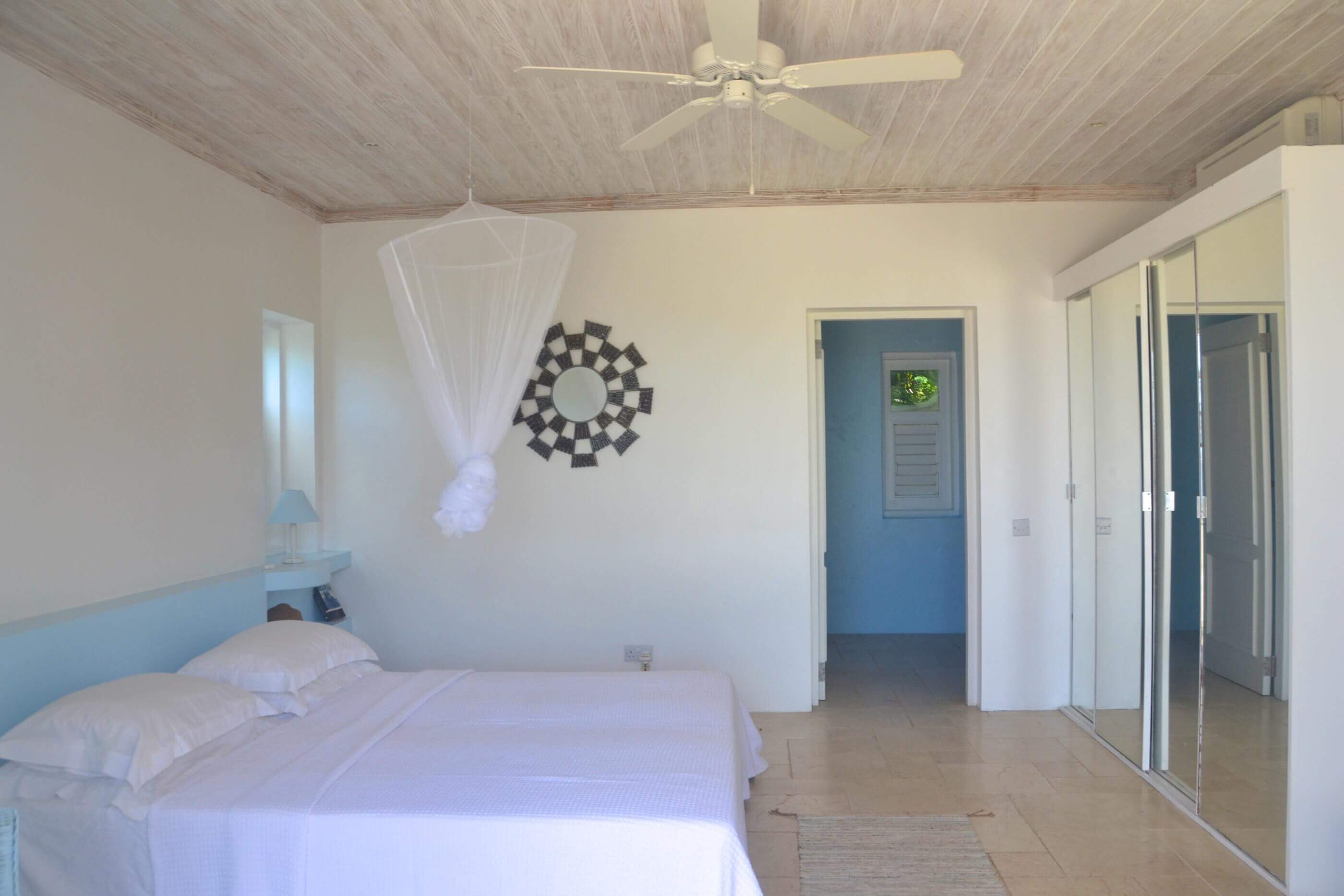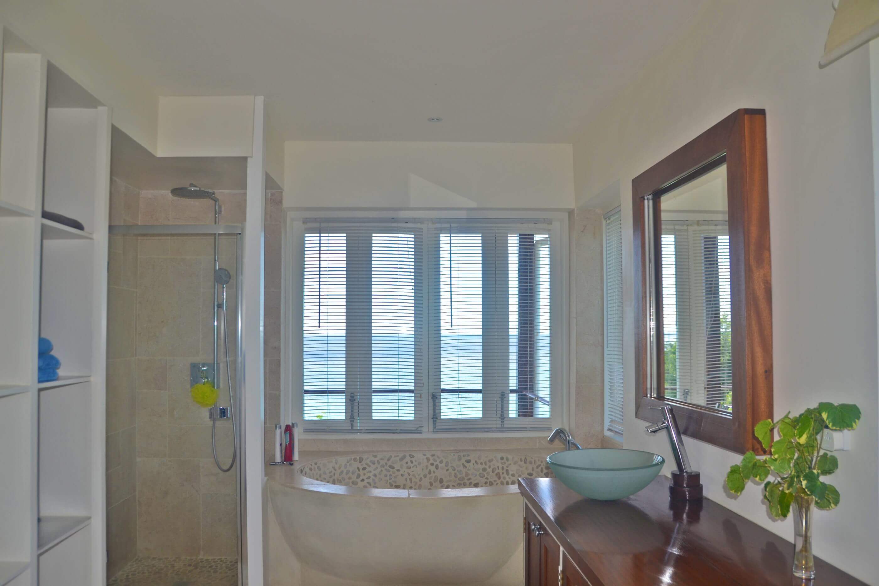 The bedrooms at King House are pure Mustique inspired comfort and elegance. The main house contains the master bedroom on the upper floor, with It's own plunge pool. The lower level contains a guest bedroom with direct access to the swimming pool, and a third bedroom in a separate building off from the kitchen. These 3 bedrooms have private bathroom with sublime waterfront views, a pebble finished bathtub, raised bowl double vanity, lots of storage space for products and natural stone floors. There are a further two bedrooms in a separate wing by the entrance, with a shared central bathroom and direct access to the gazebo & bbq area.
