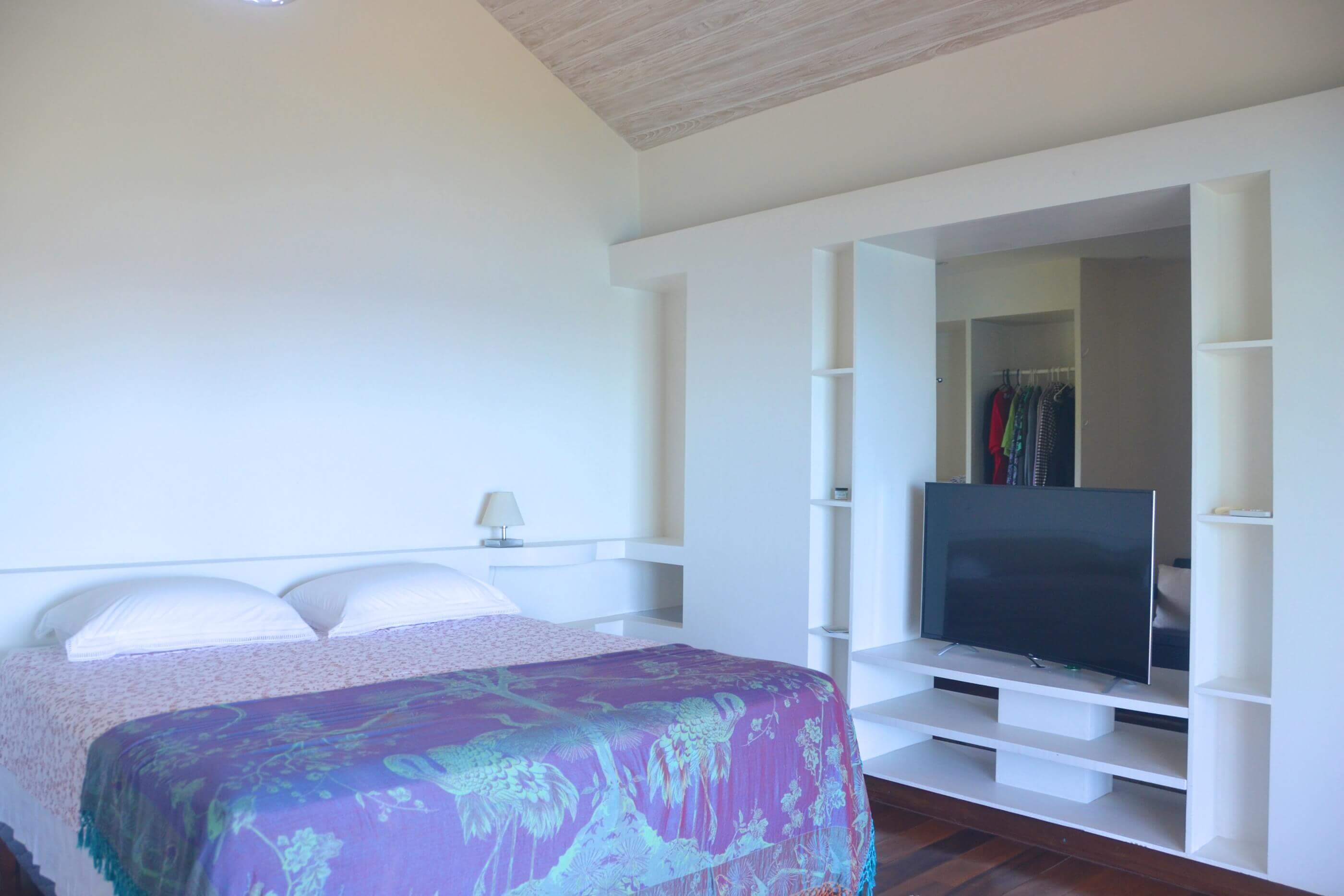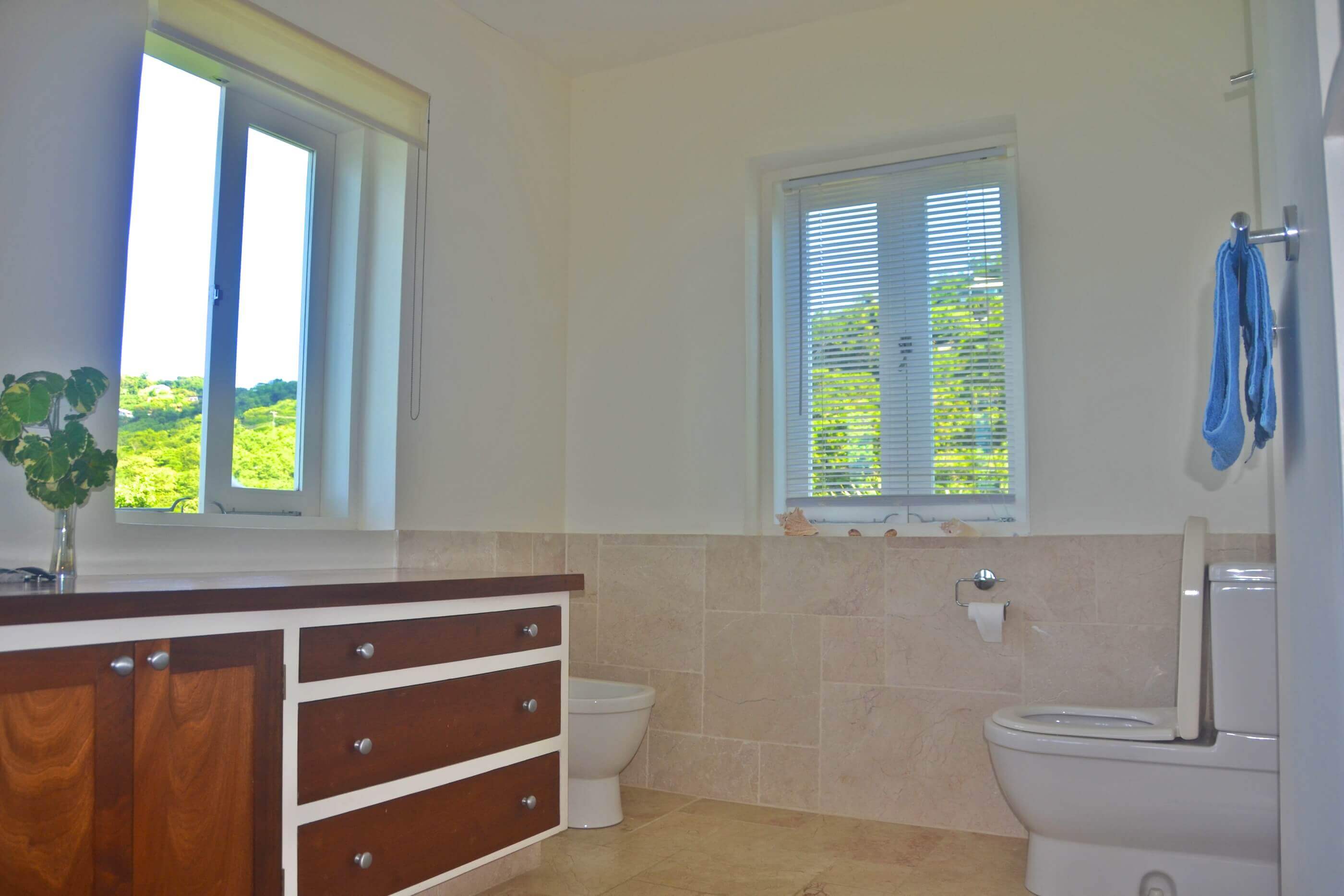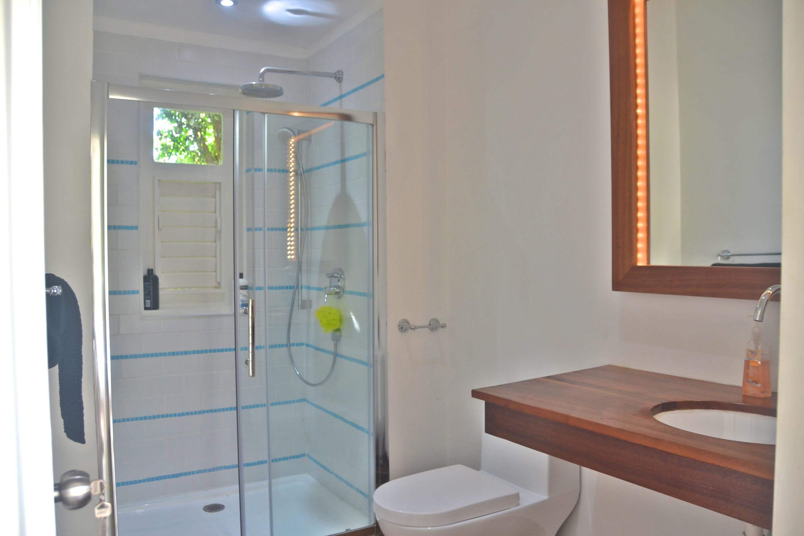 The bedrooms at King House are pure Mustique inspired comfort and elegance. The main house contains the master bedroom on the upper floor, with It's own plunge pool. The lower level contains a guest bedroom with direct access to the swimming pool, and a third bedroom in a separate building off from the kitchen. These 3 bedrooms have private bathroom with sublime waterfront views, a pebble finished bathtub, raised bowl double vanity, lots of storage space for products and natural stone floors. There are a further two bedrooms in a separate wing by the entrance, with a shared central bathroom and direct access to the gazebo & bbq area.