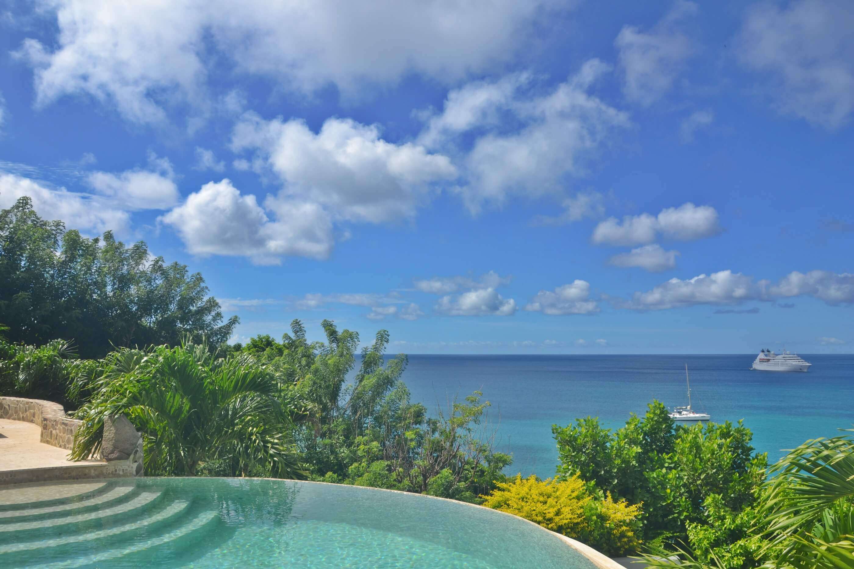 King House sits on a small headland cliff top above Admiralty Bay, one of the worlds most beautiful natural harbours. Polished hardwood floors, white on white interior basics and plush, comfortable sofas generate an easy open plan living space that faces out to the spectacular vistas and natural stone exterior terraces that surround the residence.