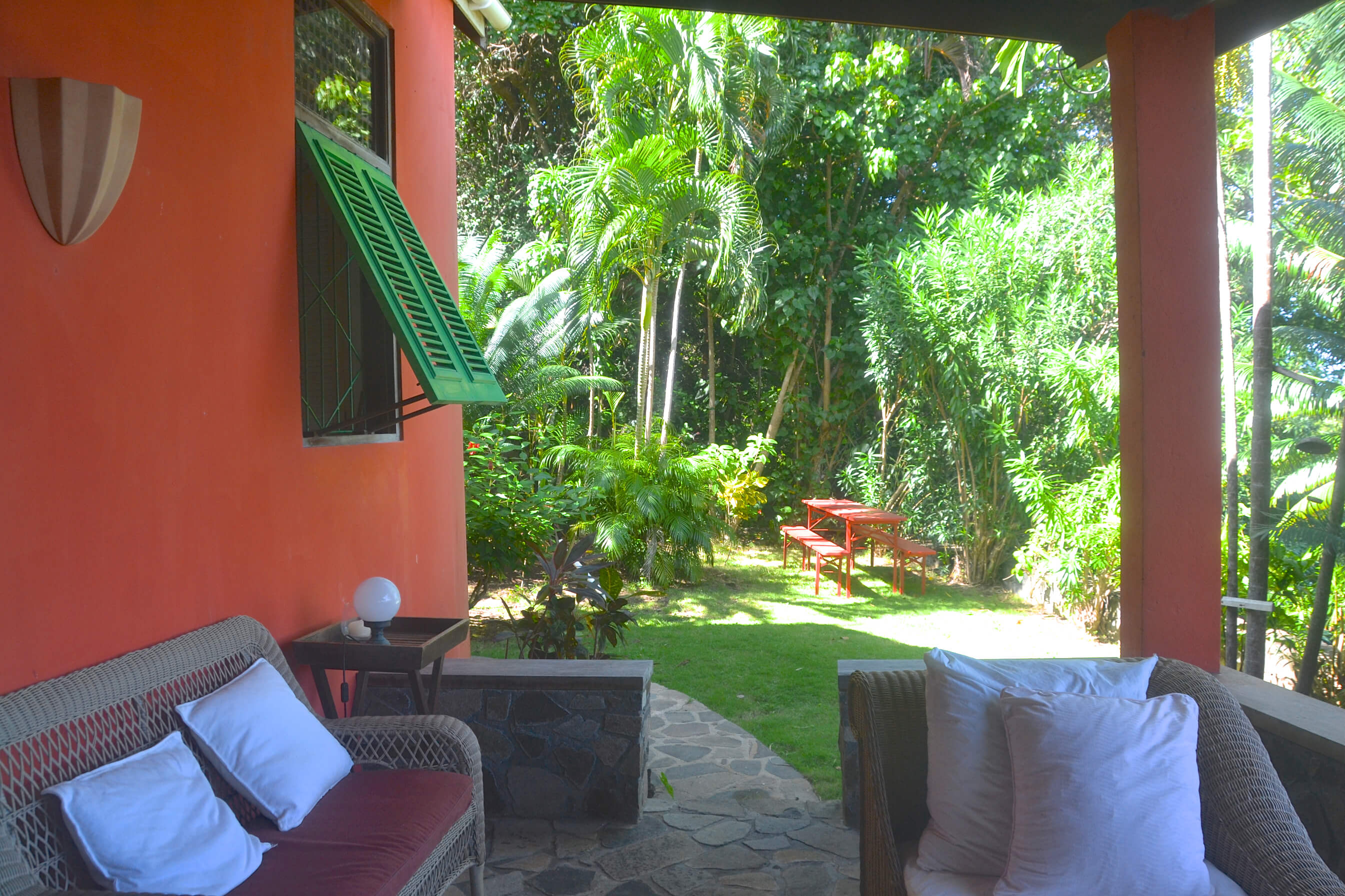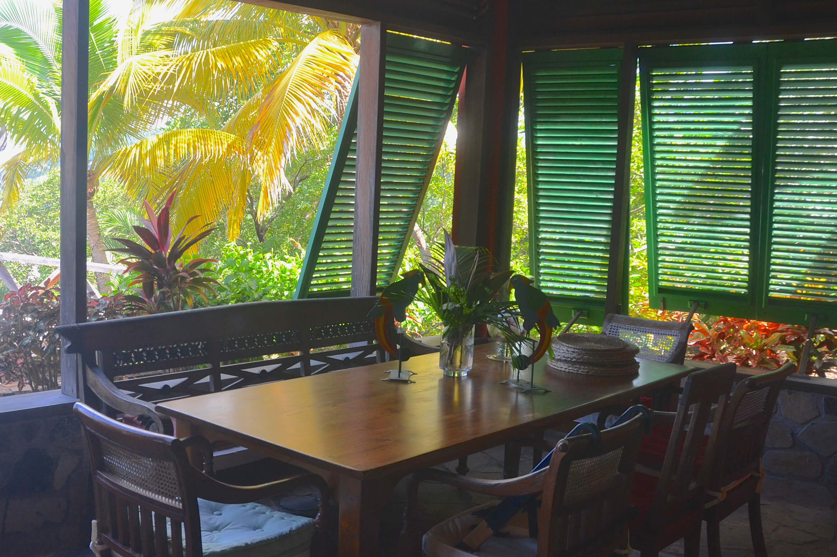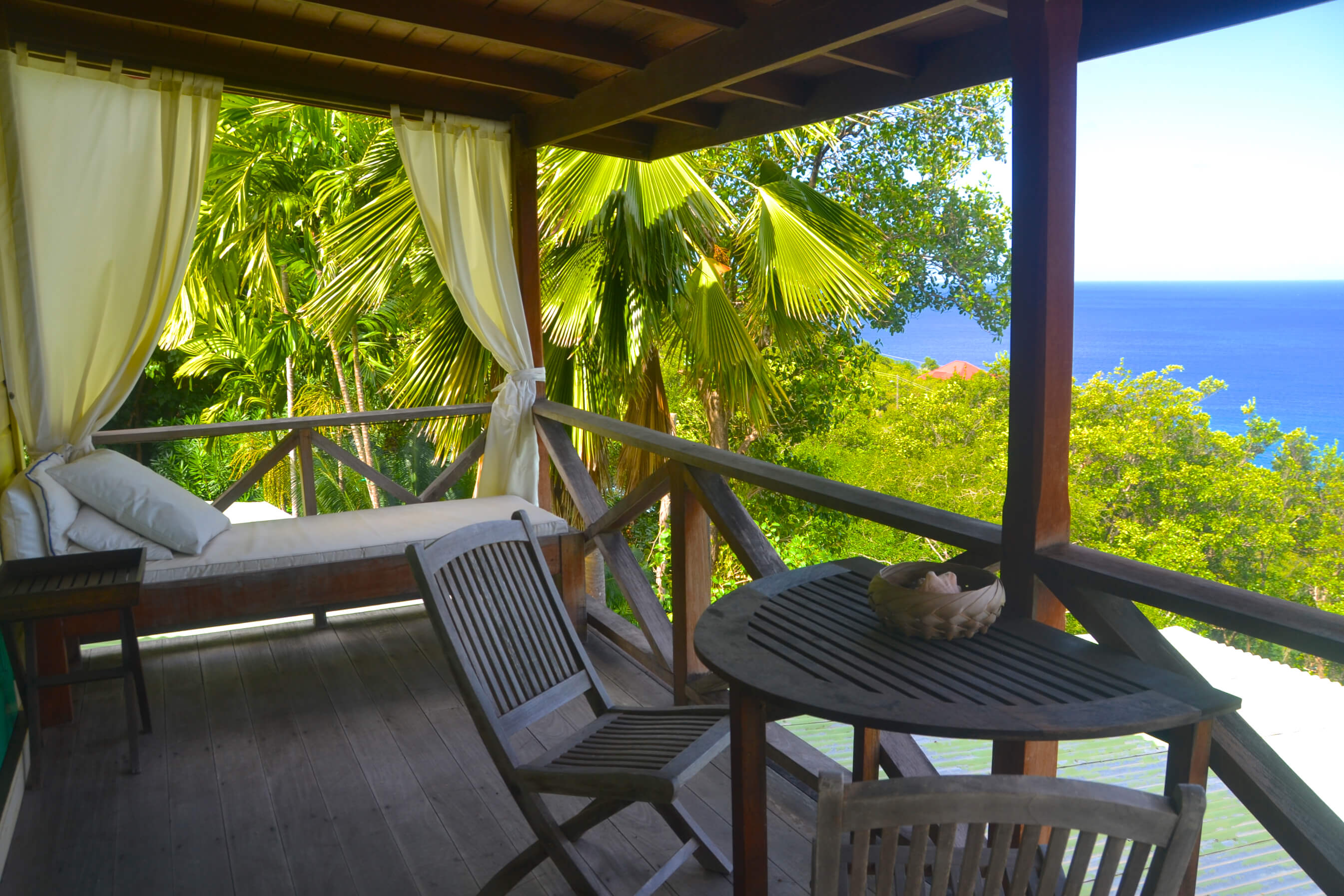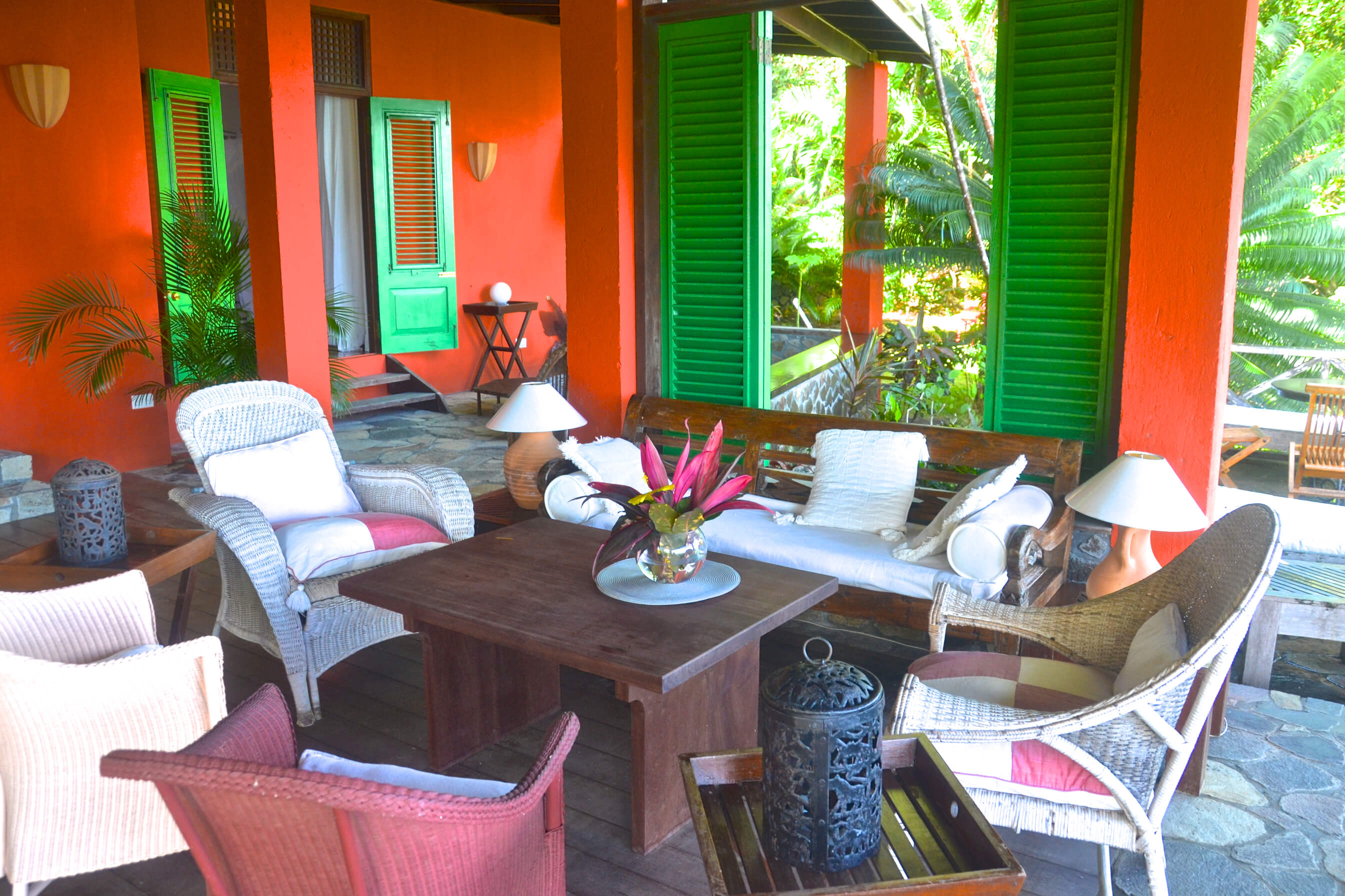 The very heart of Lime Tree Villa is a vast stone and wooden veranda. This is a spacious cool and comfortable area for relaxation, with plenty of chairs, sofas and cushions to your heart's content! Various seating areas around the veranda and surrounding lush gardens mean you can always find the perfect spot to relax and read a book whilst taking in these special ocean views.