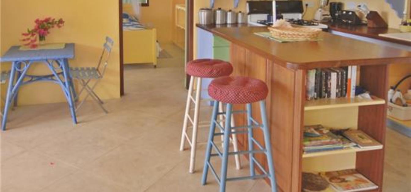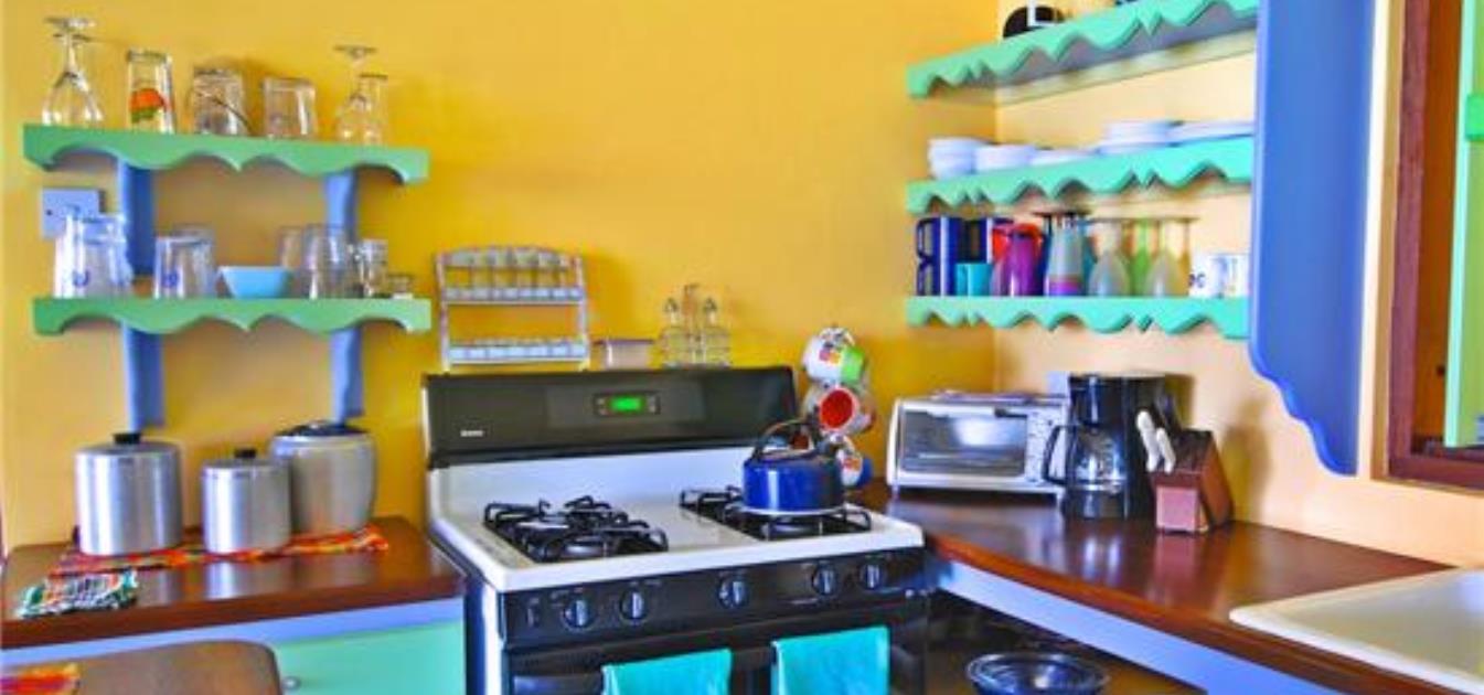 Sweet Mango has a fully equipped kitchen for enjoying home cooking and dining, with all usual appliances including a large ice-making refrigerator and full sized four-burner stove with oven. There is a coffee maker, microwave, and toaster along with a full complement of cookware, plates, glasses and utensils. The kitchen features a hardwood island with cushioned stools for early morning coffee.