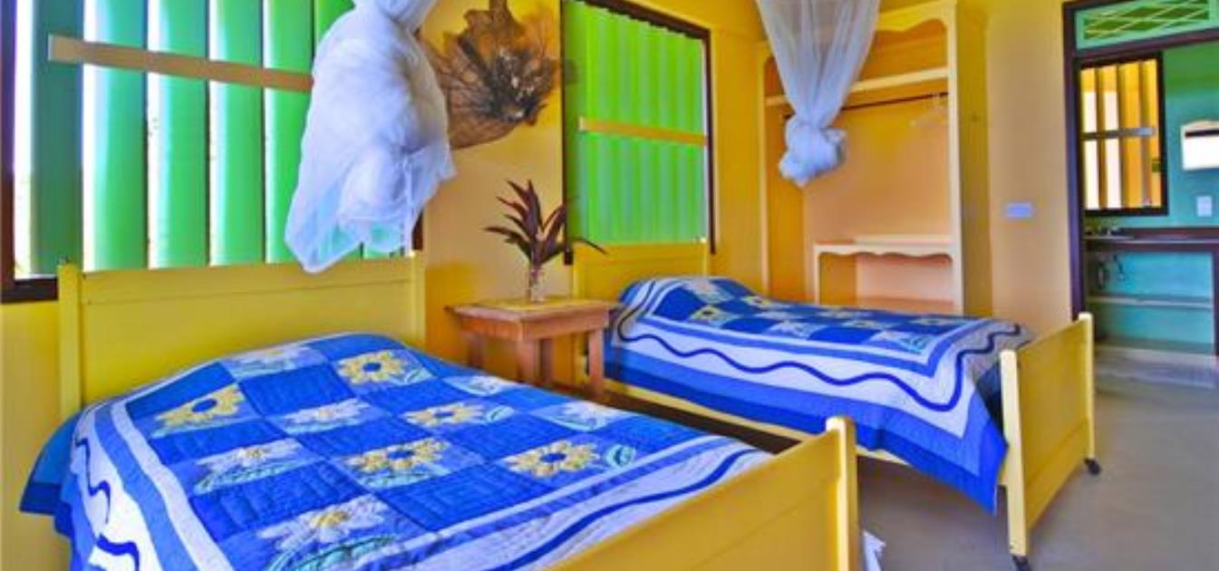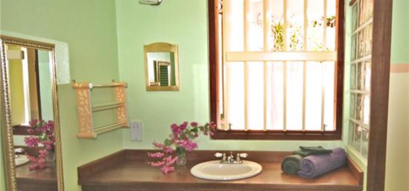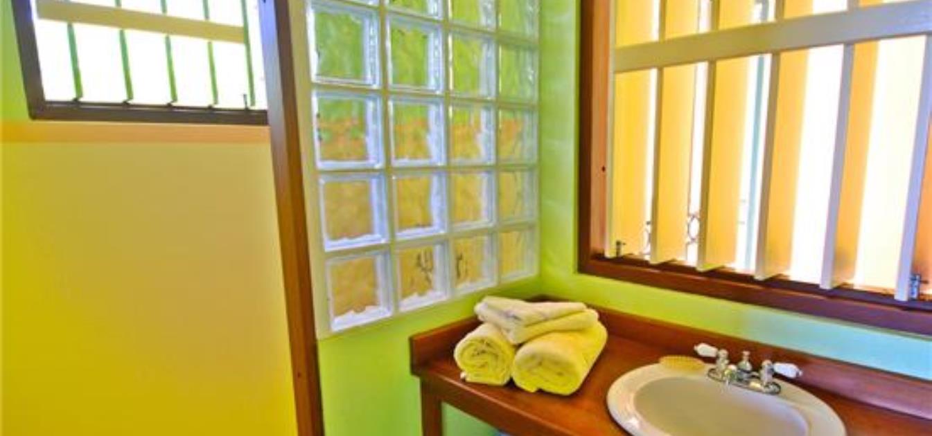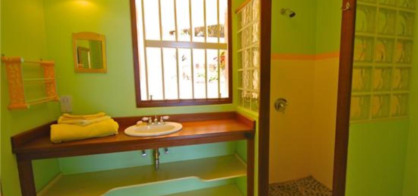 In keeping with the rest of the property, the two bedrooms are decorated in fresh, bright colours with ample closet space. The master bedroom has a queen bed and an extra daybed suitable for a child. The second bedroom contains twin beds. Both rooms have lovely large en suite bathrooms, with hardwood counters, and a large glass brick shower.