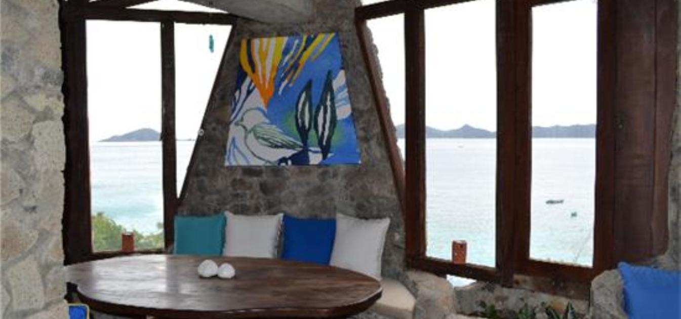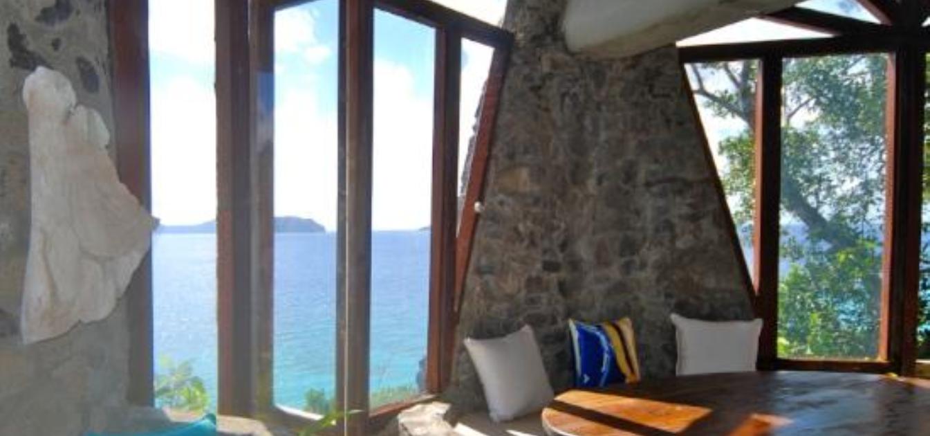 An unusual, charming and curvaceous 3 bedroom villa built from the local stone of Bequia and overlooking the ocean with stunning views and sunsets. Well maintained and recently fitted with new solar lighting, recharging outlets and refrigerator. Just steps above Moonhole beach.