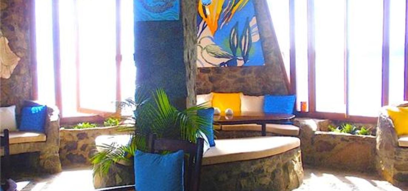 The top level offers an open plan living and dining space with delightful local carved table tops and curved window seats which opens out onto a glorious breezy sun deck furnished with hammock and chairs.