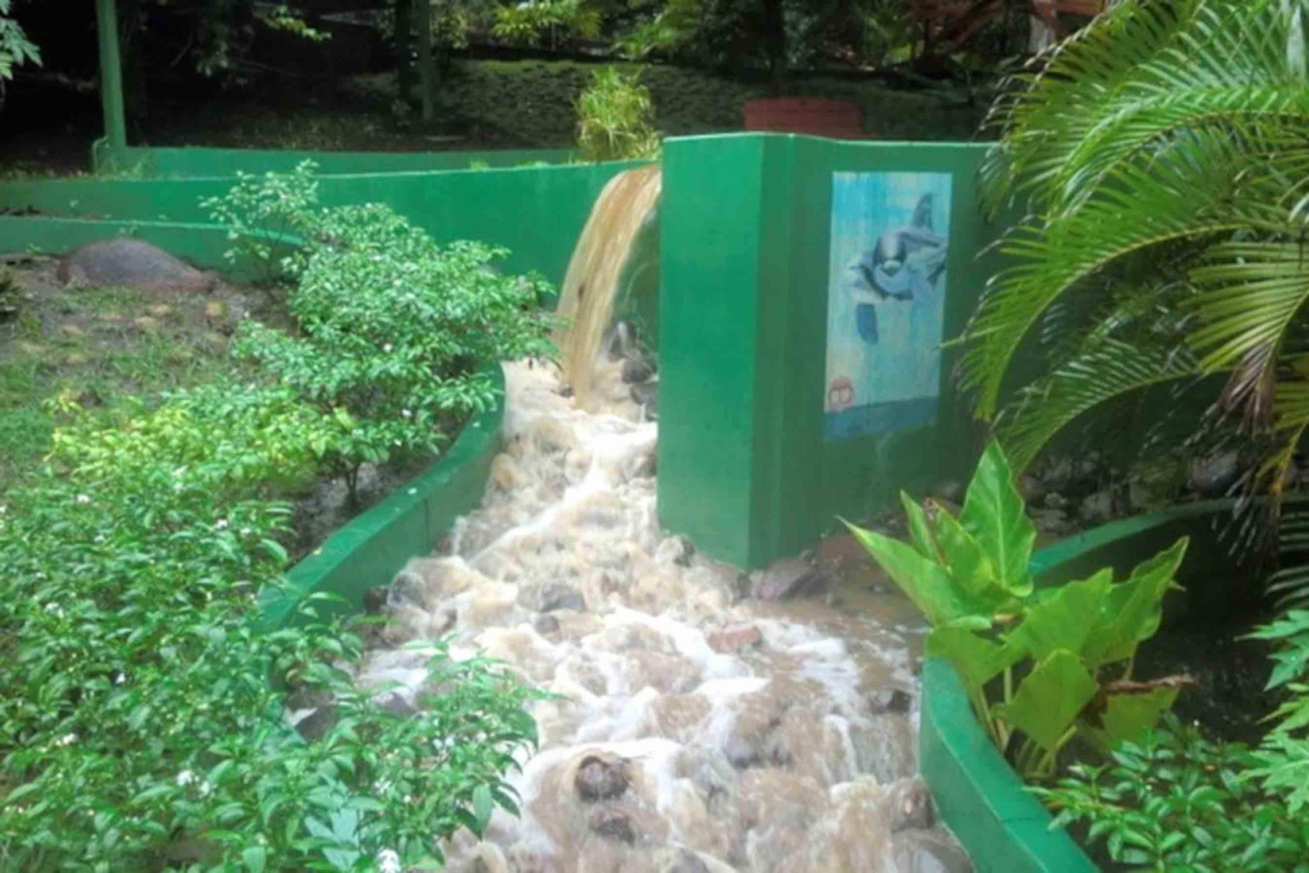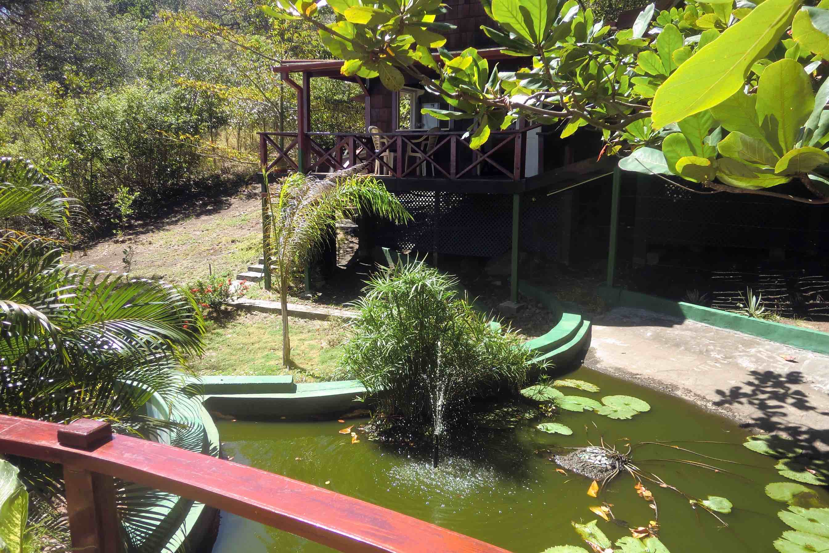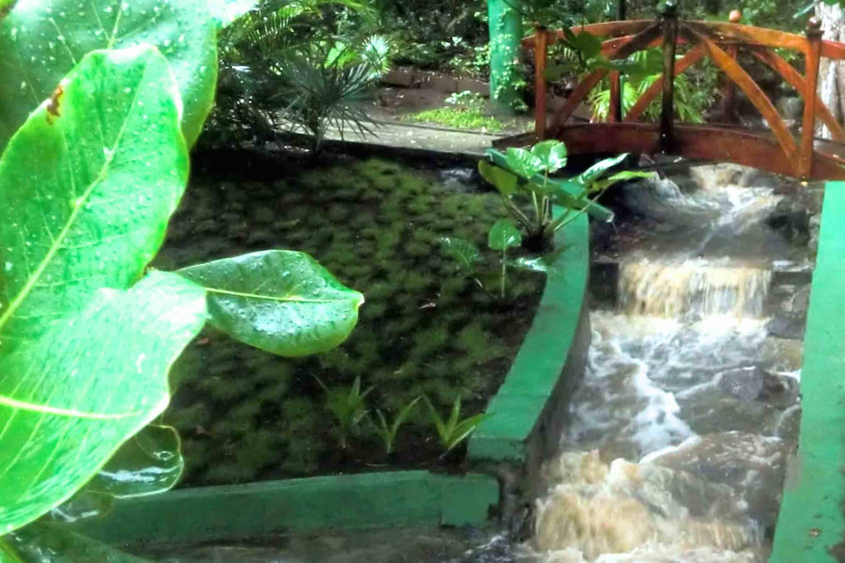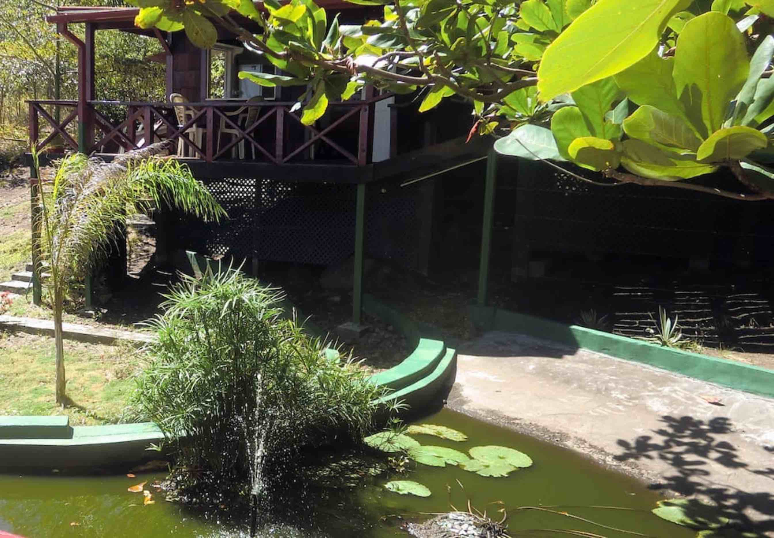 A fishpond with trickling fountain and waterfall adds to the ambiance. The many small guppy and larger koi fish in the pond also help to keep the surrounding area free from Mosquitoes.
