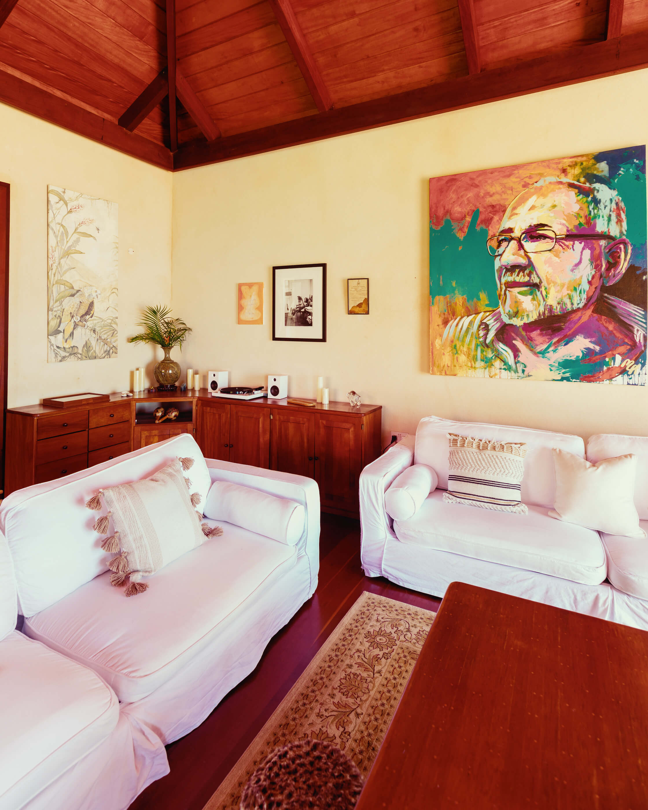 The living room is cool and beautifully furnished by the Italian and French interior designers who managed to mix their continental style with a Caribbean finish. There is satellite TV and Video, DVD, internet, telephone and fax providing all the modern amenities connecting you to the rest of the world whilst this beautiful villa preserves your privacy and escape. The expansive luxurious white sofas stretch around the living room for your total relaxation whilst the tall vaulted ceilings maintain a cool and serene atmosphere.