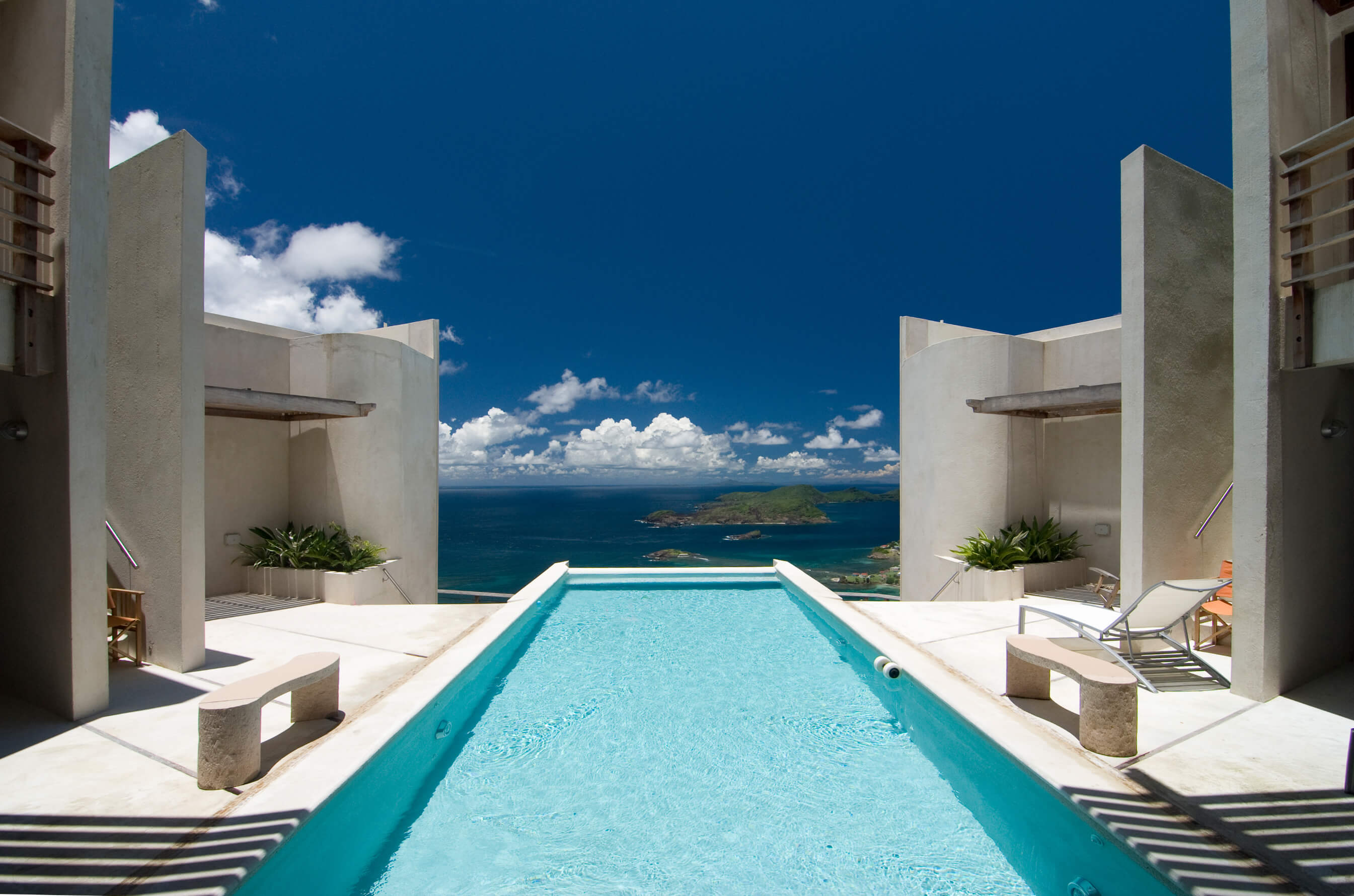 Based on the Moorish principle of using water as a central feature, most of the rooms lead directly off the elegant pool, making Mangwana spacious, cool and airy yet surprisingly intimate. Looking south from a height of 600 ft down over the jewel-like southern Grenadines, the pool has simply amazing views all around.
