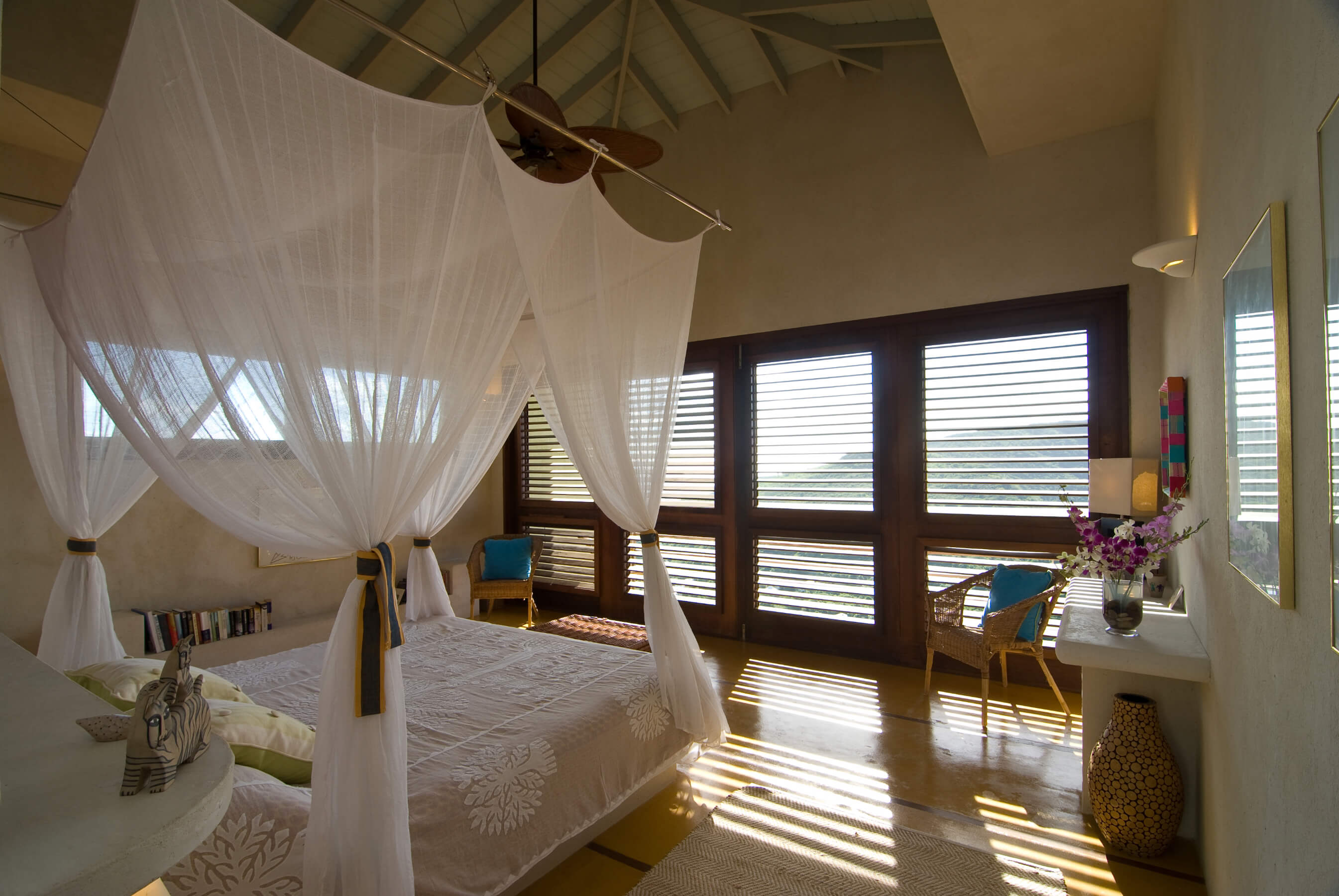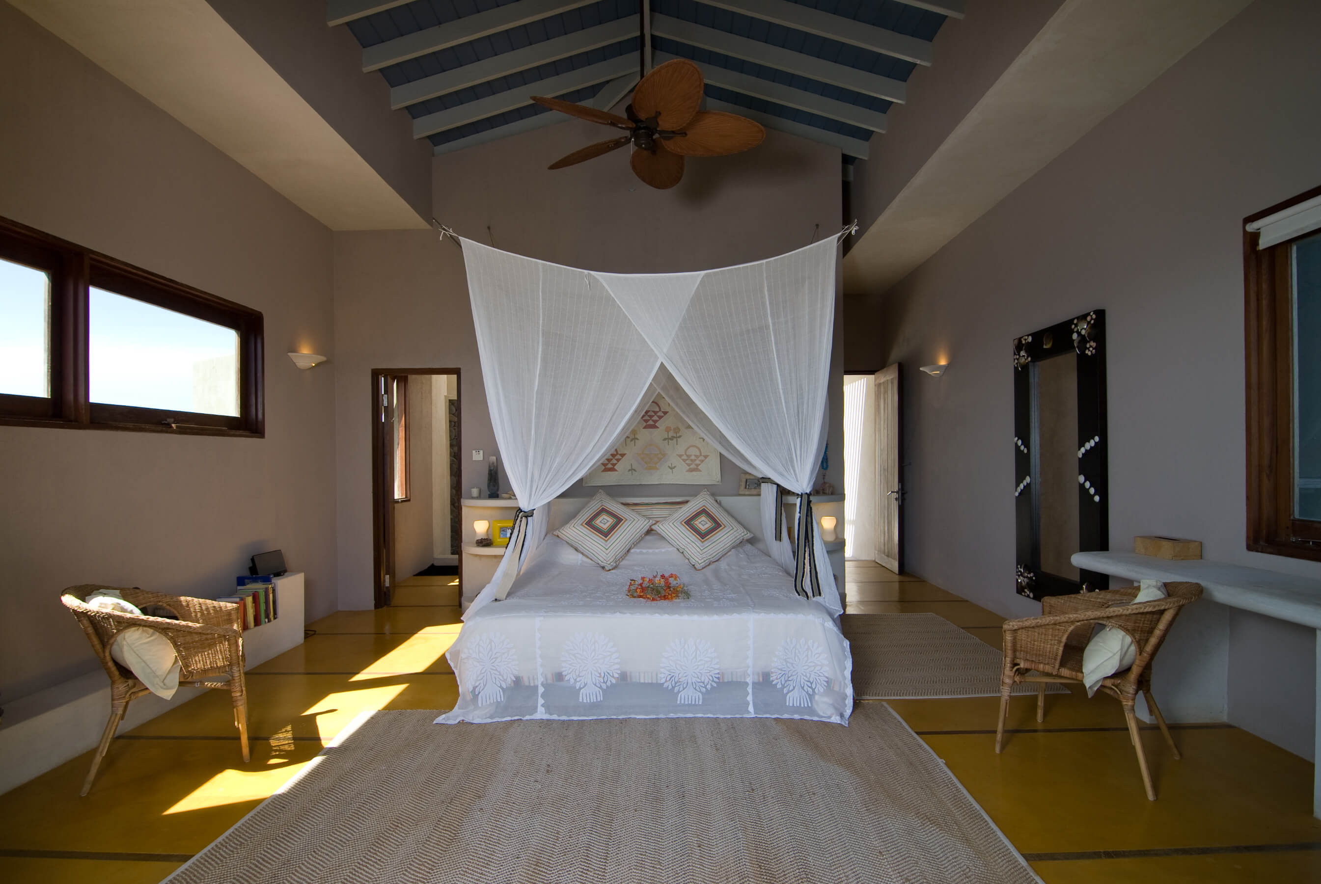 Mangwana's six cool and breezy bedrooms are large and versatile. Two have king-sized beds whilst the remaining four have twin beds, all of the twins can be locked together as doubles. Five of the six bedrooms have their own en suite bathrooms; two of them open up to the night skies. All bedrooms have their own private balcony, some overlooking the pool, others looking outwards over the ever-changing seascape.