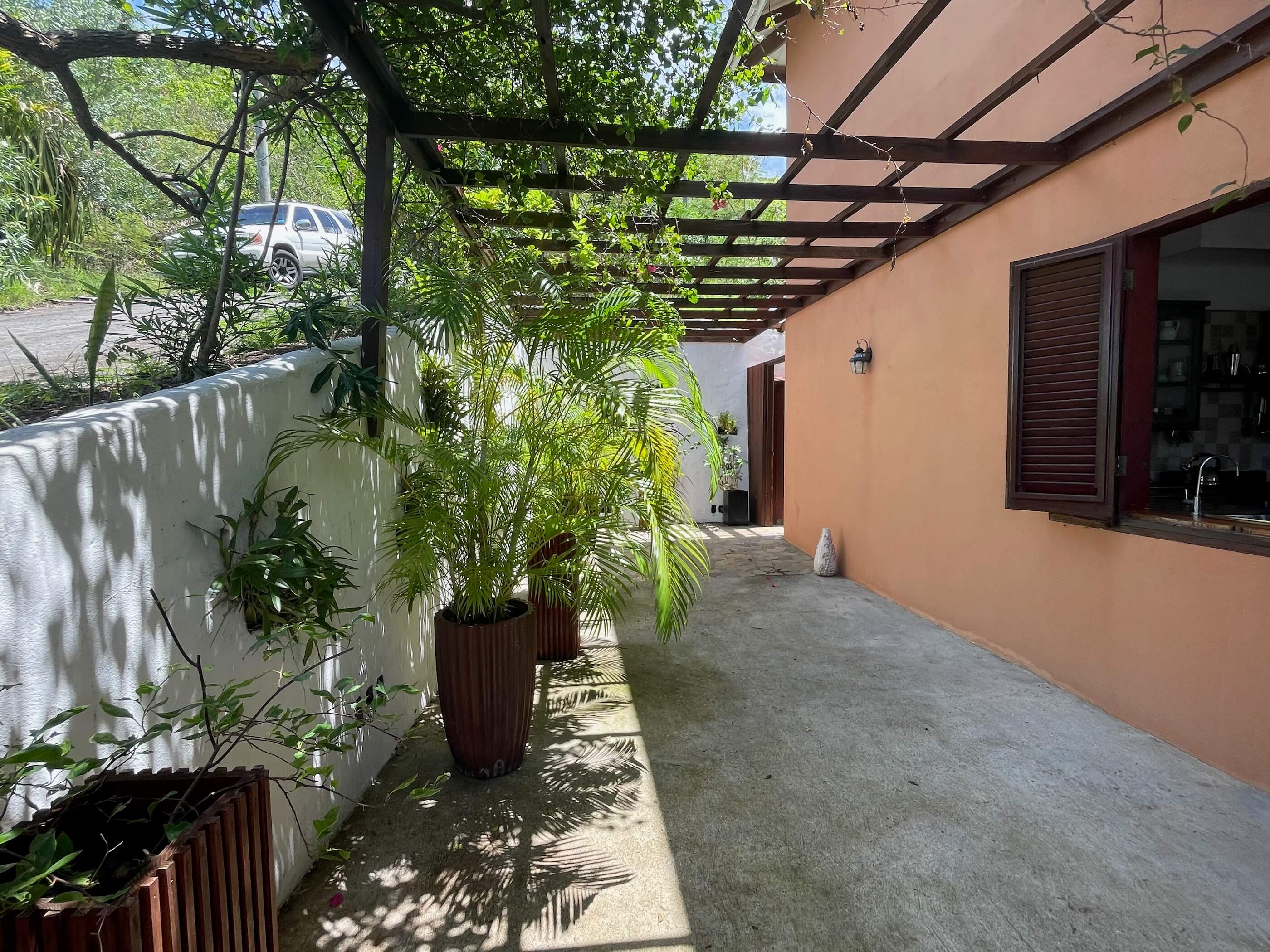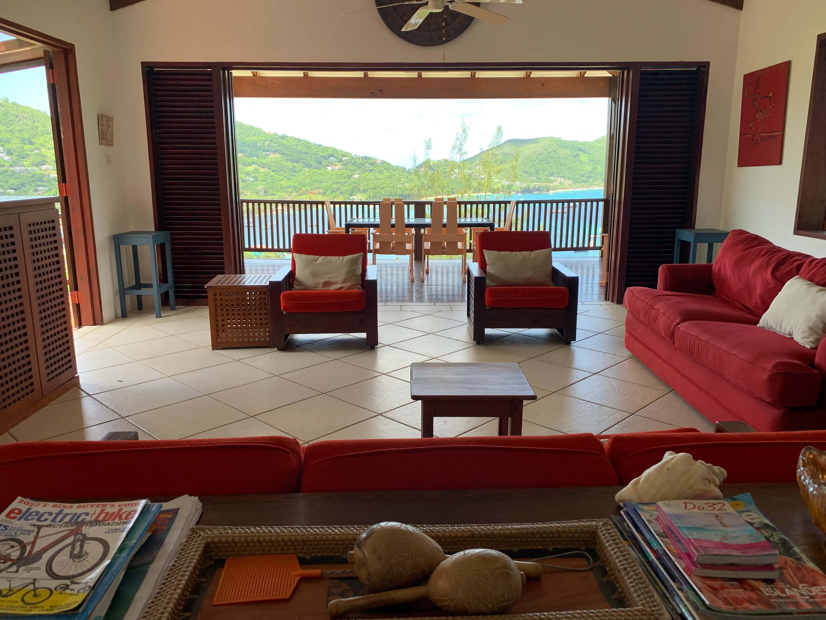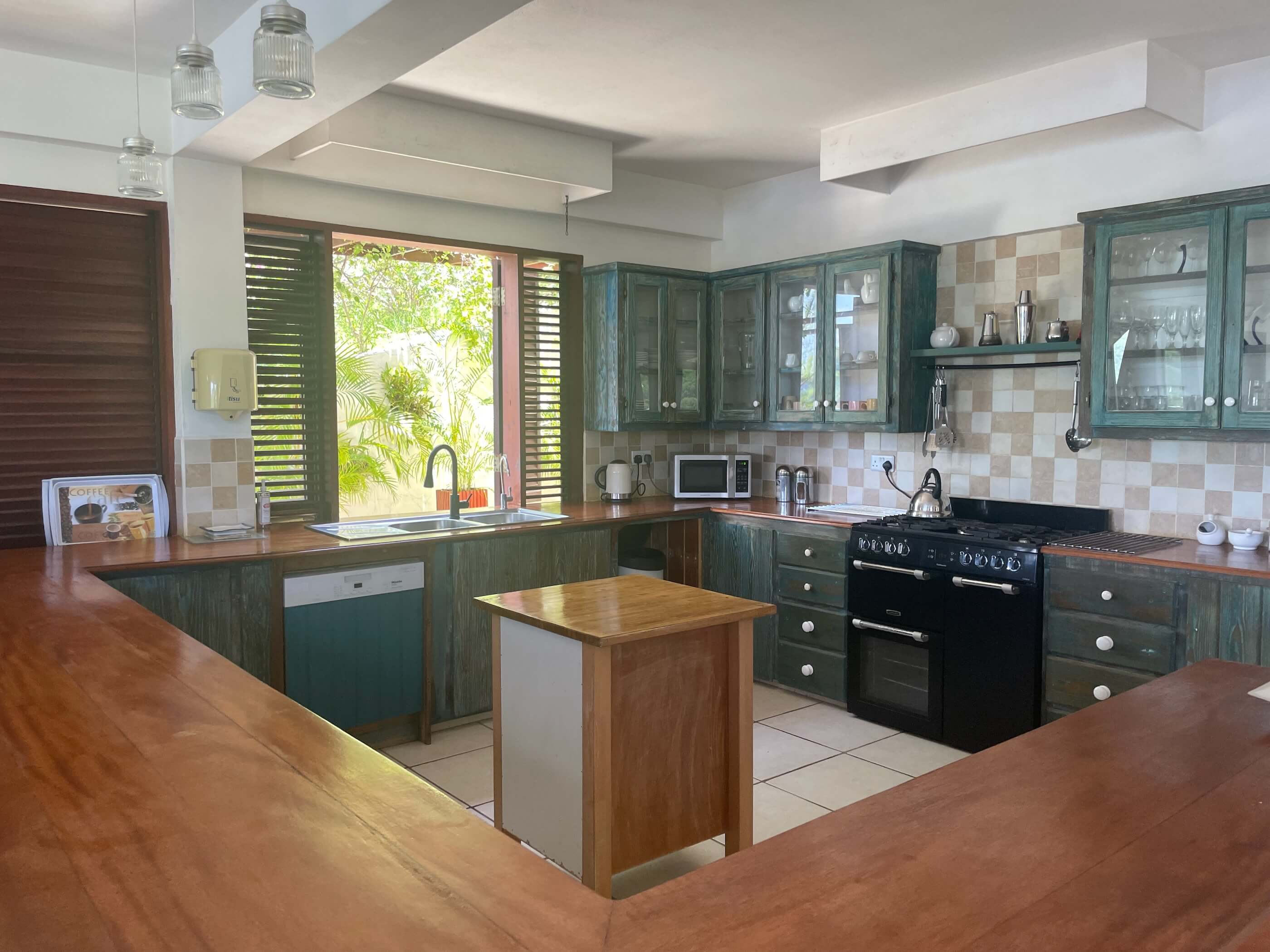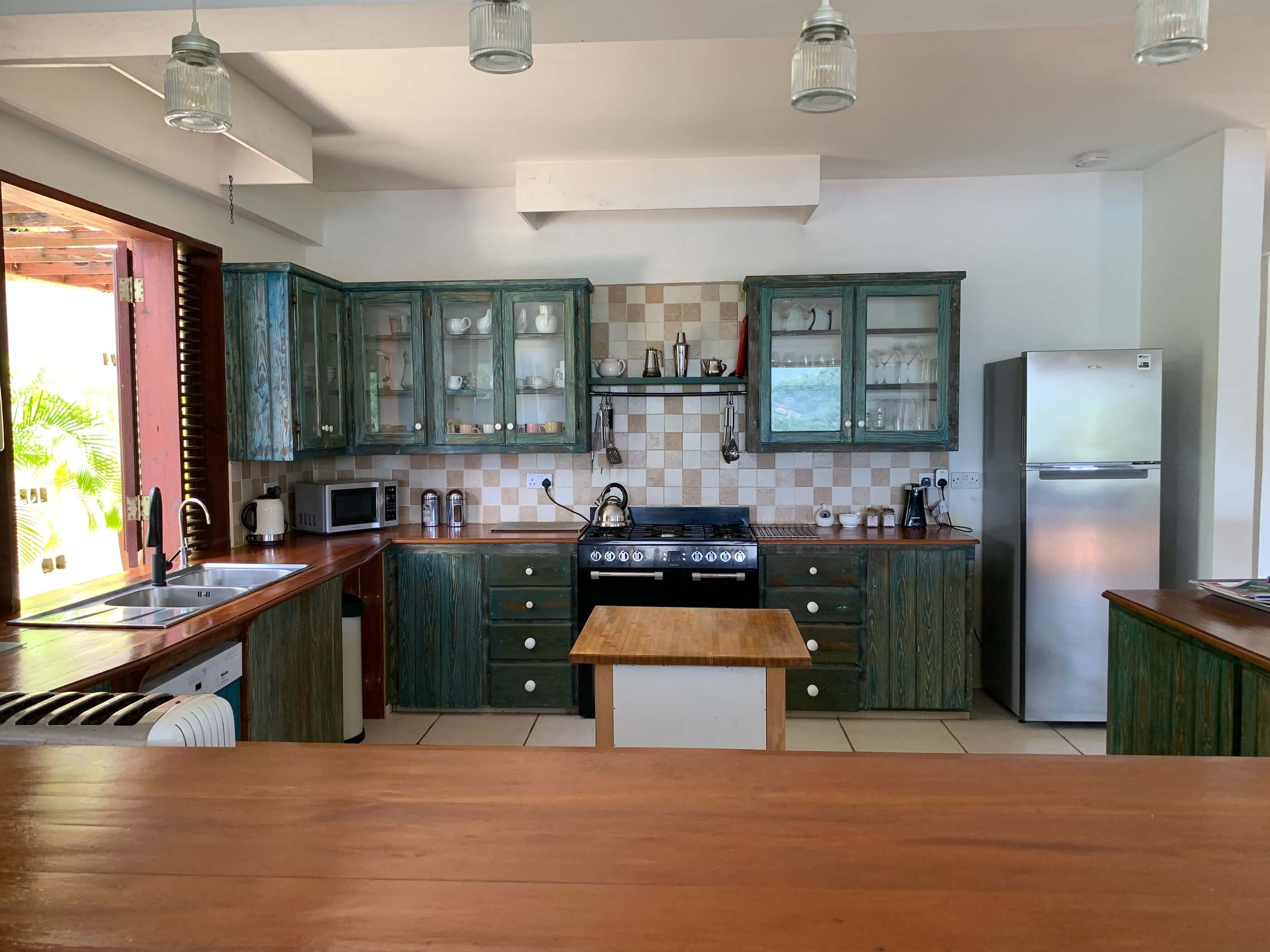 The massive kitchen has wooden countertops, a US style fridge and plenty of space for food preparation. Sublime harbour views can be glimpsed via the refreshing louvred windows and the temperature remains cool via the light, tiled floors and high ceilings. All the windows and doors can be thrown open to introduce further refreshment via the constant trade winds that embrace the island. A breezy hillside location and all the wooden louvre windows & doors always letting air in means air con is not required.