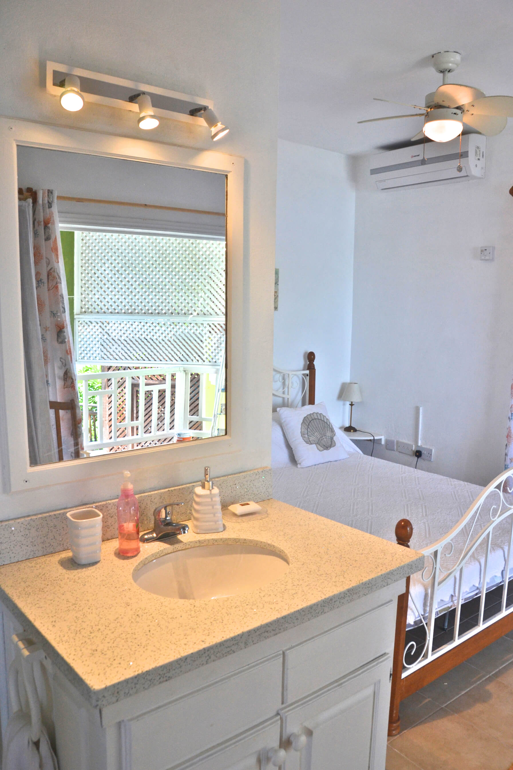 The studio has one comfortable queen sized bed, and faces big double doors that open out onto the balcony. From here you can look out at the beautiful Bequia views over Princess Margaret Beach. The bedroom is air conditioned. Please note no TV here but wifi internet is provided.