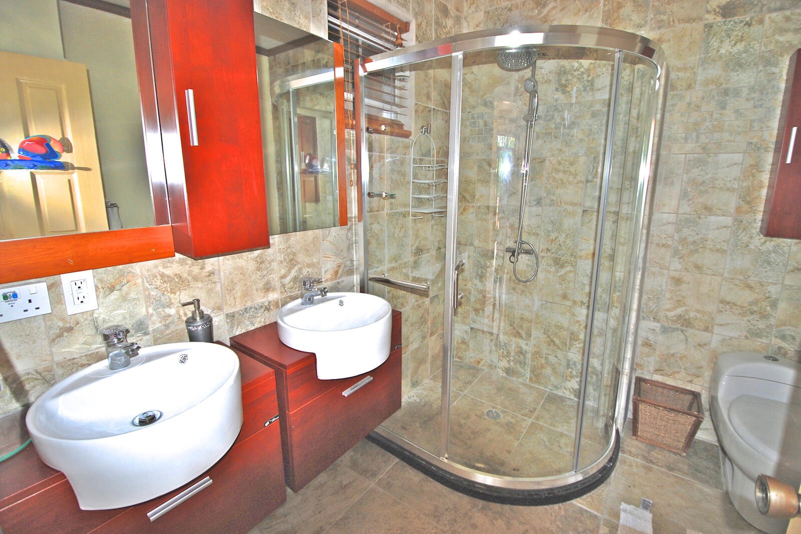 Princess Hill Villa provides a cool, comfortable environment for up to six guests. There is a queen sized bed in the master bedroom and the second pool level bedroom and a king sized bed in the lower level suite. Single beds for children in the second bedroom are available on request. All bedrooms are air conditioned. Each has a private bathroom and the upper level master bedroom has direct access to the pool area: perfect for a pre-breakfast dip.