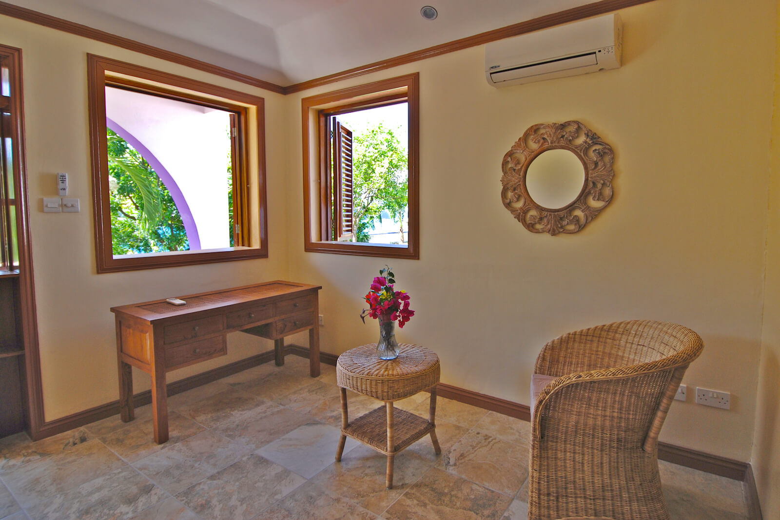 Downstairs there is a bedroom/bathroom suite with twin sinks and a small frig. It has an open plan studio look with a covered porch facing the tropical gardens. This ground floor level offers additional privacy and was recently renovated throughout, with hand made wooden shutters and attractively tiled floors.