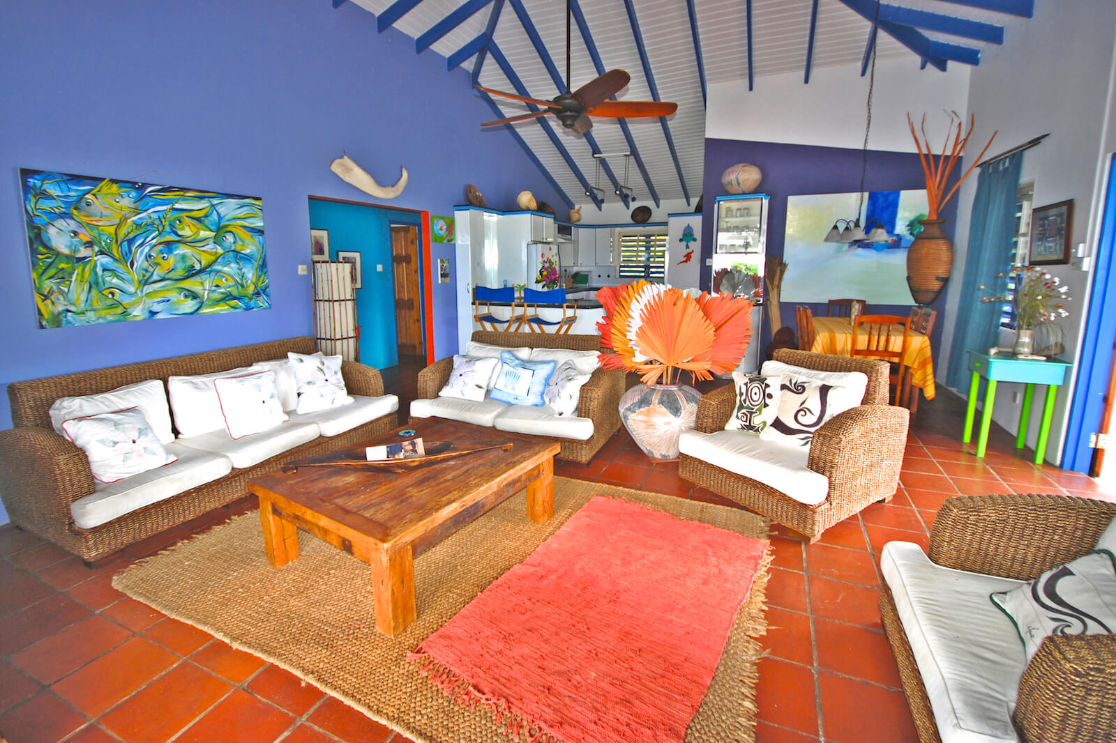 The interior styling of Princess Hill Villa offers a comfortable mix of chunky, rattan and wooden furniture and soft, earthy colours. The floors have been tiled throughout and the ceilings are high, which maintains a cool atmosphere throughout. Vented doors and a roof cupola enhance the natural air flow.