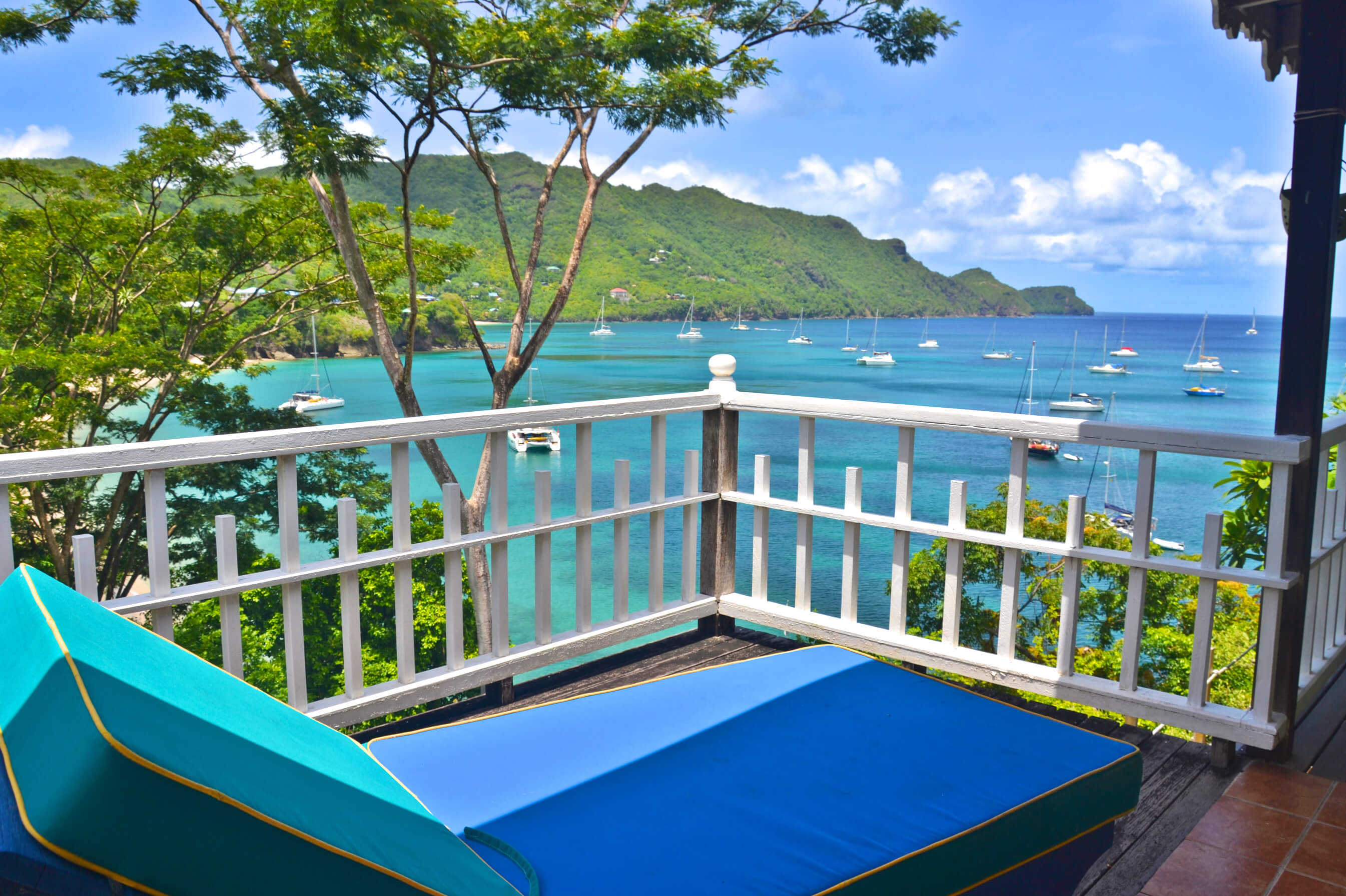 The living / dining / kitchen areas are all open plan and comfortable, with plenty of seating, a tv and board games to keep you entertained, after a hard day of Bequia exploring! Large double doors open up from the living area onto a large balcony with daybed and simply stunning views out over the bay.