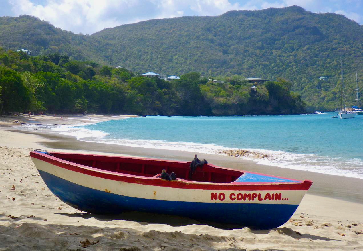 This is a favourite beach for visiting yachts and has a great convivial atmosphere. Gorgeous, deep coral sand beach. Excellent swimming. Beautiful trees for shade... There's even a cave to explore! Now with a spectacular beach restaurant. Best reached either by water, there is a pretty wooden jetty for a dinghy to the harbour, or via the Belmont Walkway Coastal Path from Port Elizabeth. Above and behind the beach a handful of special houses nestle amongst the trees or on the headland. brightly painted hand made boats rest in the shade of palms and sea grape.