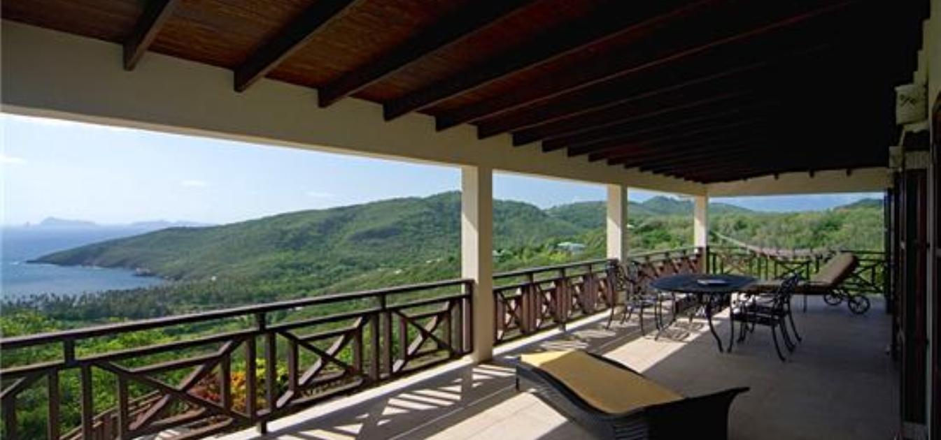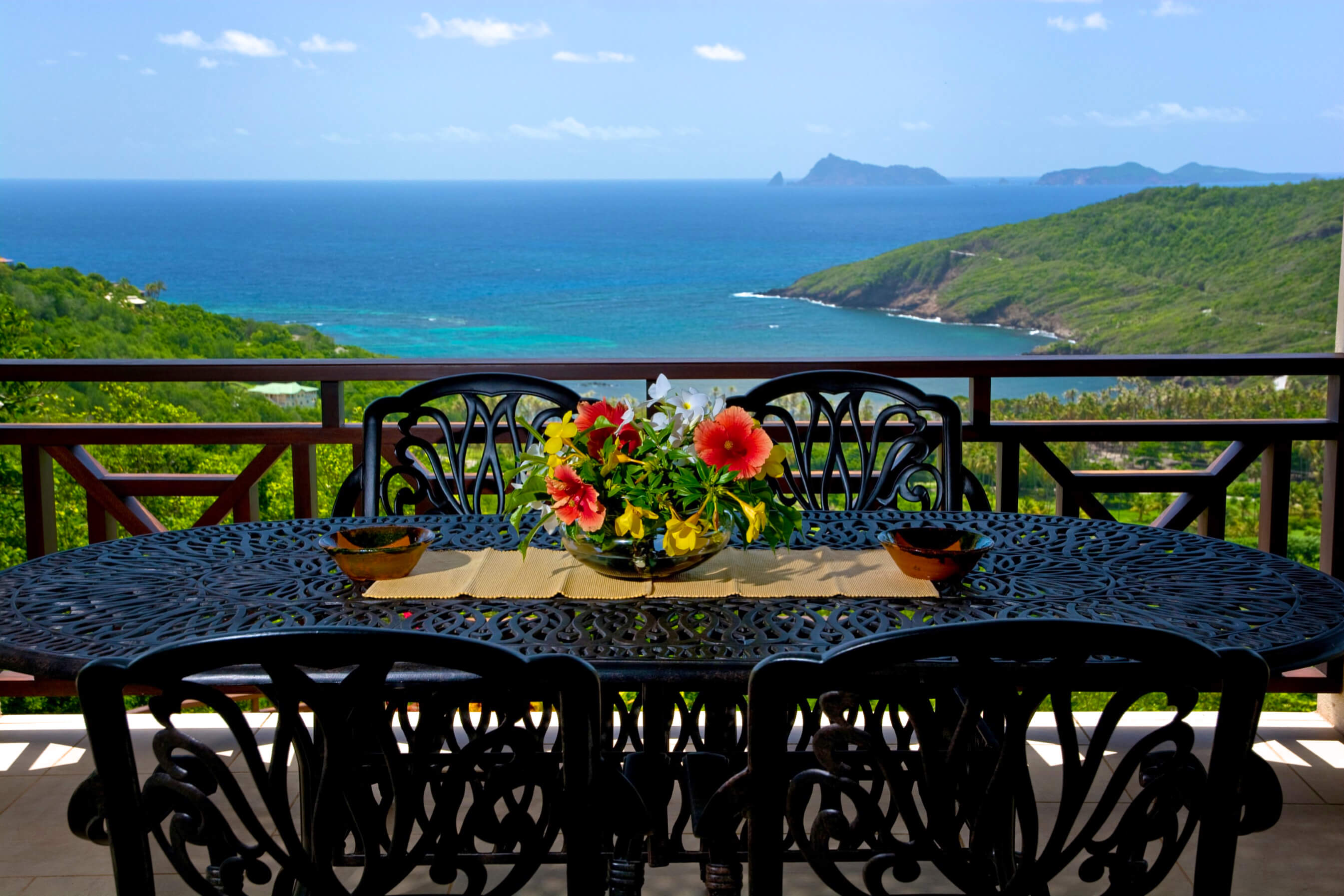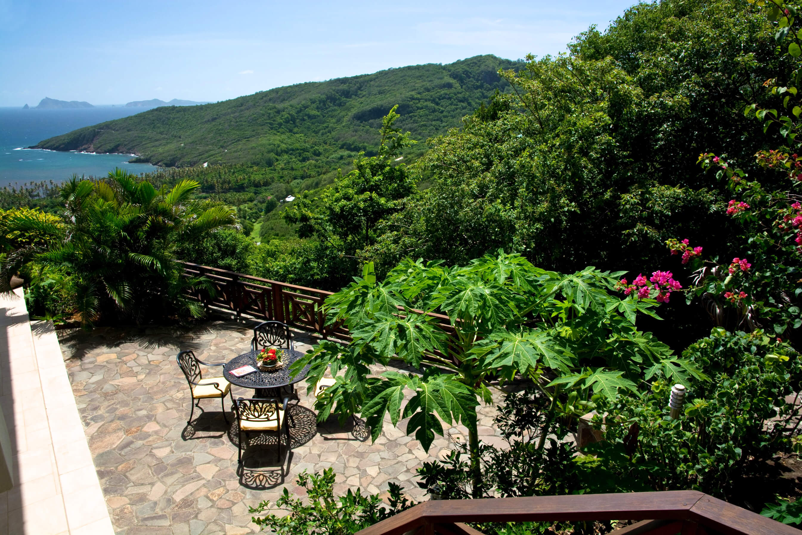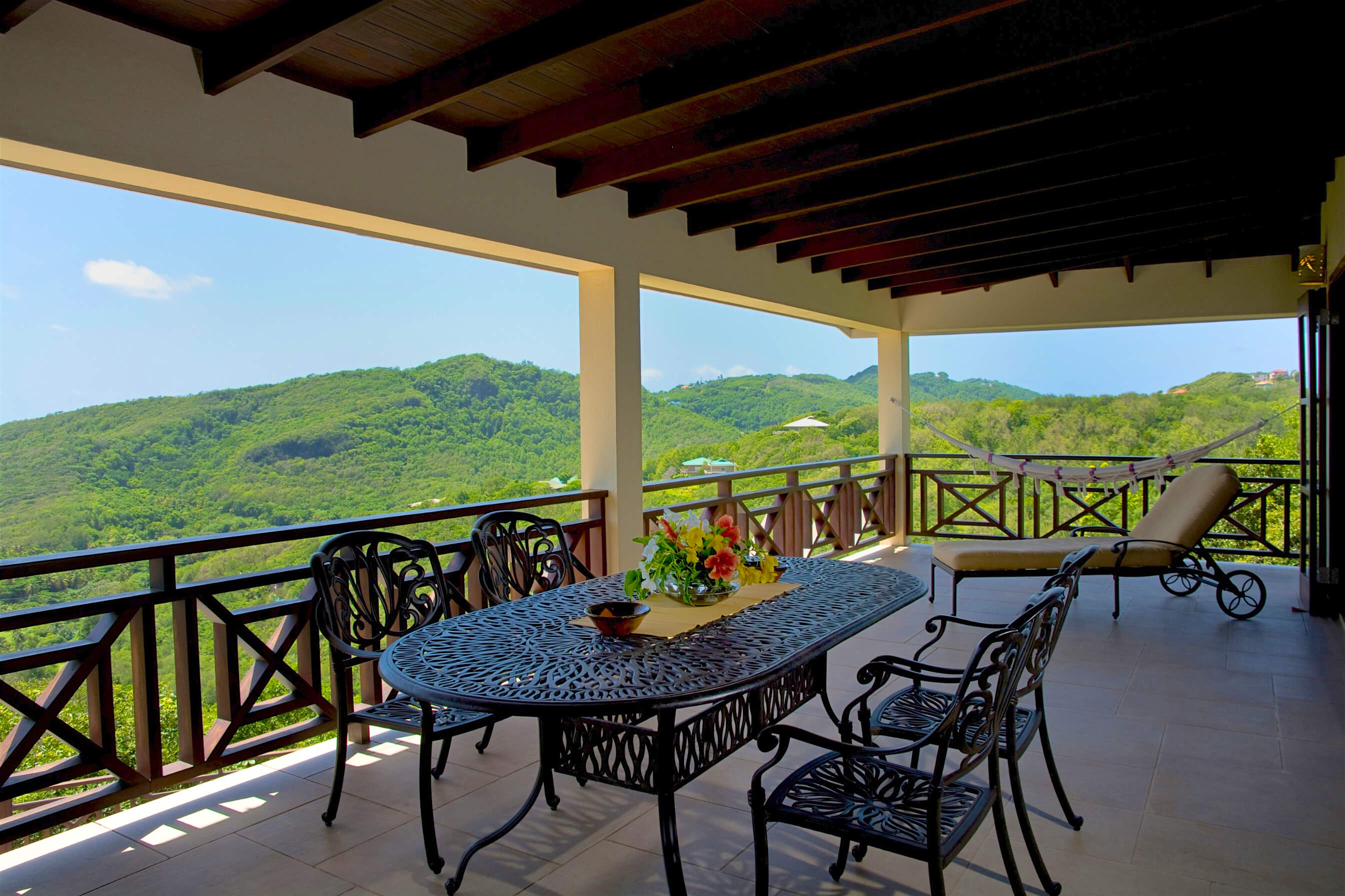Bellevue Terrasse is set up high overlooking the lush green tree-covered canopy beneath which leads out to the beautiful blue ocean and onto Spring Bay beyond. The islands of Battowia and Baliceaux are to be seen on the horizon.