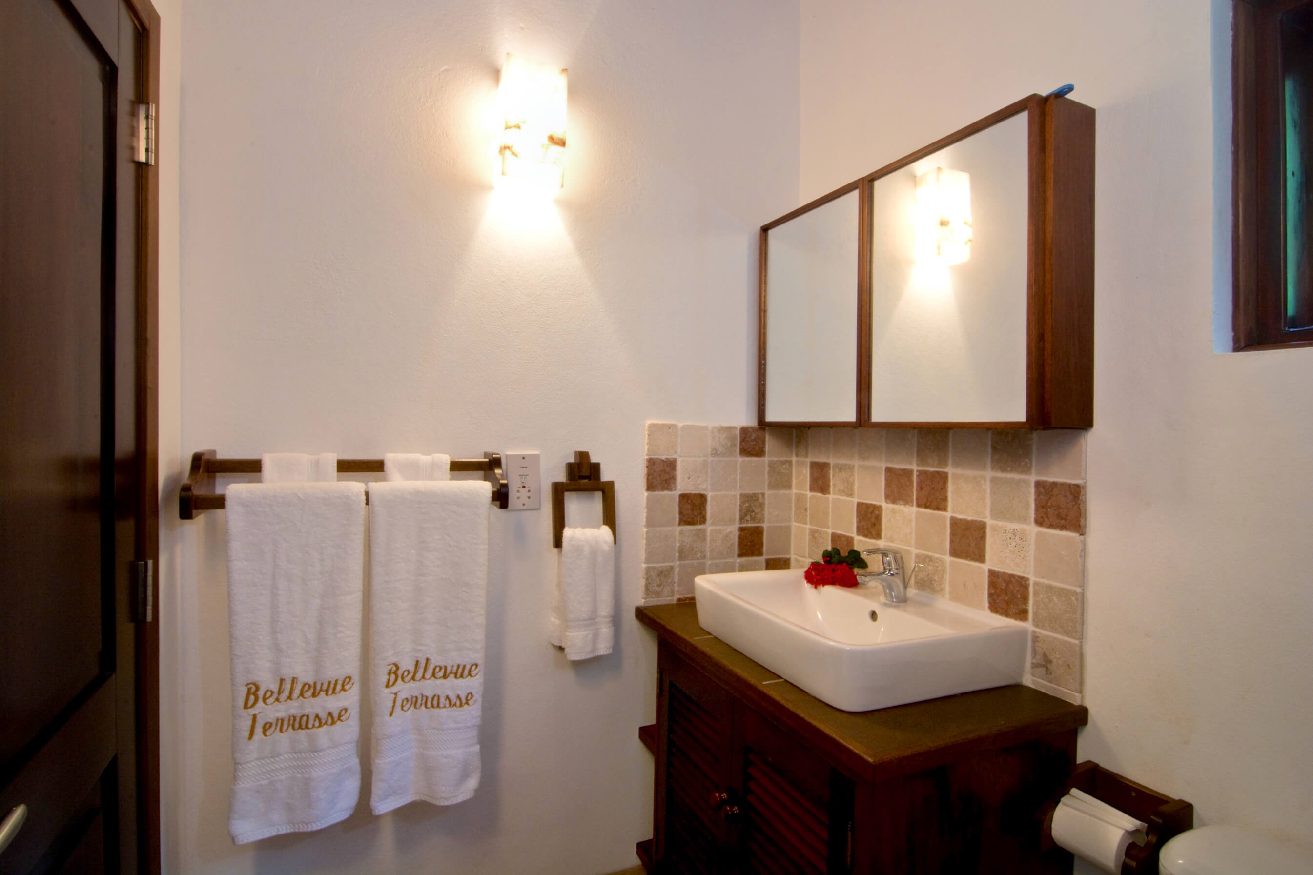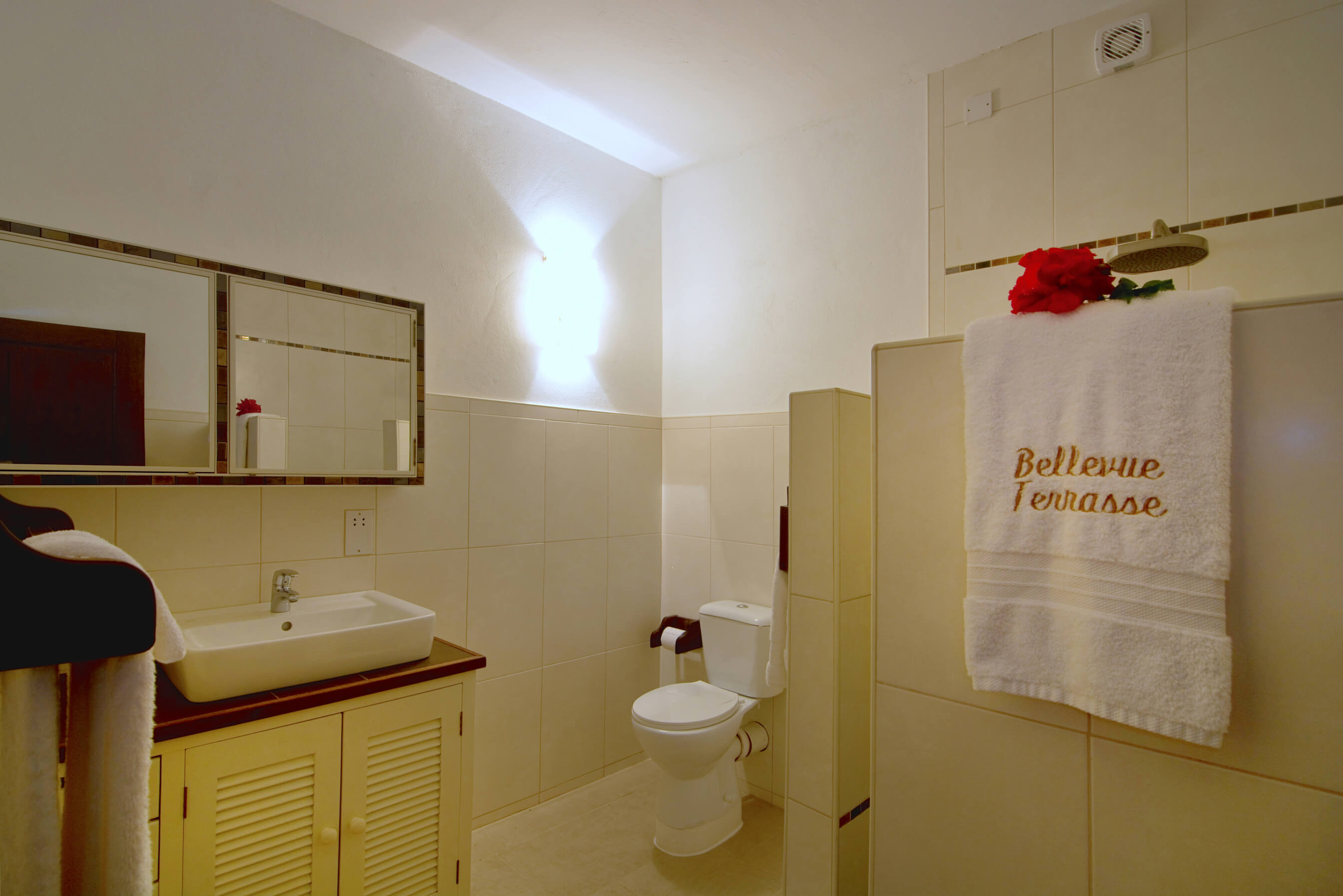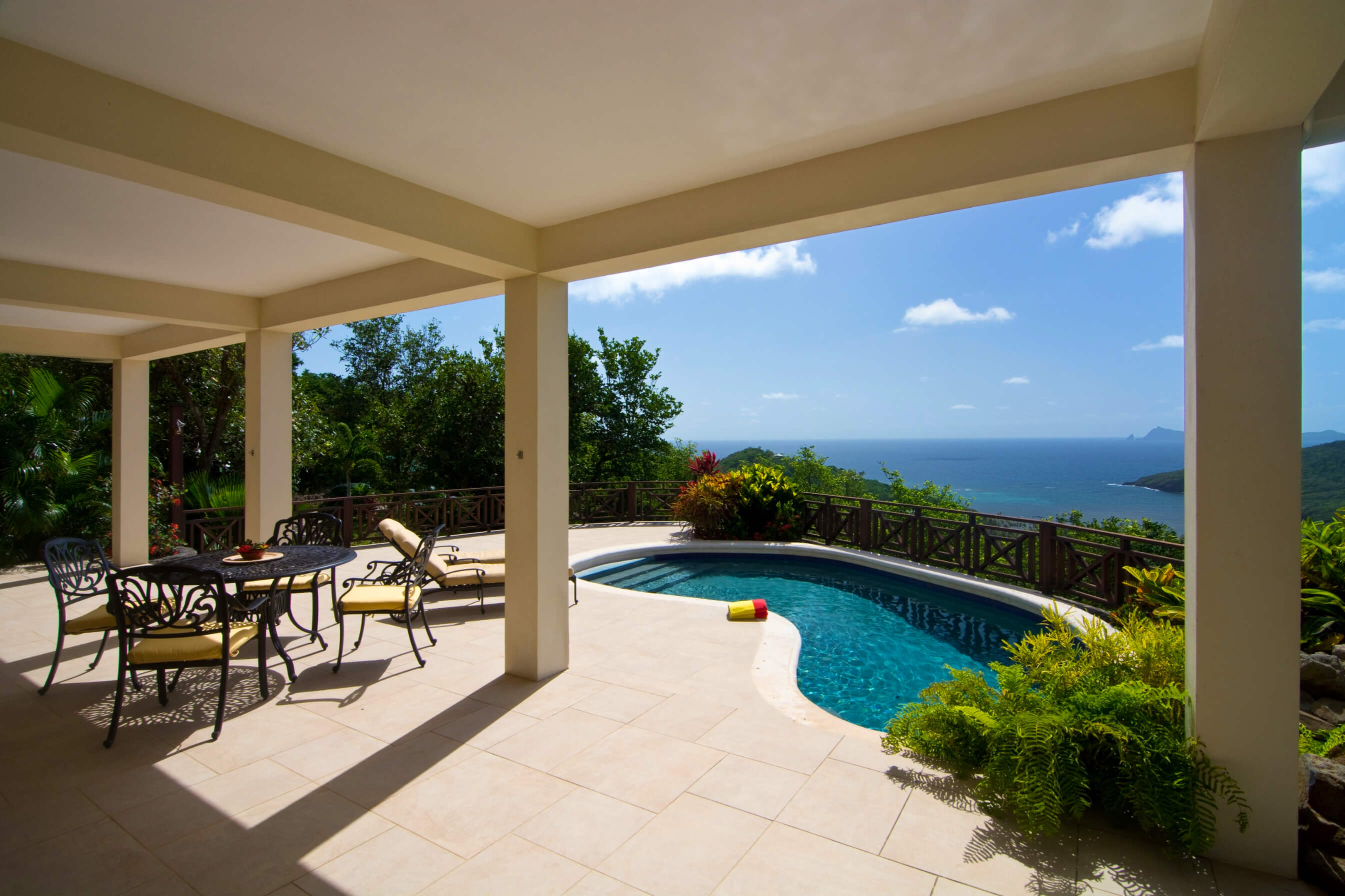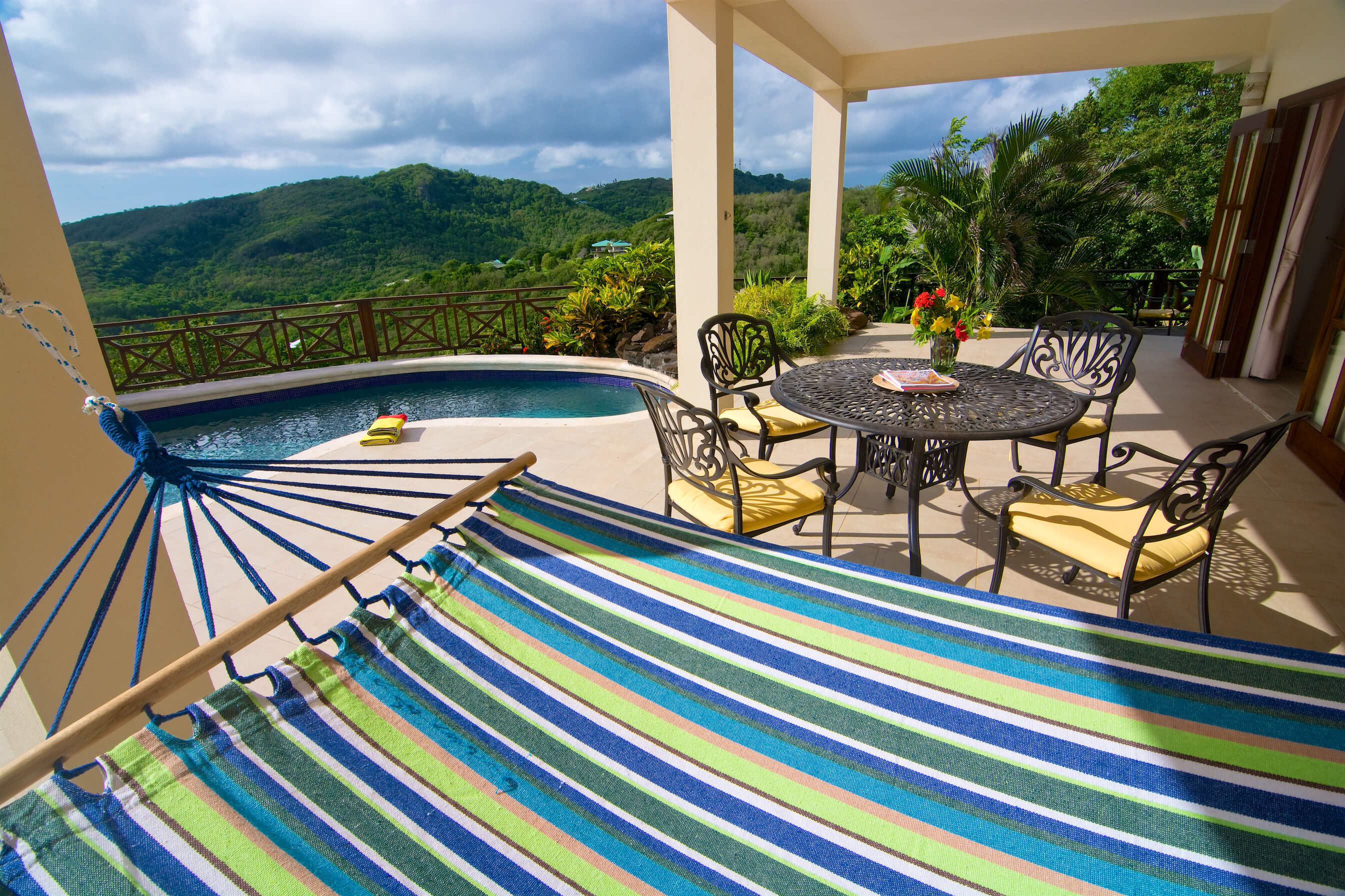Bellevue Terrasse is set up high overlooking the lush green tree-covered canopy beneath which leads out to the beautiful blue ocean and onto Spring Bay beyond. The islands of Battowia and Baliceaux are to be seen on the horizon.