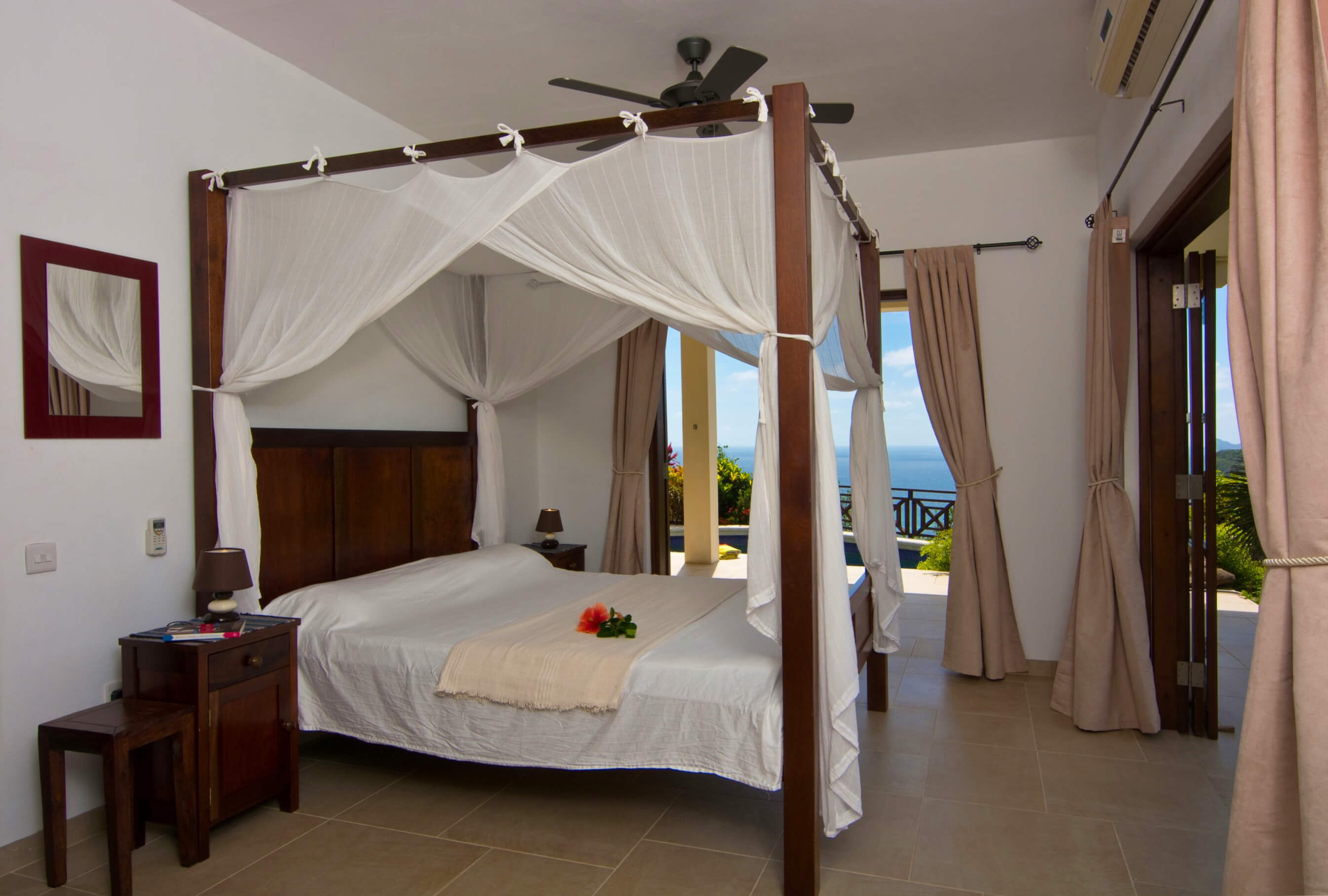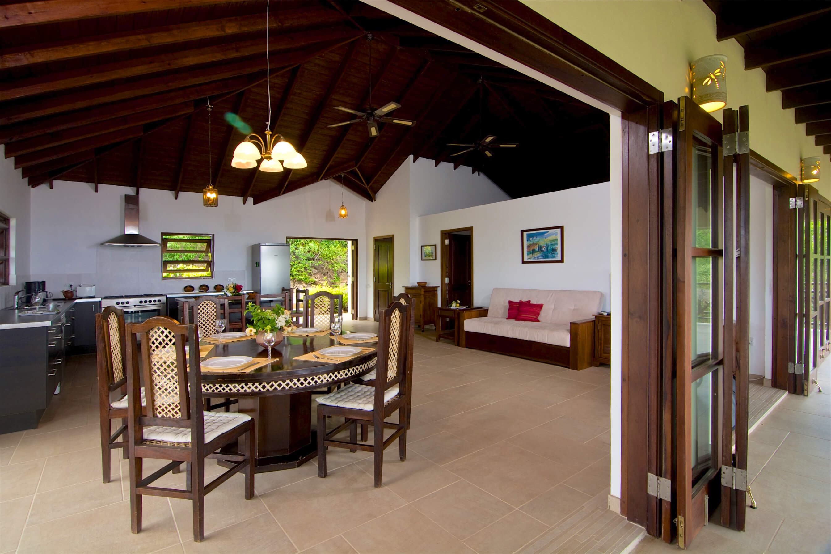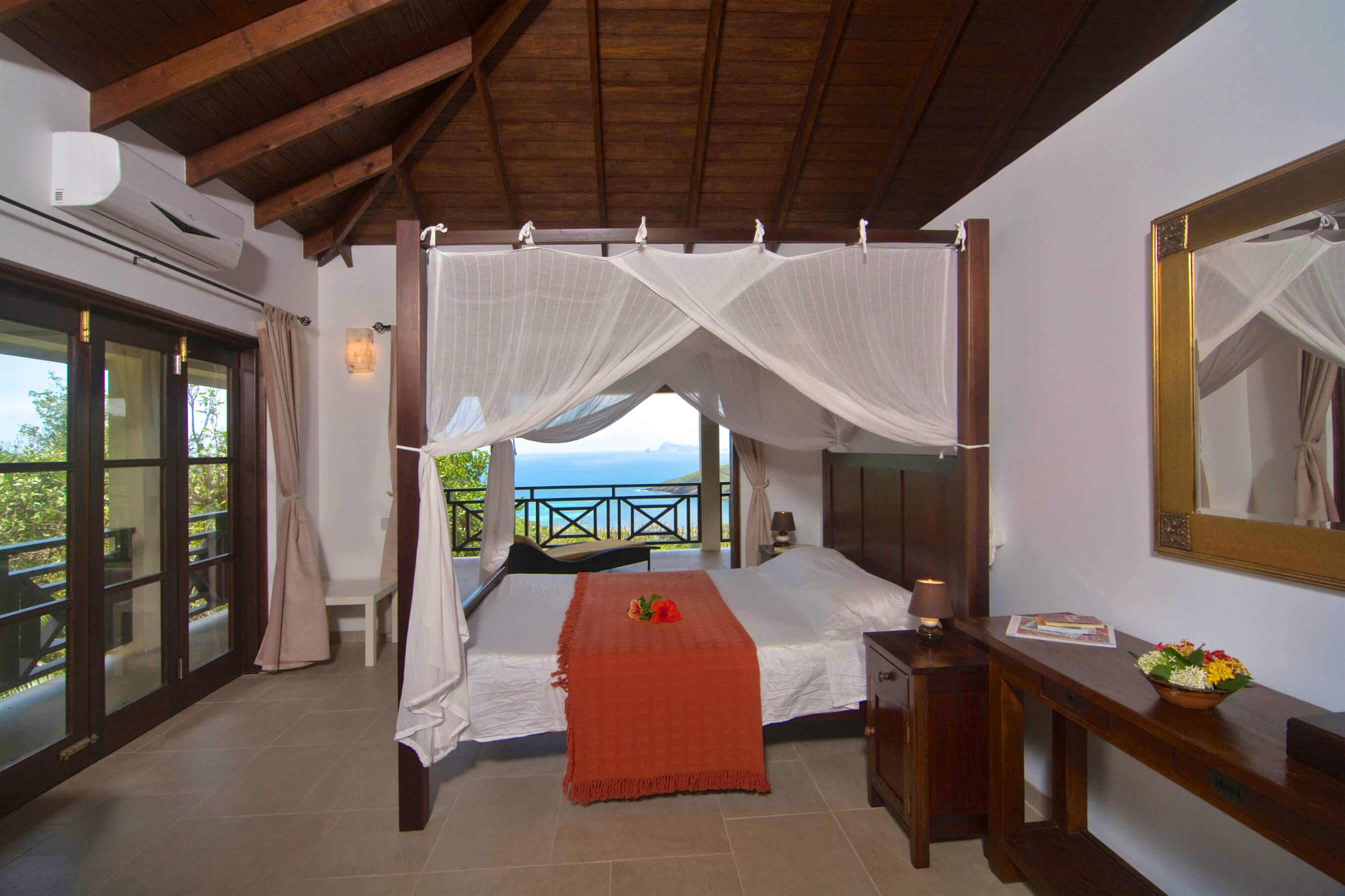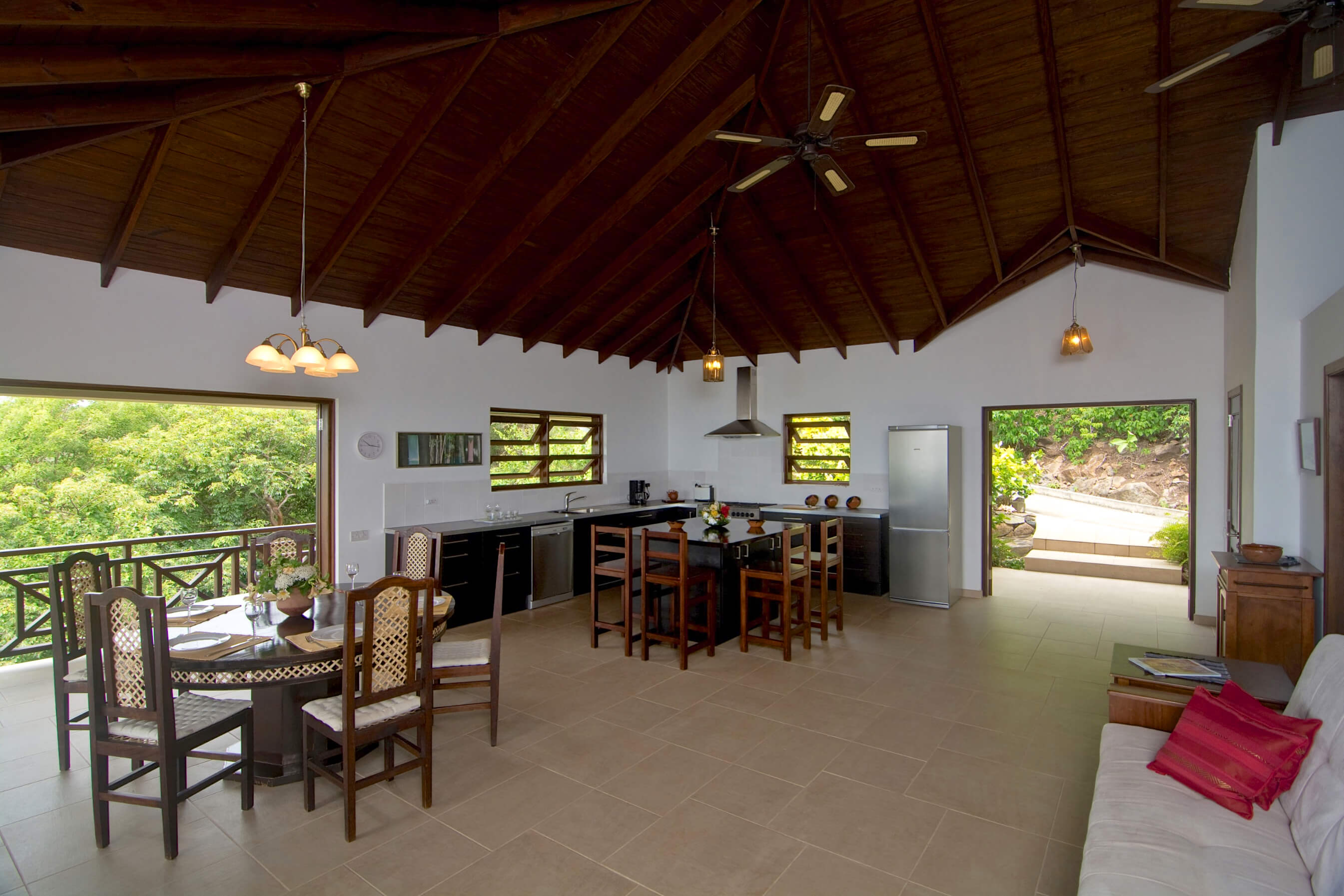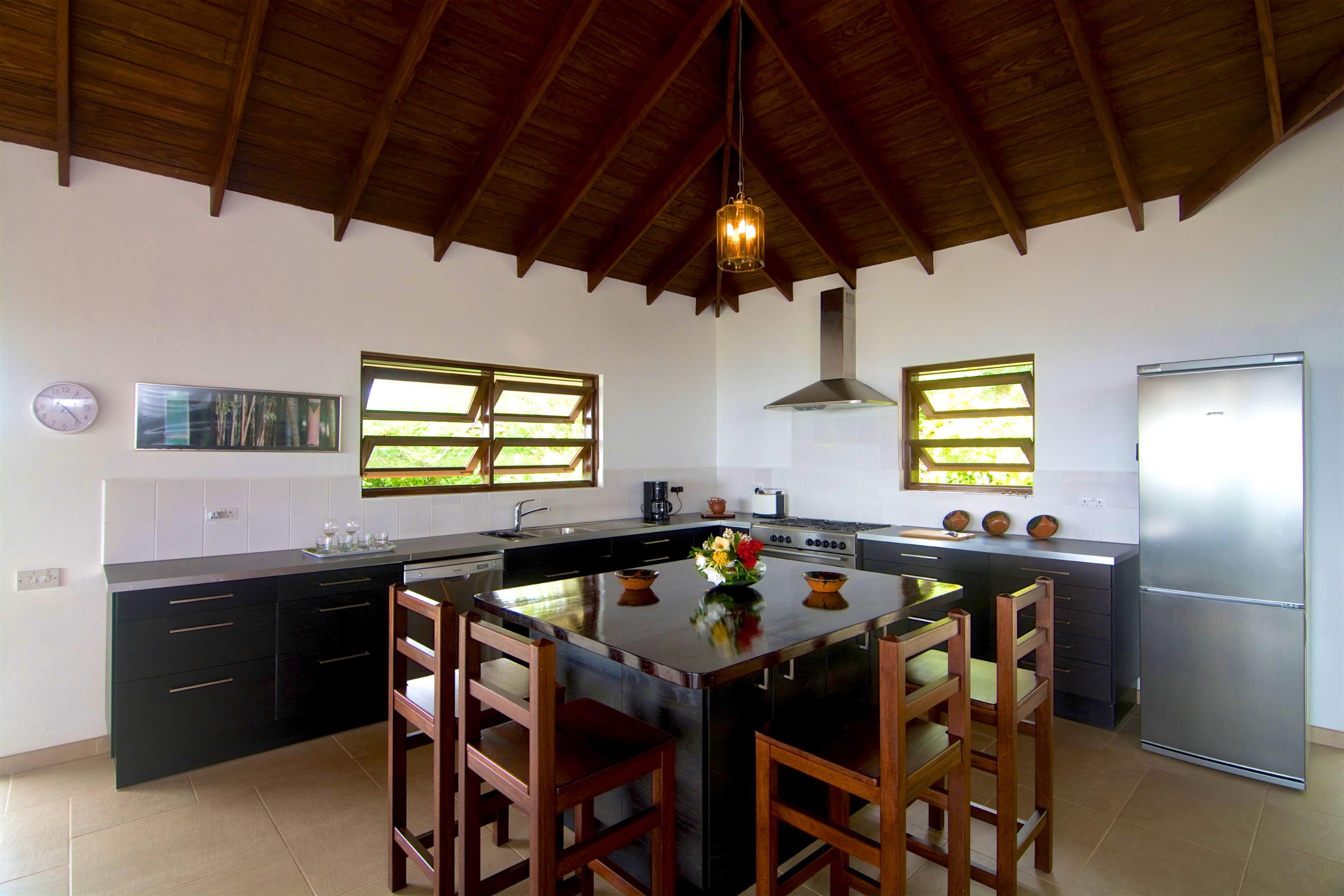 The architecture is based on the traditional tropical island concept of open spaces, surrounded by generous verandahs and covered by a spacious roof structure, which is most popular in the Grenadine Islands. Built by craftsmen from the island and from a variety of local materials, the ceramic tiles from Italy, the enchanting alabaster lamps and the artwork from Latin America are all blending in in harmony.