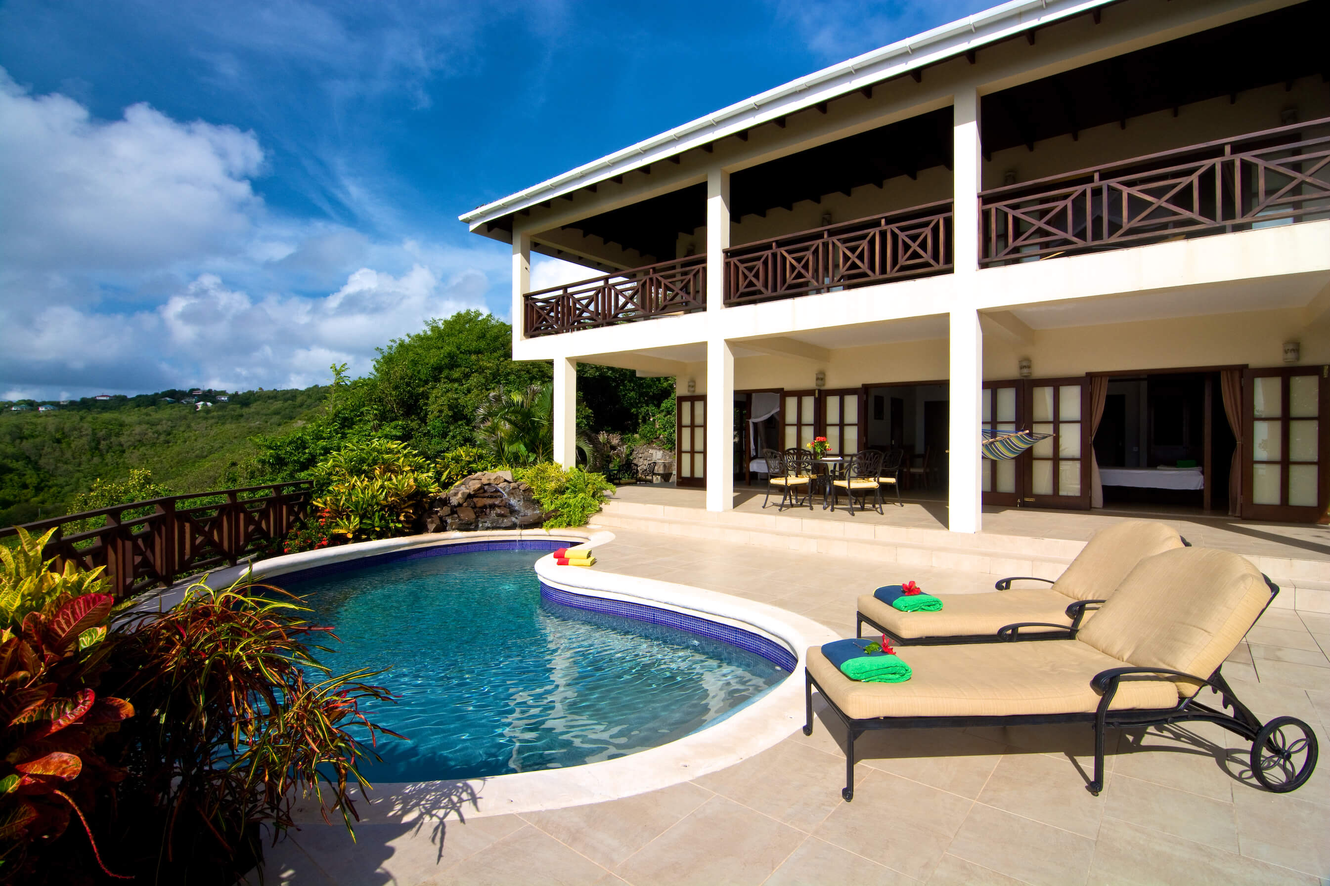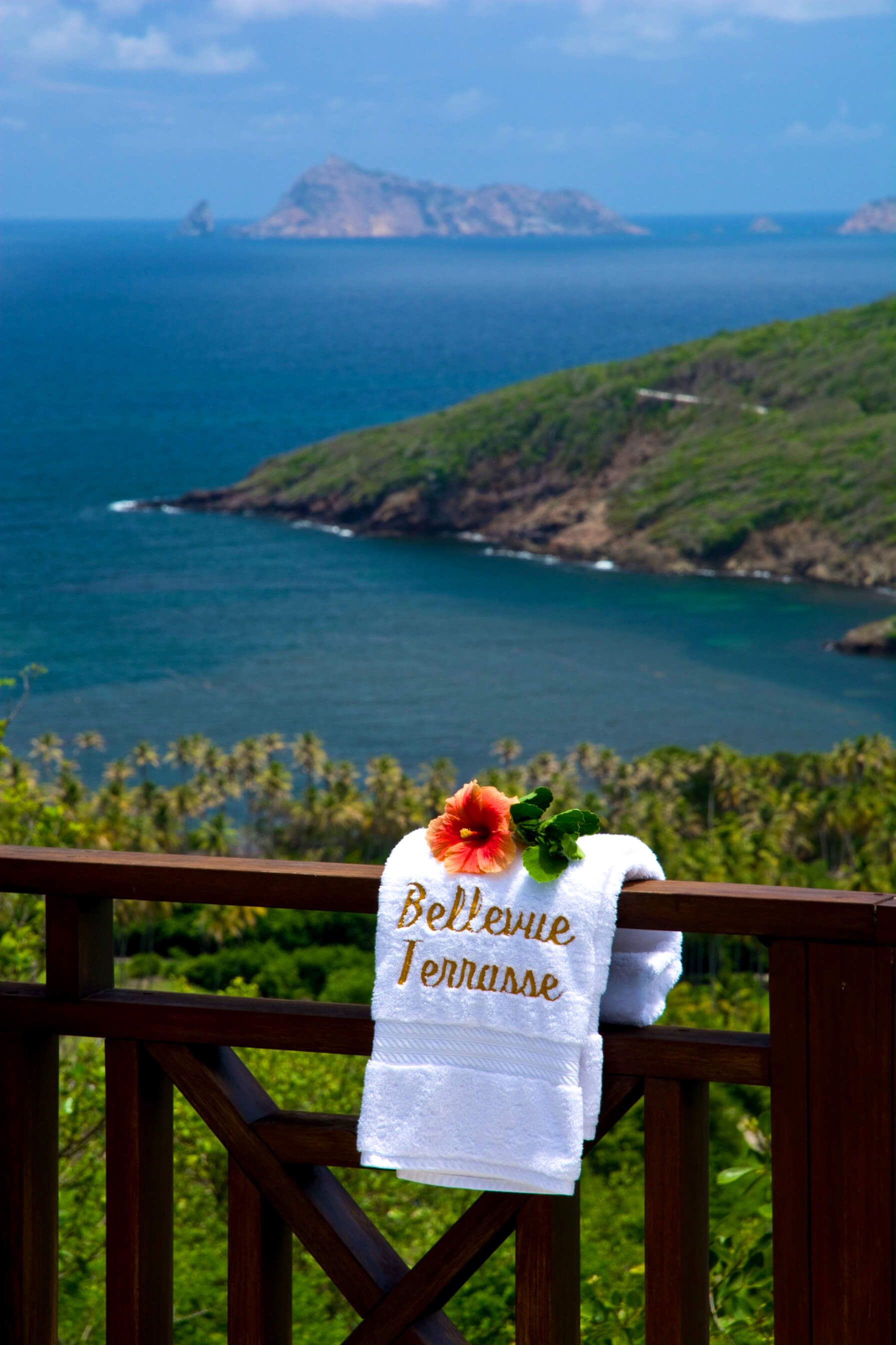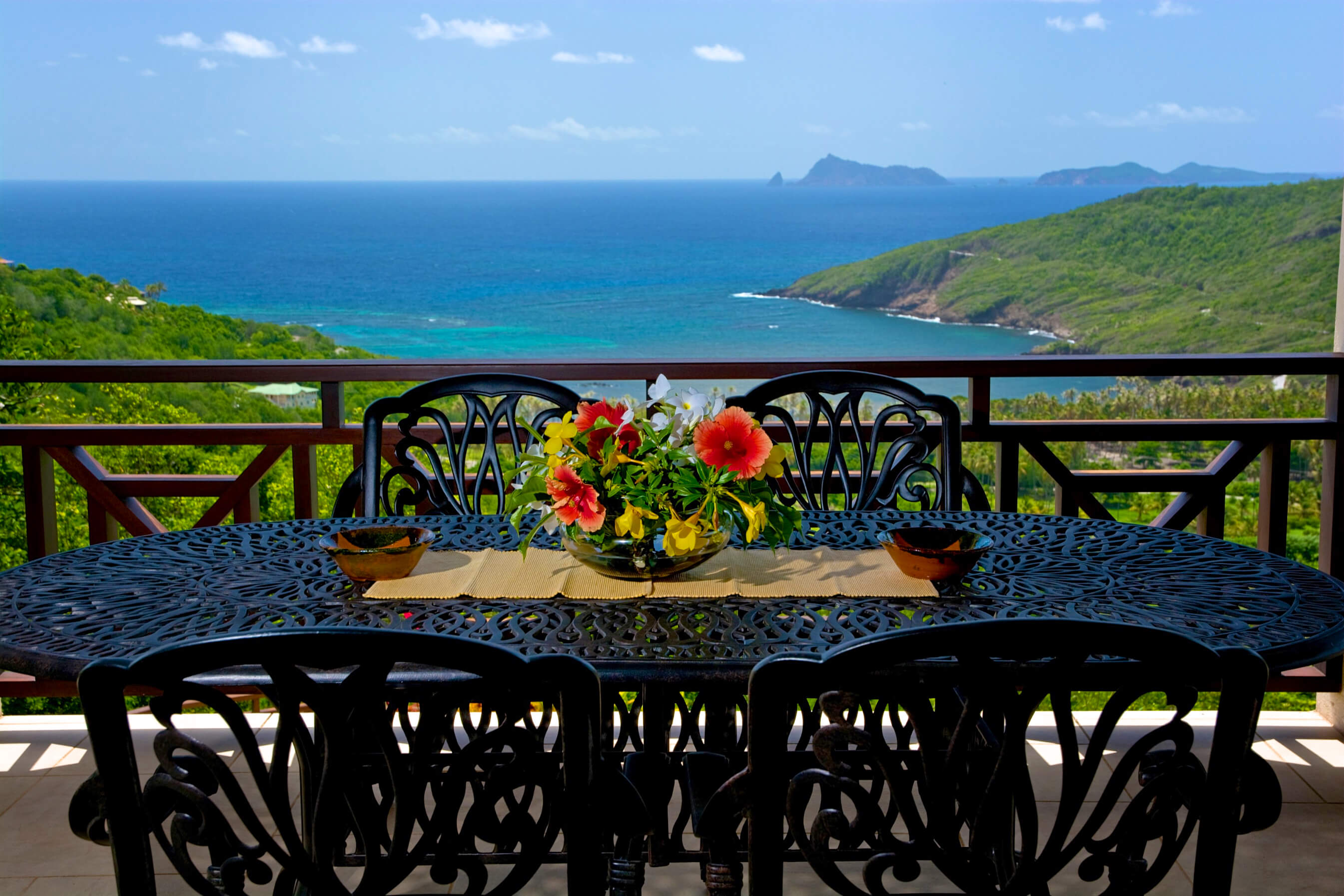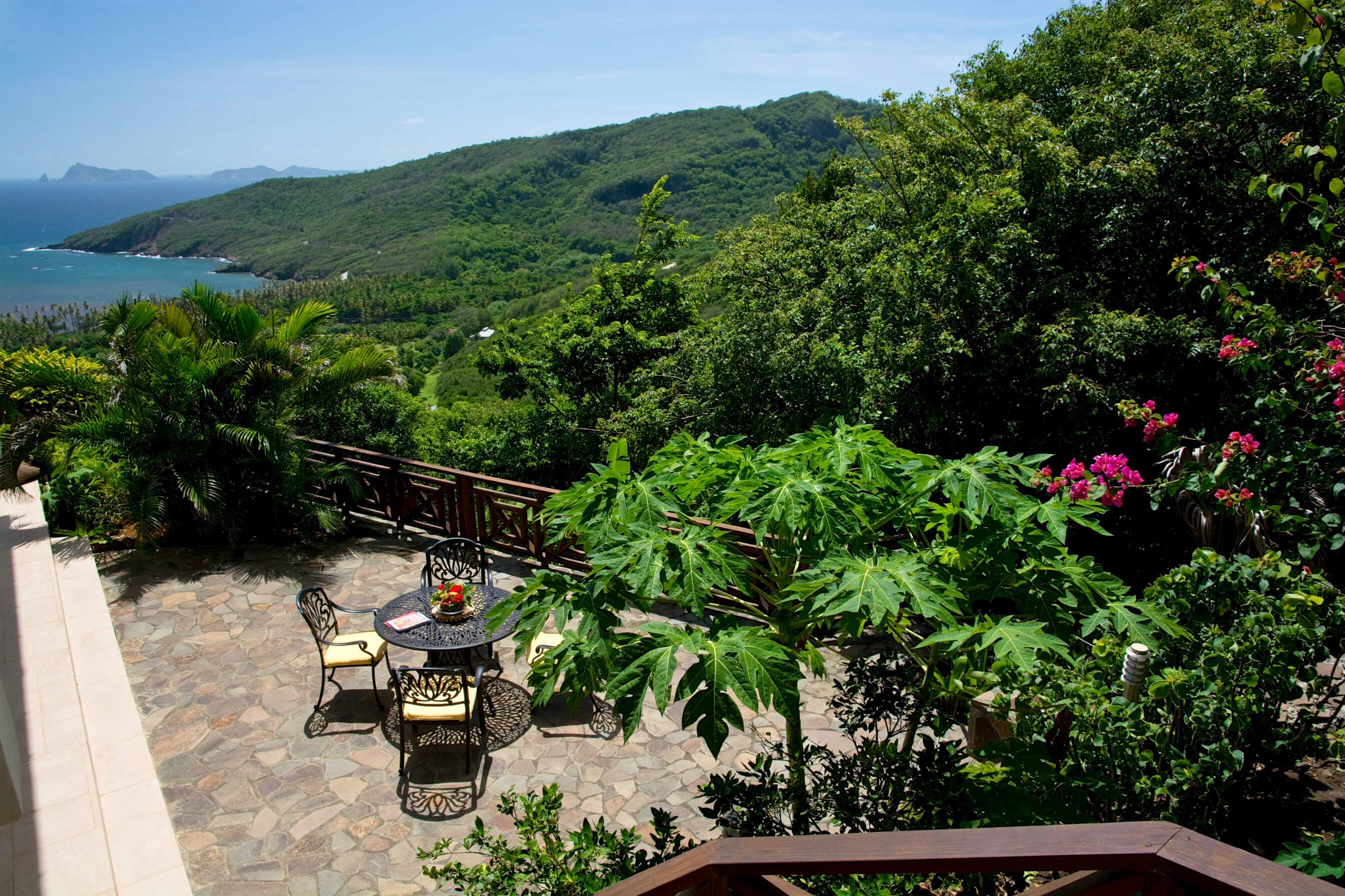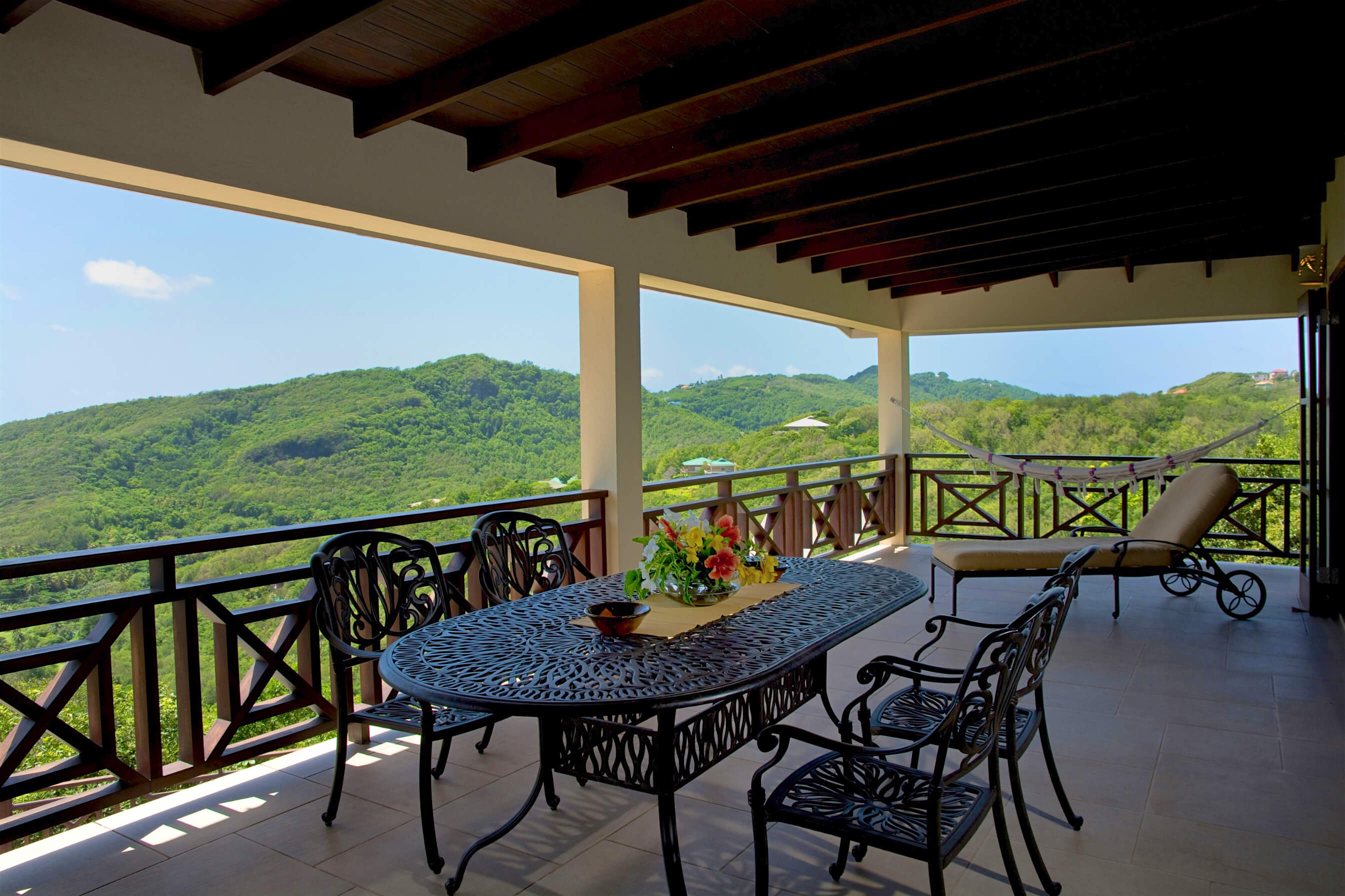 Bellevue Terrasse is set up high overlooking the lush green tree-covered canopy beneath which leads out to the beautiful blue ocean and onto Spring Bay beyond. The islands of Battowia and Balliceaux are to be seen on the horizon.