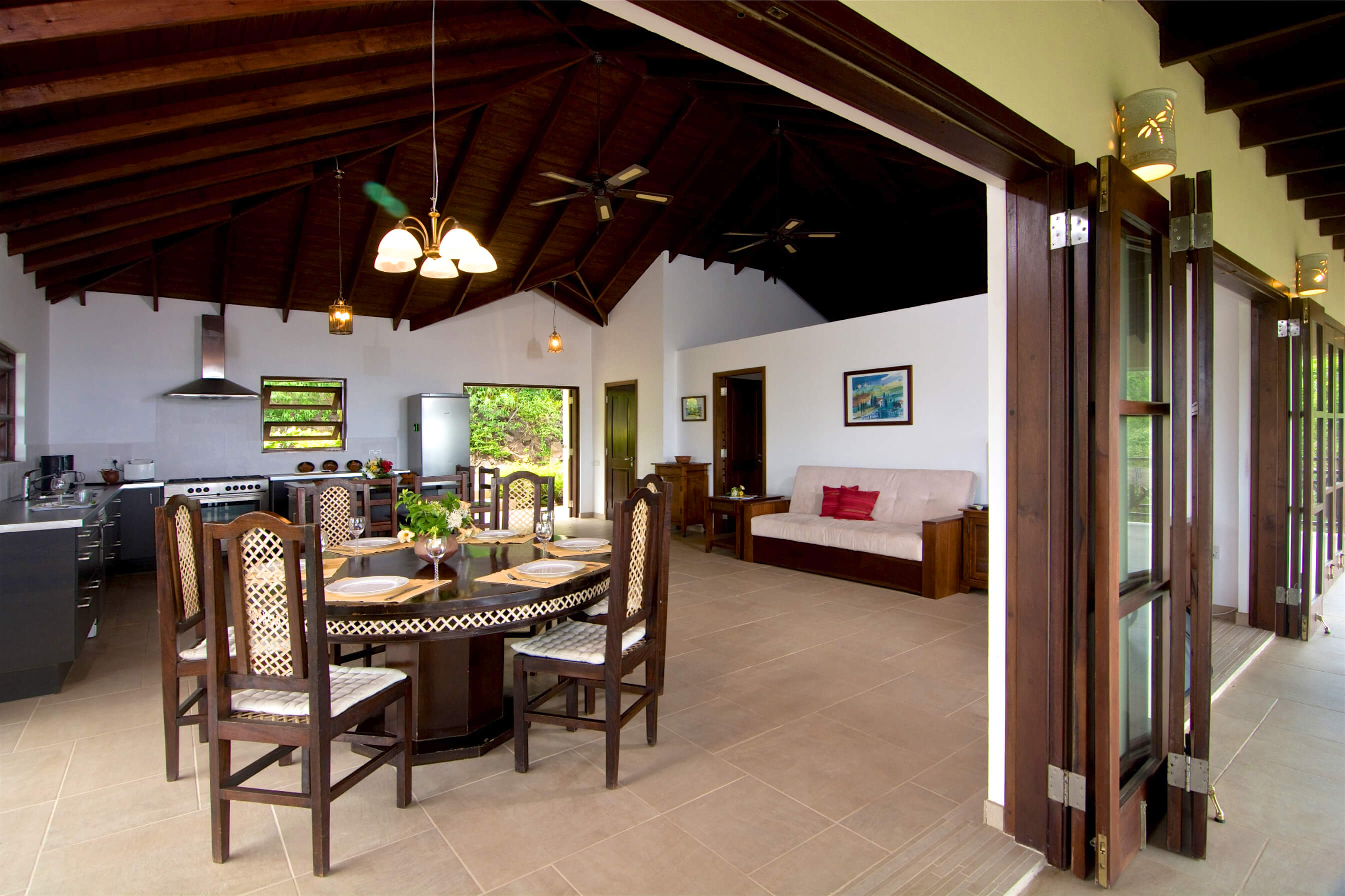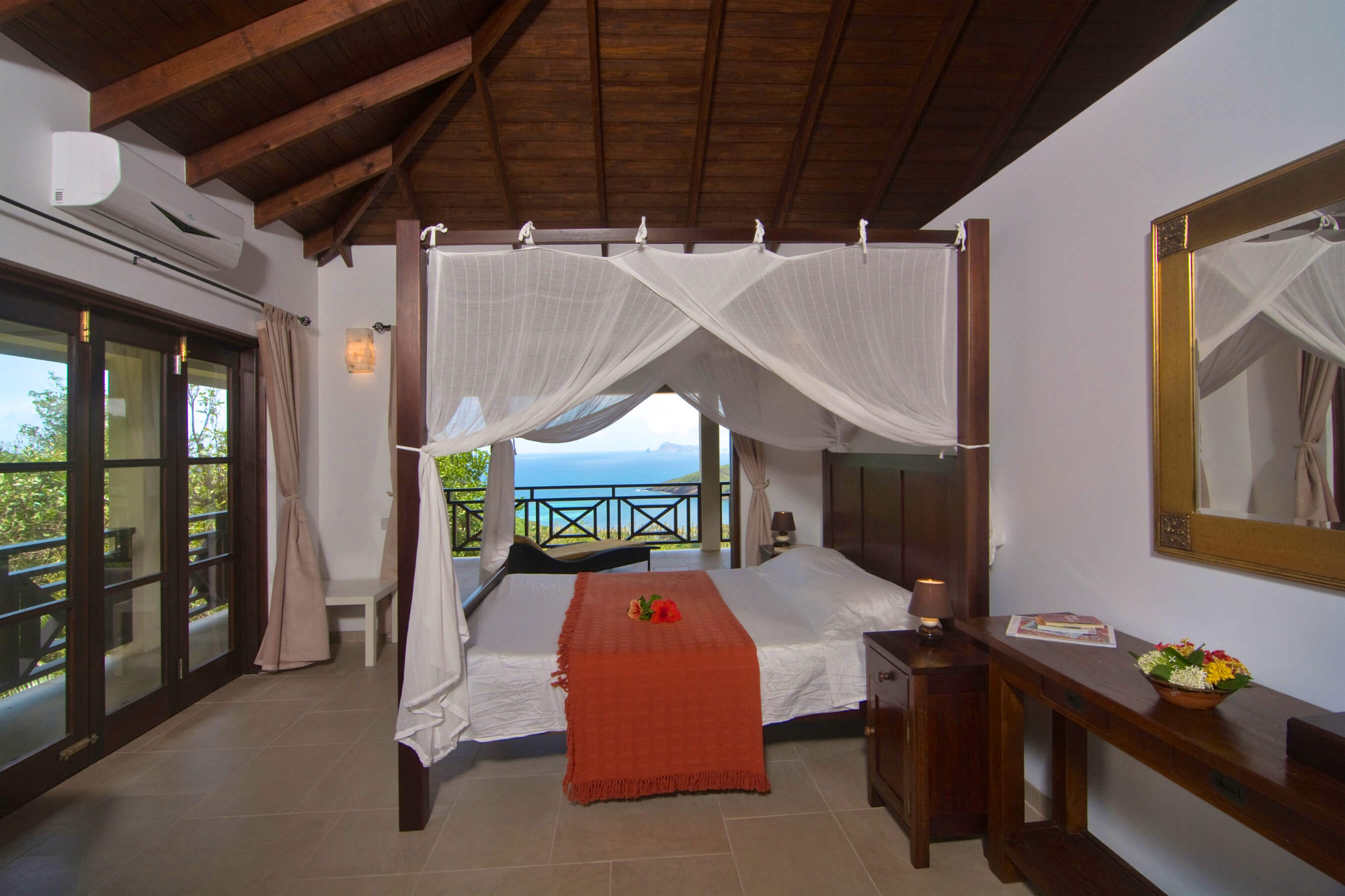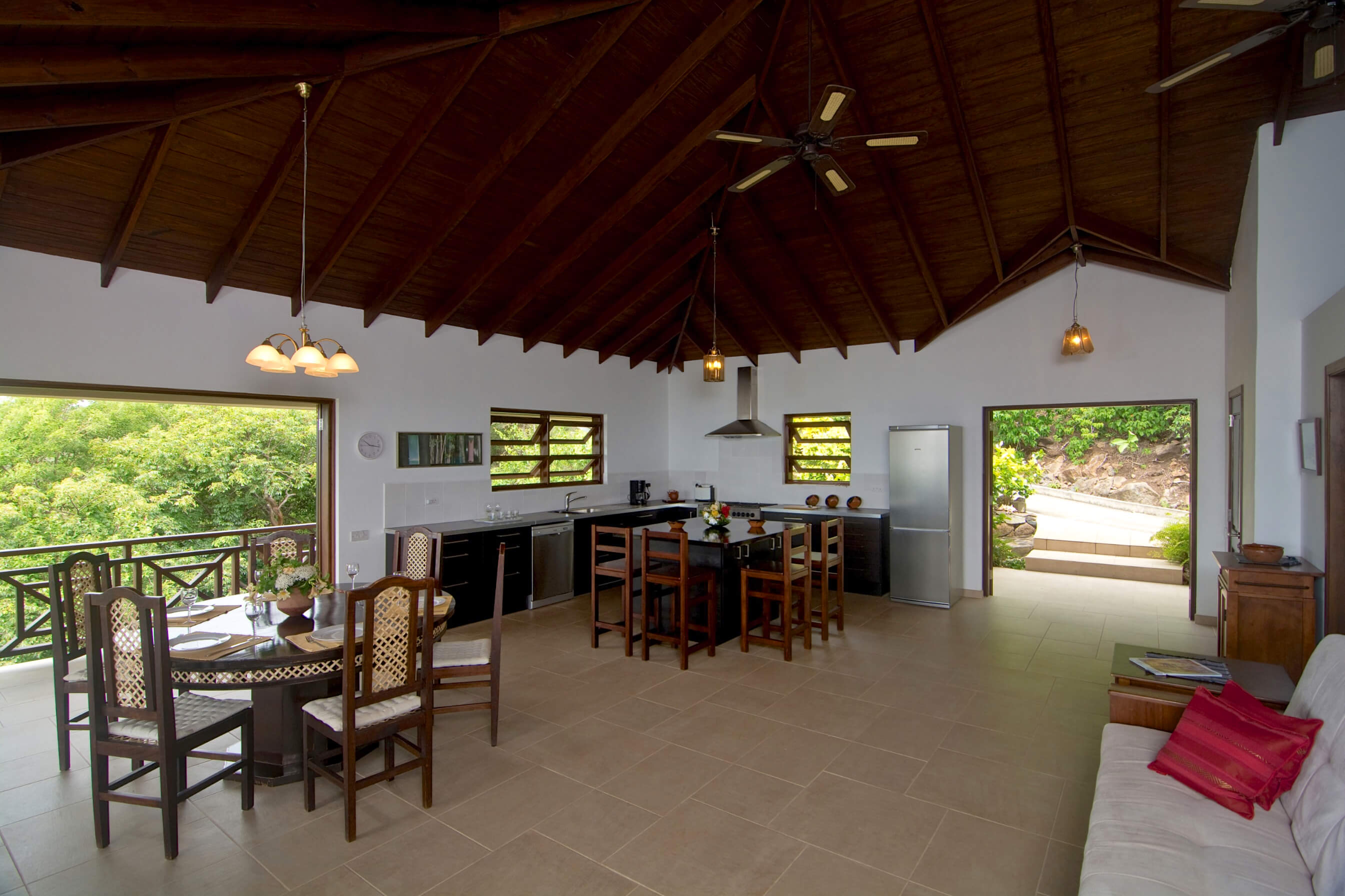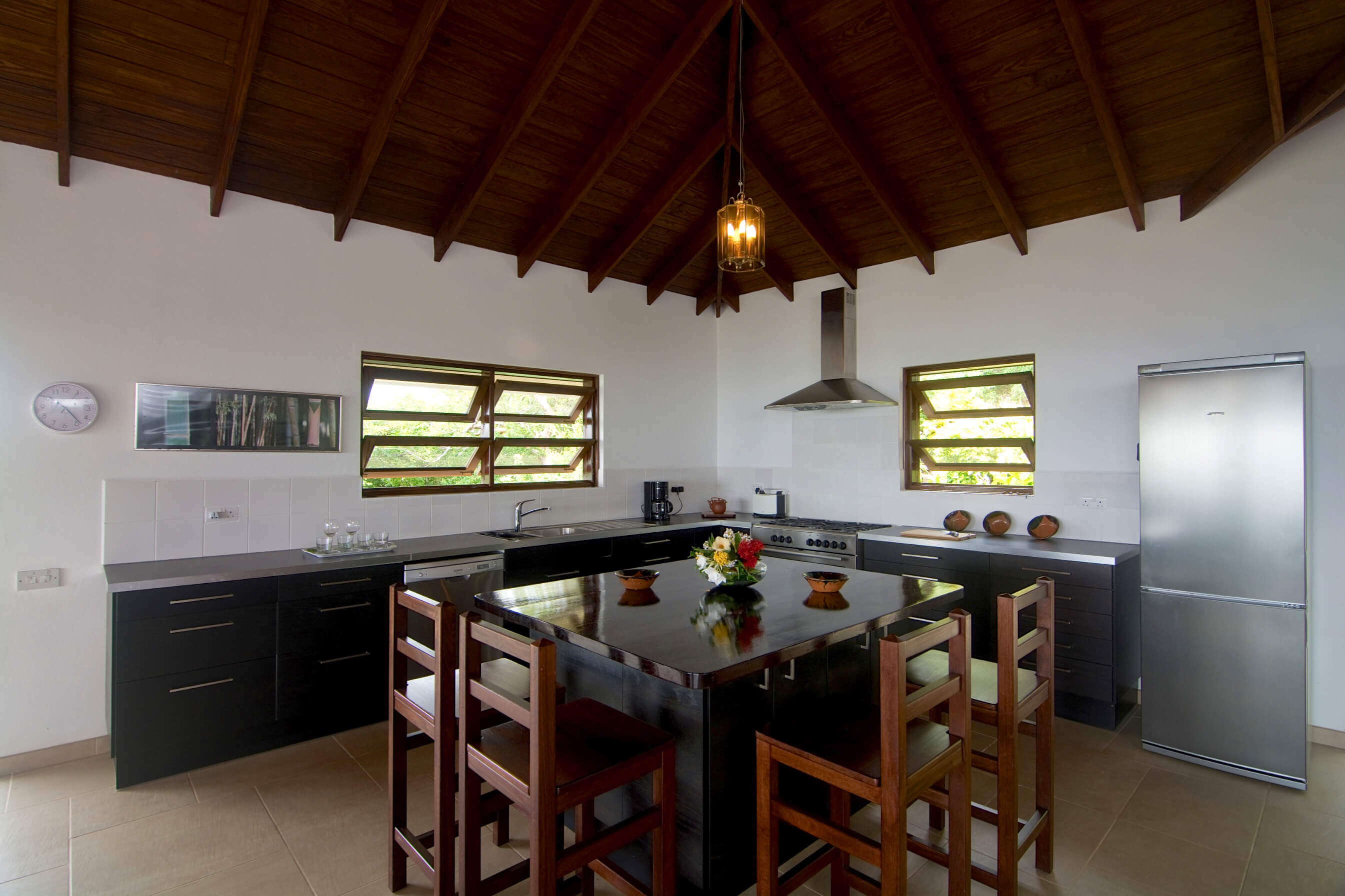 The architecture is based on the traditional tropical island concept of open spaces, surrounded by generous verandahs and covered by a spacious roof structure, which is most popular in the Grenadine Islands. Built by craftsmen from the island from a variety of local materials, the ceramic tiles from Italy, the enchanting alabaster lamps and the artwork from Latin America are all blending in in harmony.