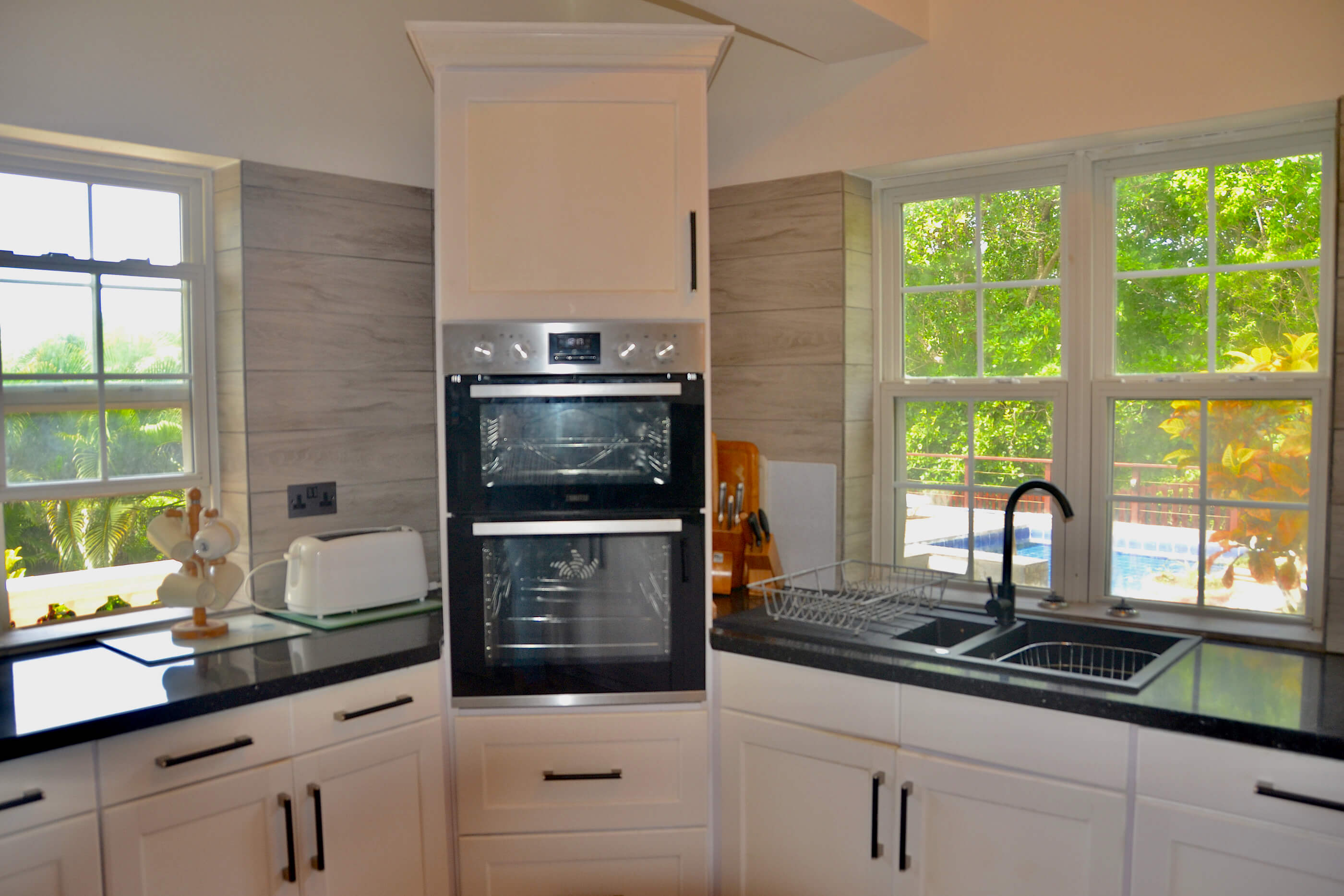 The open plan kitchen / dining room is located on the ground floor of the villa. The kitchen is a good size, and is very well equipped with all usual appliances and with plenty of surface space to prepare delicious Caribbean dinners. There is a microwave, oven, huge fridge freezer with ice machine, juicer & bread maker etc. The attached dining room is also spacious with a large dining table in the center, and again big double doors that open out onto the balcony, letting in a cool breeze as you dine.