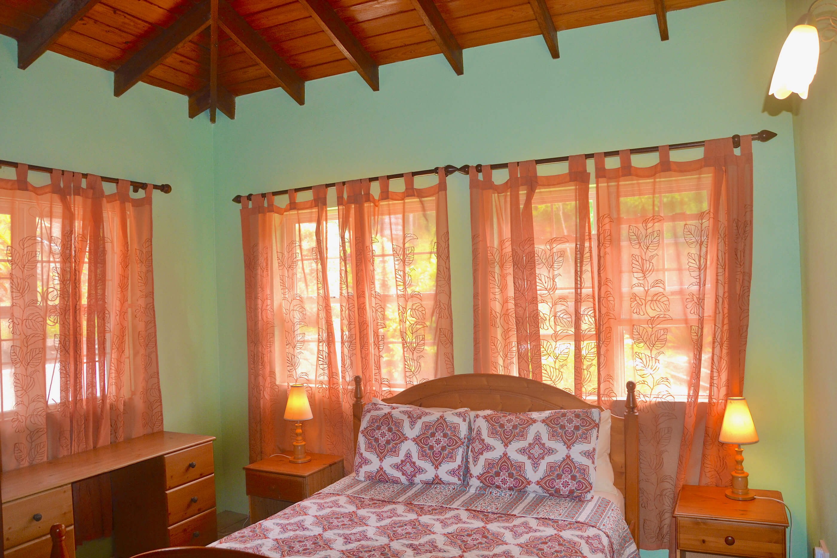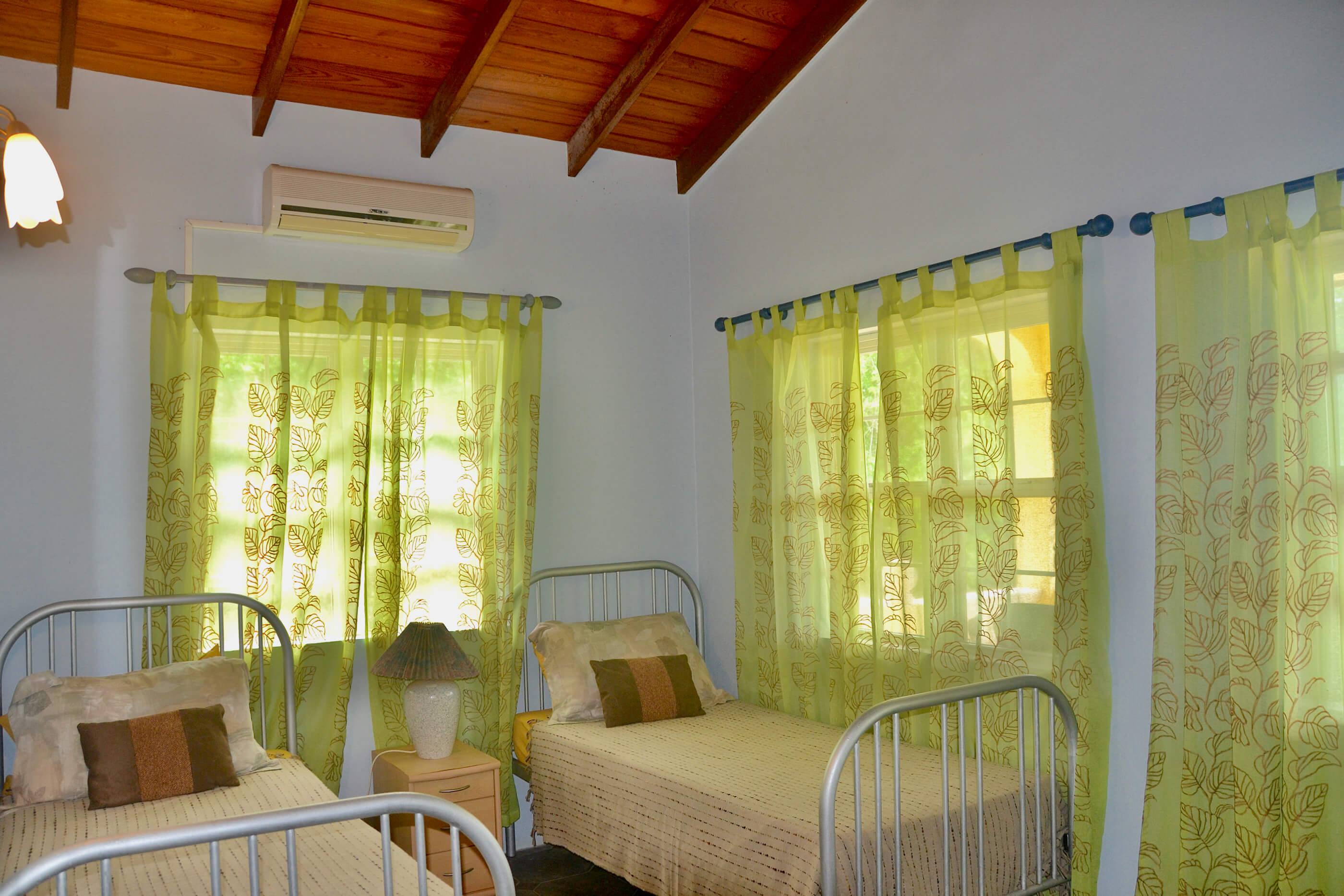 Villa Santa Maria has 3 good sized bedrooms, with high wooden ceilings and decorated in calm, refreshing colours. All 3 rooms are en suite and have mosquito nets, fans and air conditioning to keep you comfortable at night. Two of the rooms contain queen beds with the third containing 2 single beds. Relaxing spaces in which to recharge your batteries, ready for the next day of your Bequia vacation.