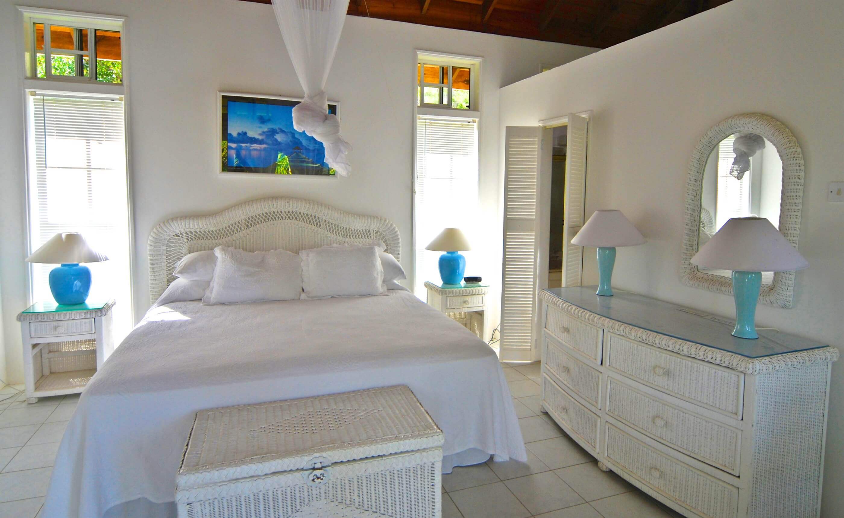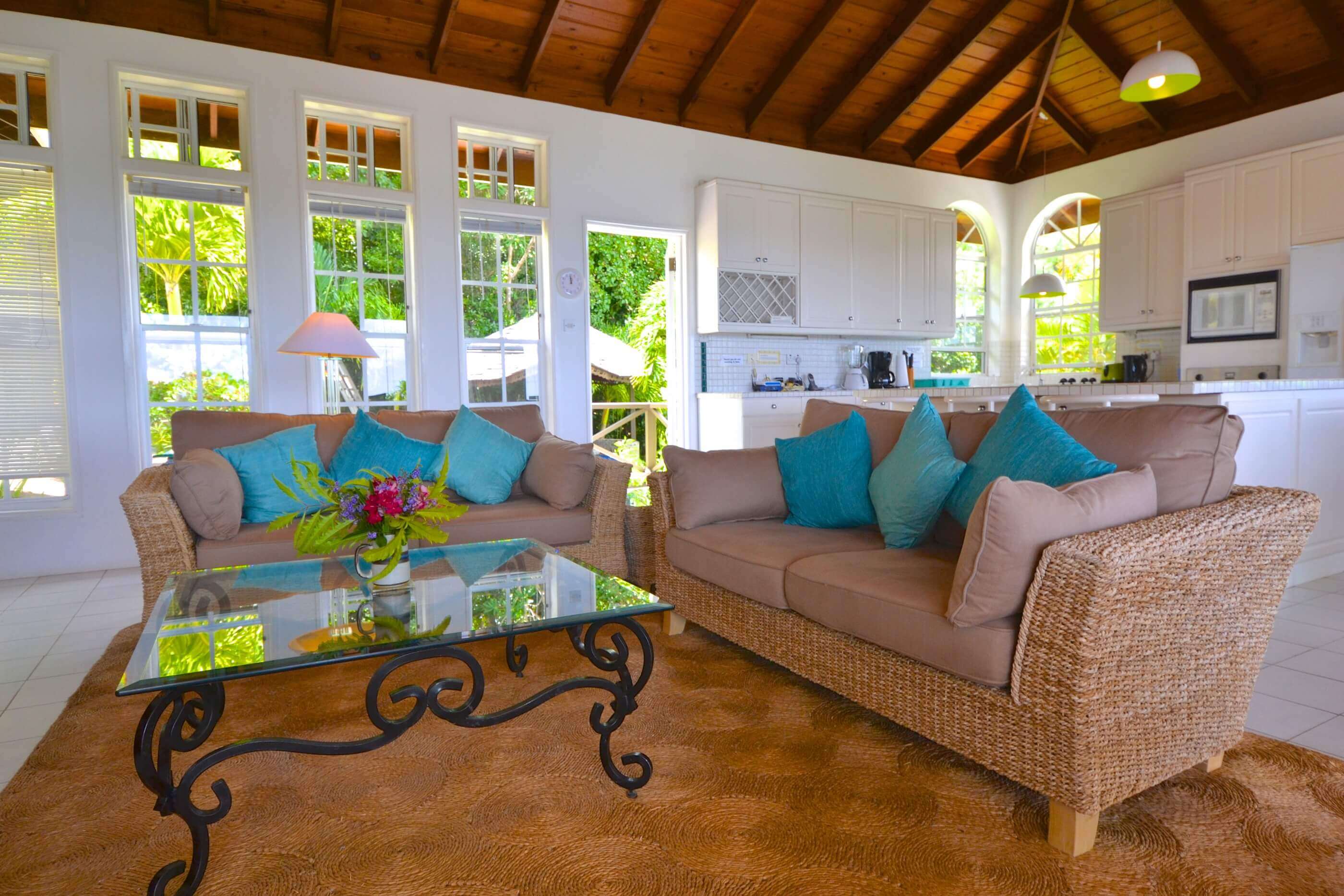 The veranda at Windsong is an excellent place to spend some time relaxing. There are many outdoor seating and dining areas to enjoy, and double doors throughout the villa open out onto this space, giving the whole property the advantage of a lovely, cooling ocean breeze.