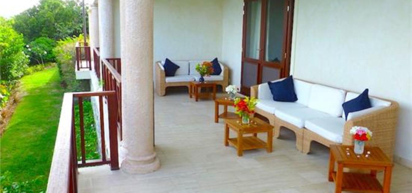 - Bedroom 1: Master Bedroom with super king size four-poster bed, side tables, ceiling fan, large desk, chairs, safe and television. Walk-in dressing area with closets and spacious en-suite bathroom comprising bath tub and separate shower enclosure. A large furnished terrace leads to the pool area.