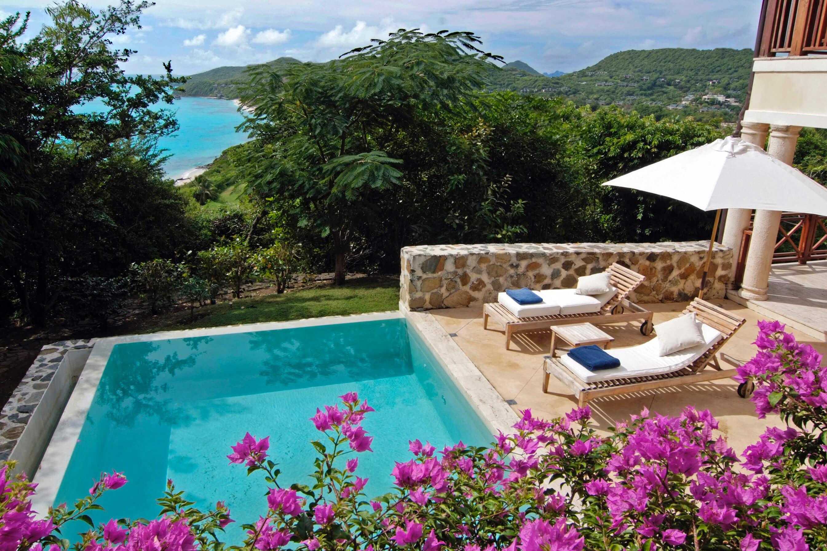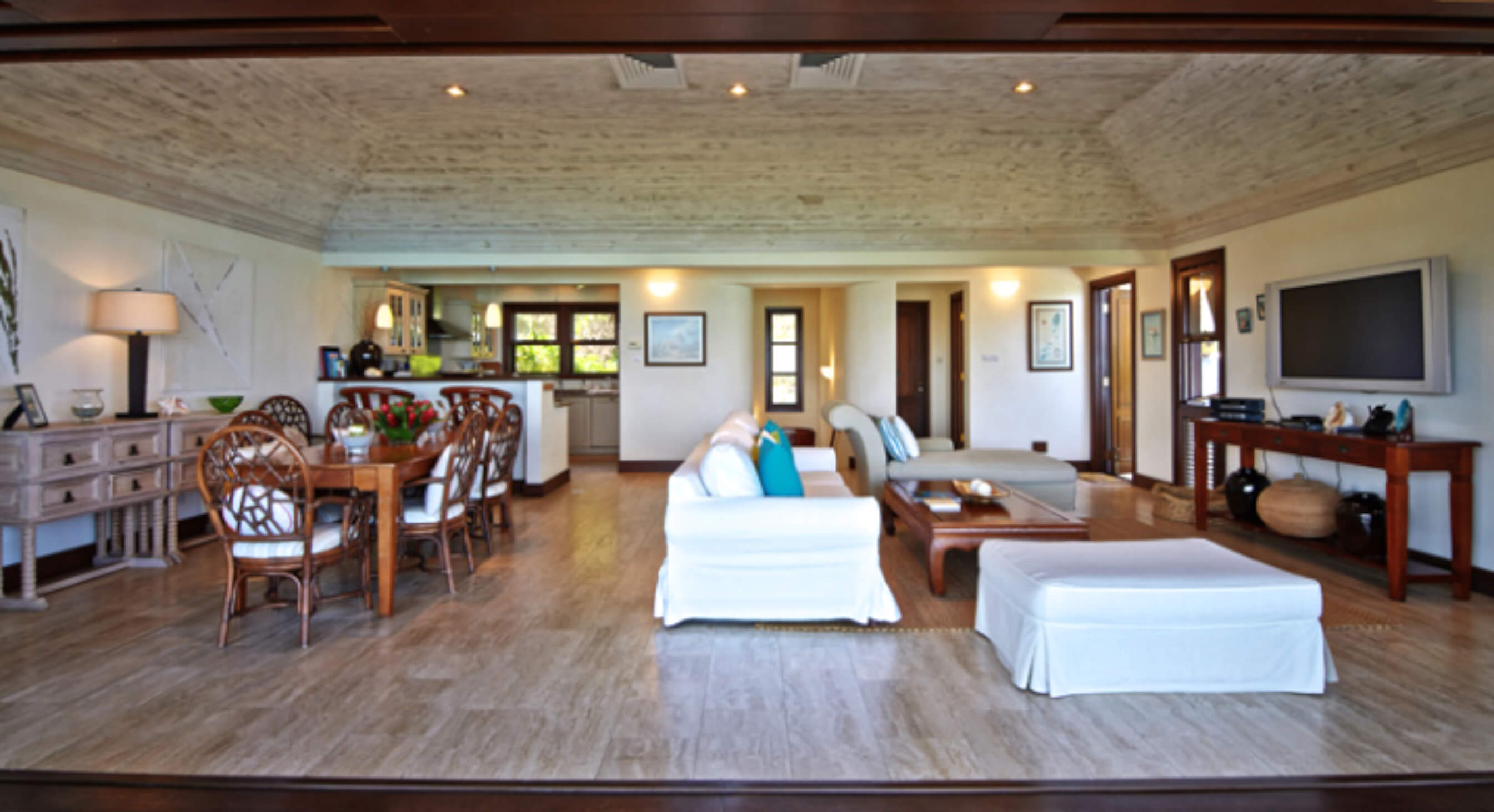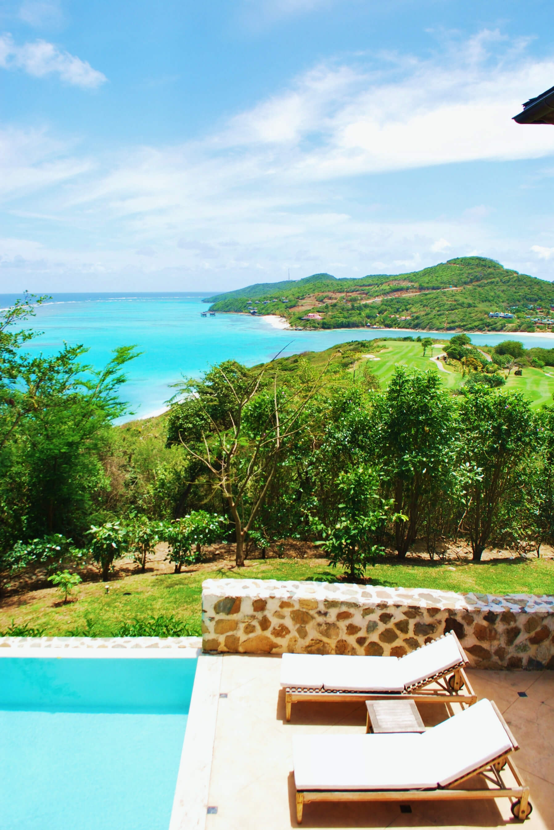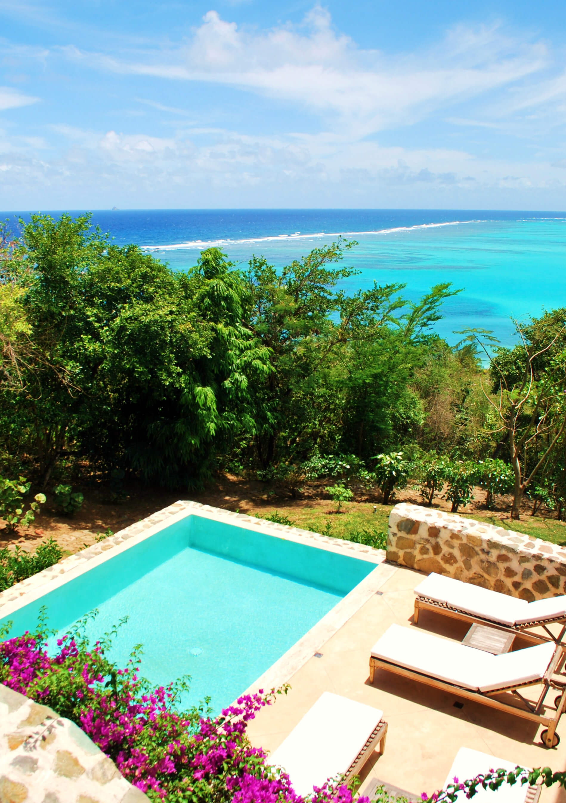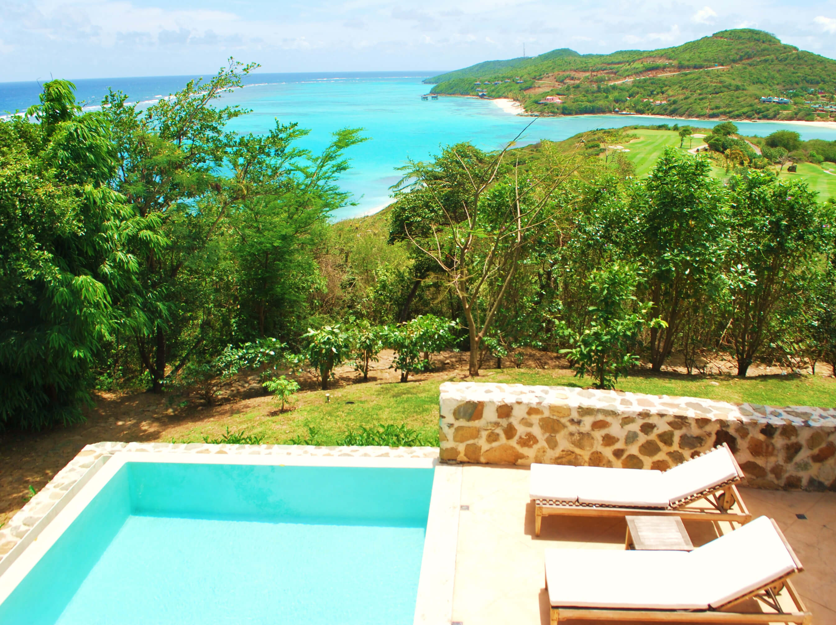 This villa, part of an exclusive collection on Canouan, offers guests an experience of luxury within a solid, quality exterior. External finishes are a blend of stone, adobe painted cement walls and hardwood windows and doors. Roofs are wallaba shingles which blends naturally into the environment, offering the perfect essence of tropical living.