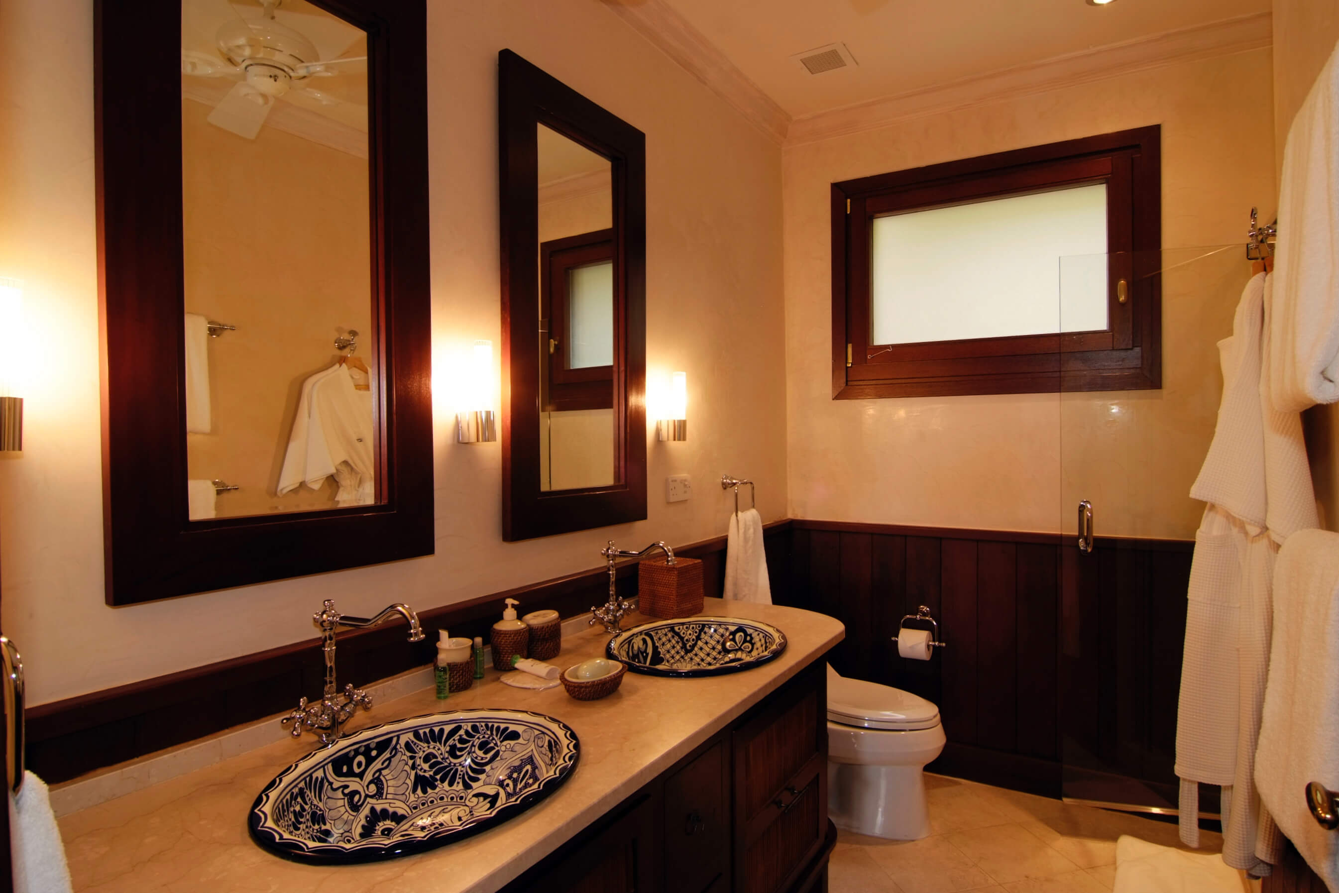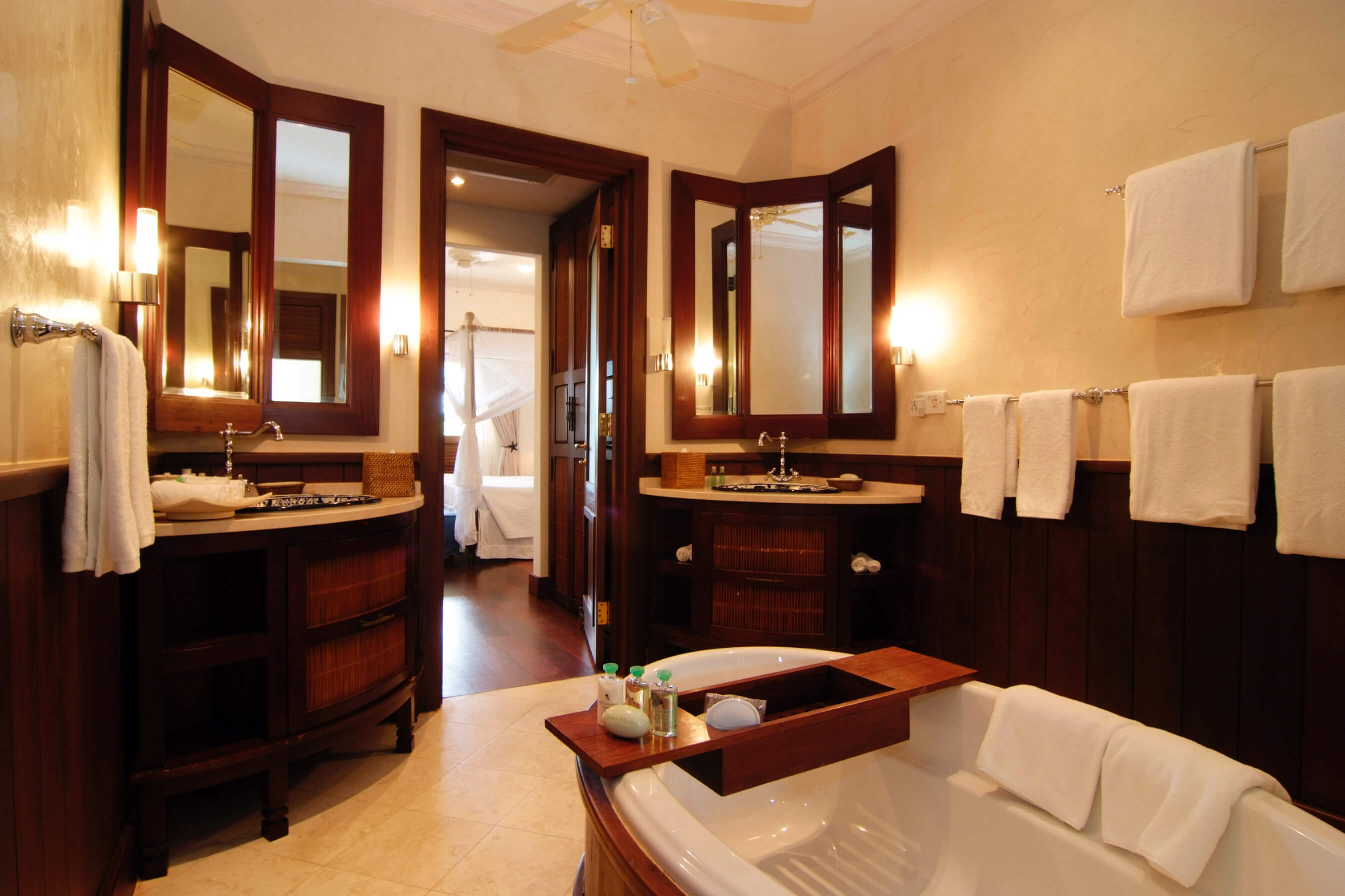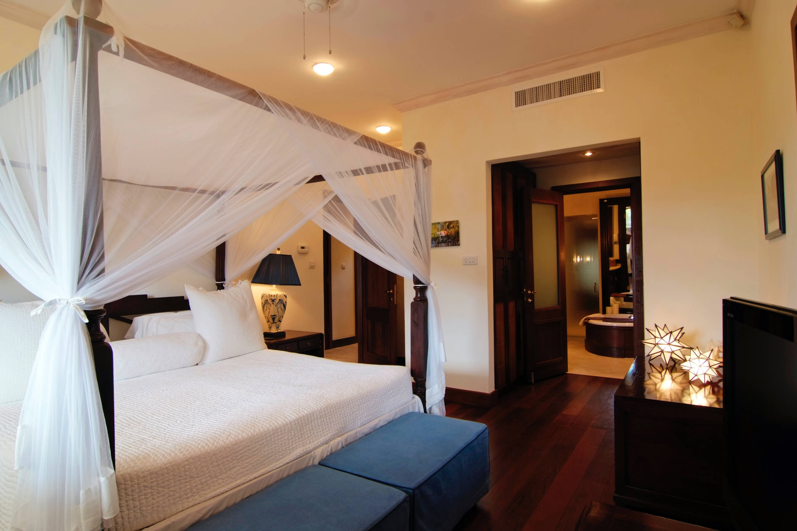Bedroom 1 – Master – Is 323 Sq. ft (30 Sq. m) with a king size bed, en-suite bathroom with bathtub and shower, double vanity, air conditioning, fan, safe, telephone, closet, private terrace, TV, wireless access, mosquito net. Overlooking the bay with private balcony.