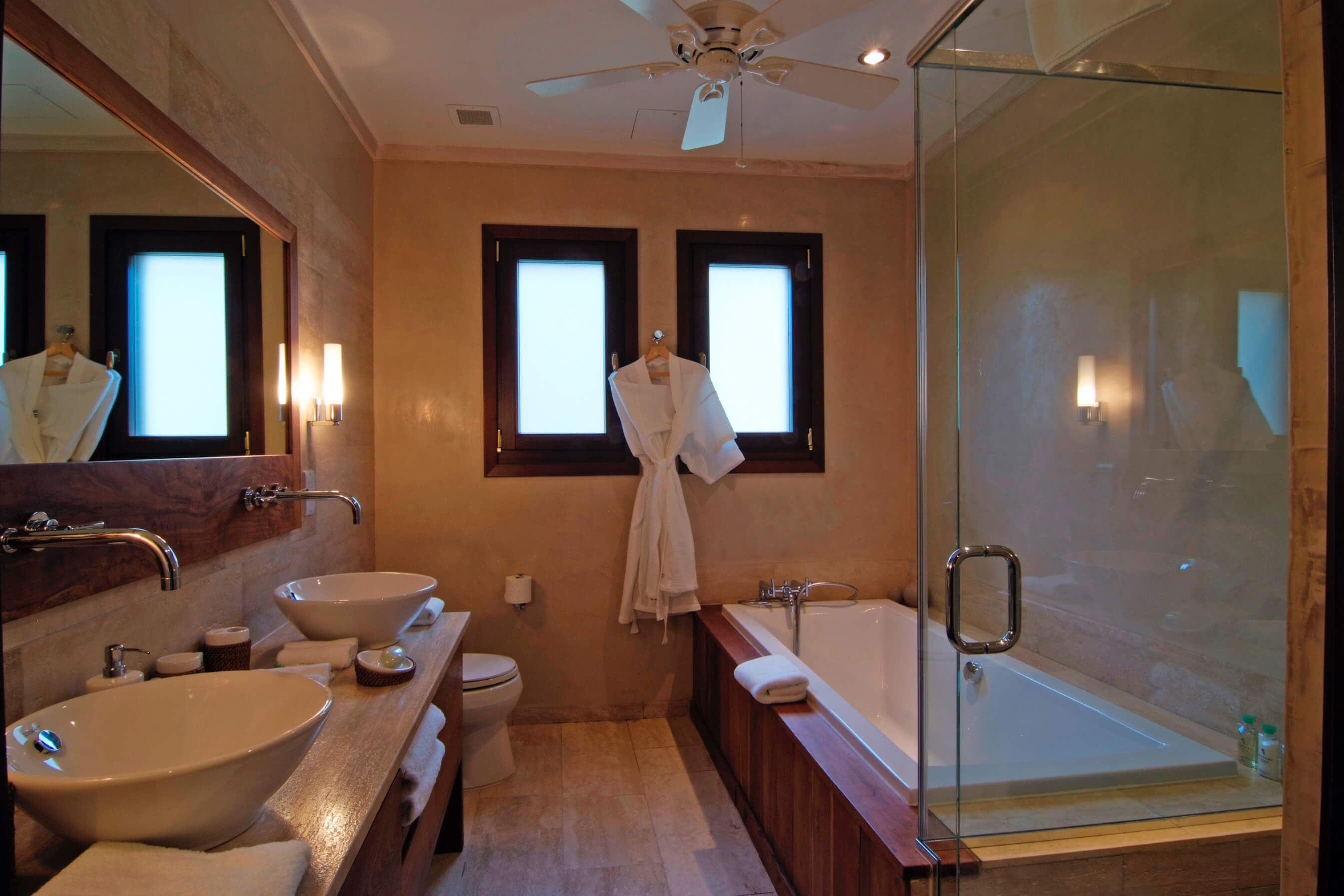 - Bedroom 2 – Two Double beds 517 Sq. ft (48 Sq. m) with two double size beds, en-suite bathroom with bathtub and shower, double vanity, air conditioning, fan, safe, telephone, private terrace, TV, wireless access, mosquito net.