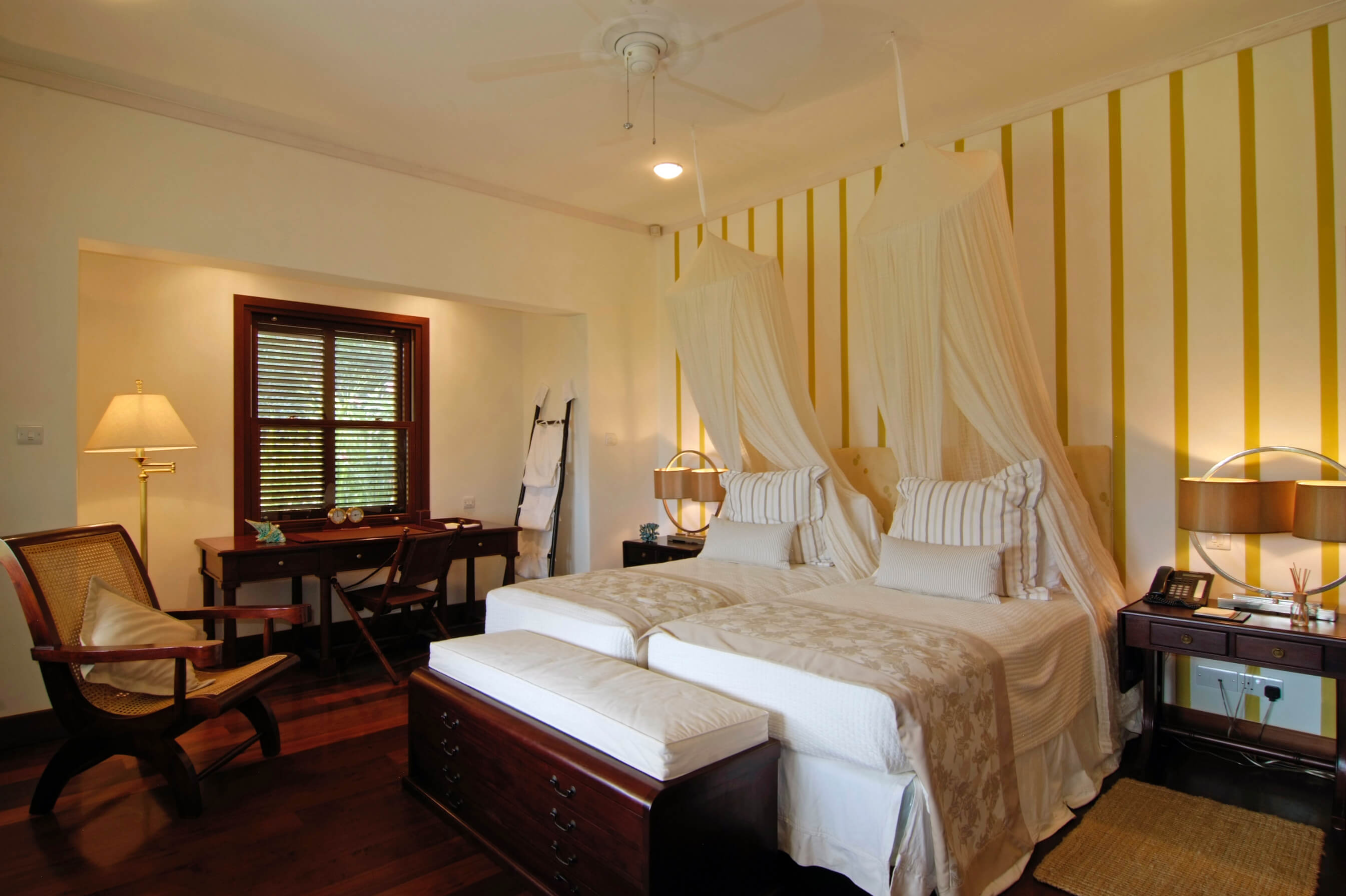 Bedroom 2 – Two Double beds – Is 517 Sq. ft (48 Sq. m) with two double size beds, en-suite bathroom with bathtub and shower, double vanity, air conditioning, fan, safe, telephone, private terrace, TV, wireless access, mosquito net.
