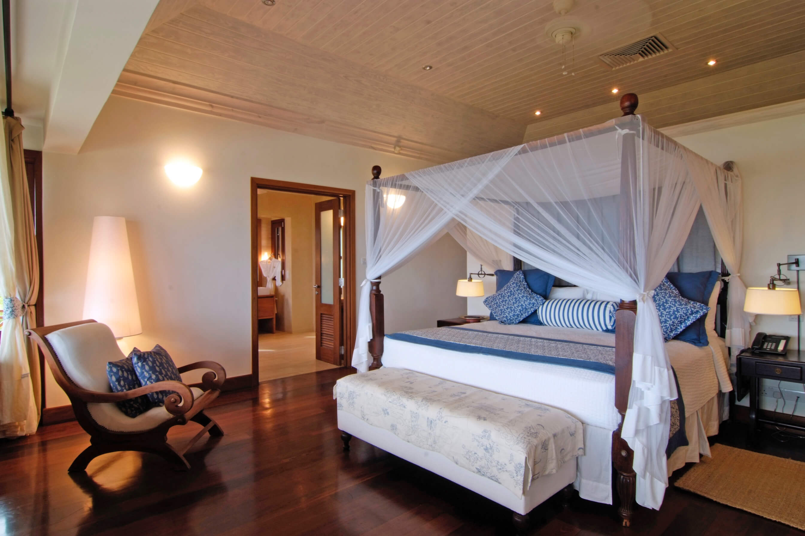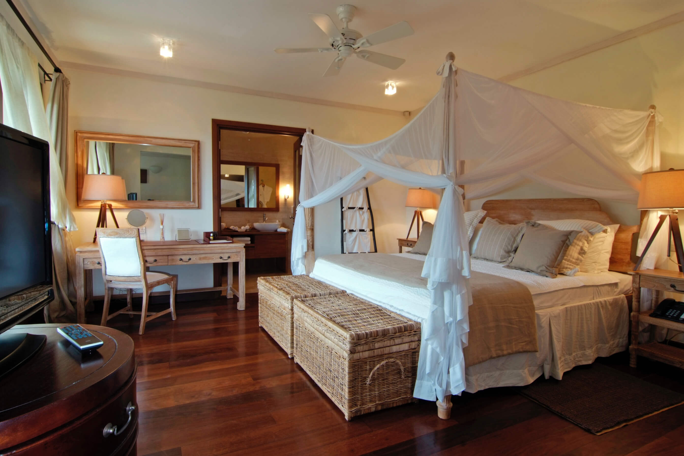 Bedroom 6 – One king size bed – Is 775 Sq. ft (72 Sq. m) with a king-size bed, en-suite bathroom with shower, double vanity, air conditioning, fan, safe, telephone, private terrace, TV, wireless access, mosquito net.