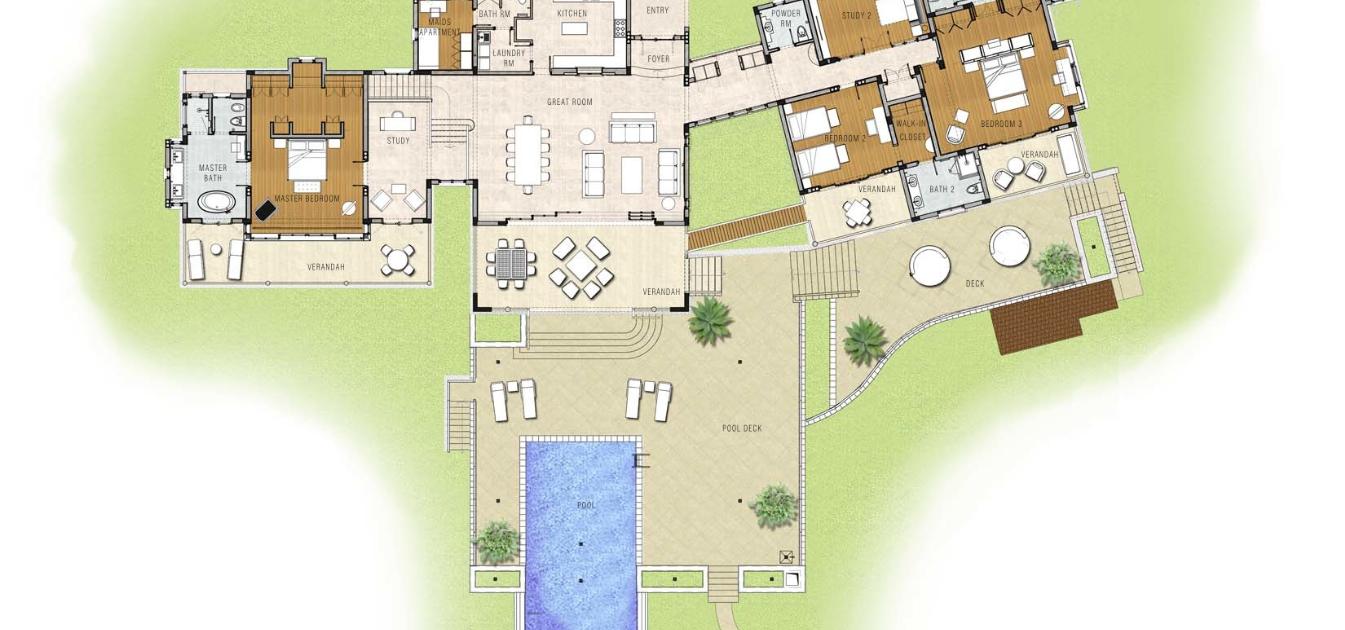 The left wing has the study/media room which can also be converted into a bedroom as the sofa is a fold-out bed. 3 bedrooms all have en suite bathrooms, central air conditioning, ceiling fans and private verandas. You will experience elegant yet comfortable indoor and outdoor living with an ambiance that is relaxing and romantic.