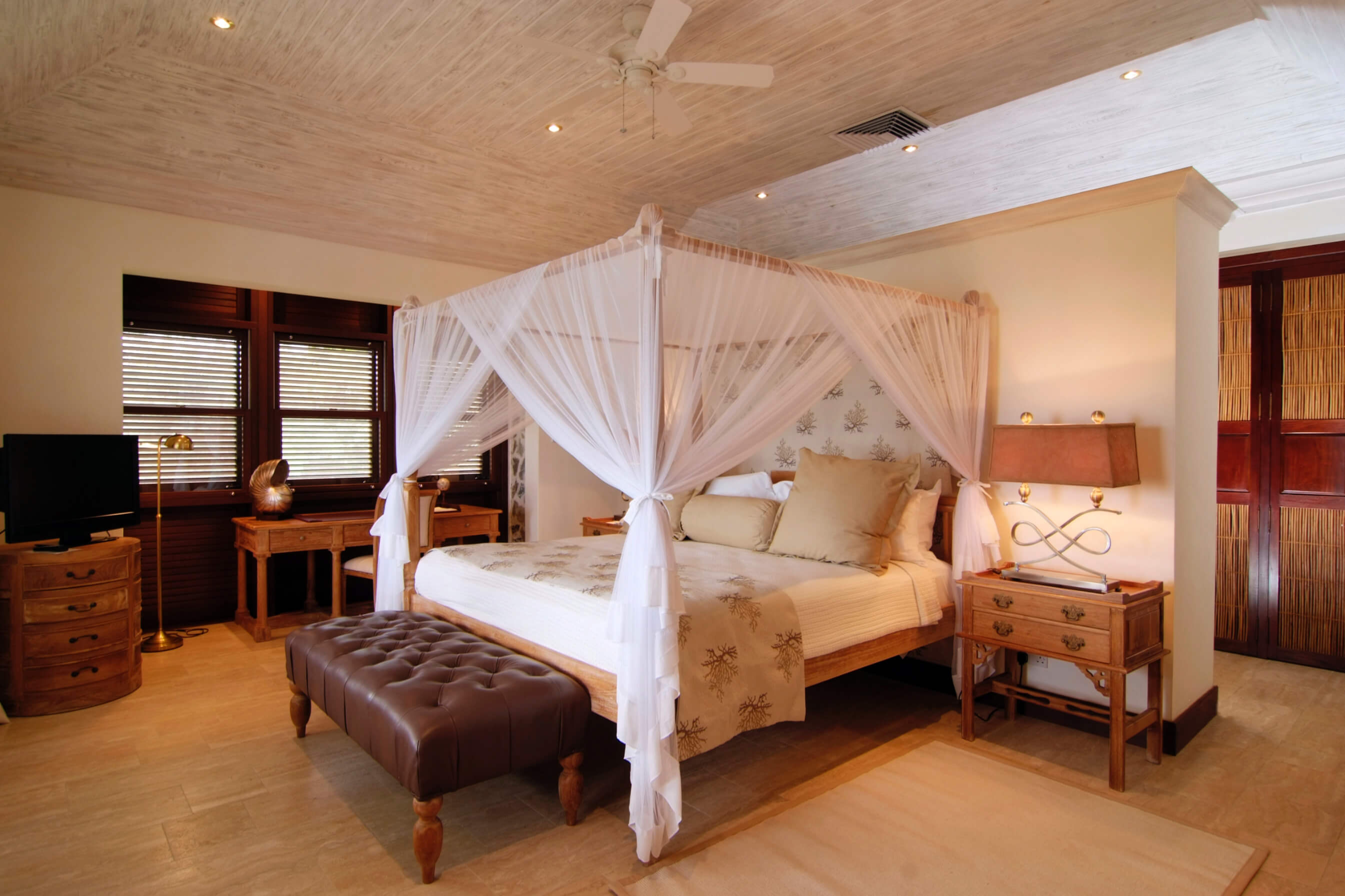 Bedroom 2 – Master – Is 455 Sq. ft (42.3 Sq. m) with a king-size bed, en-suite bathroom with bathtub and shower, double vanity, air conditioning, fan, safe, telephone, private terrace, TV, wireless access, mosquito net.ì