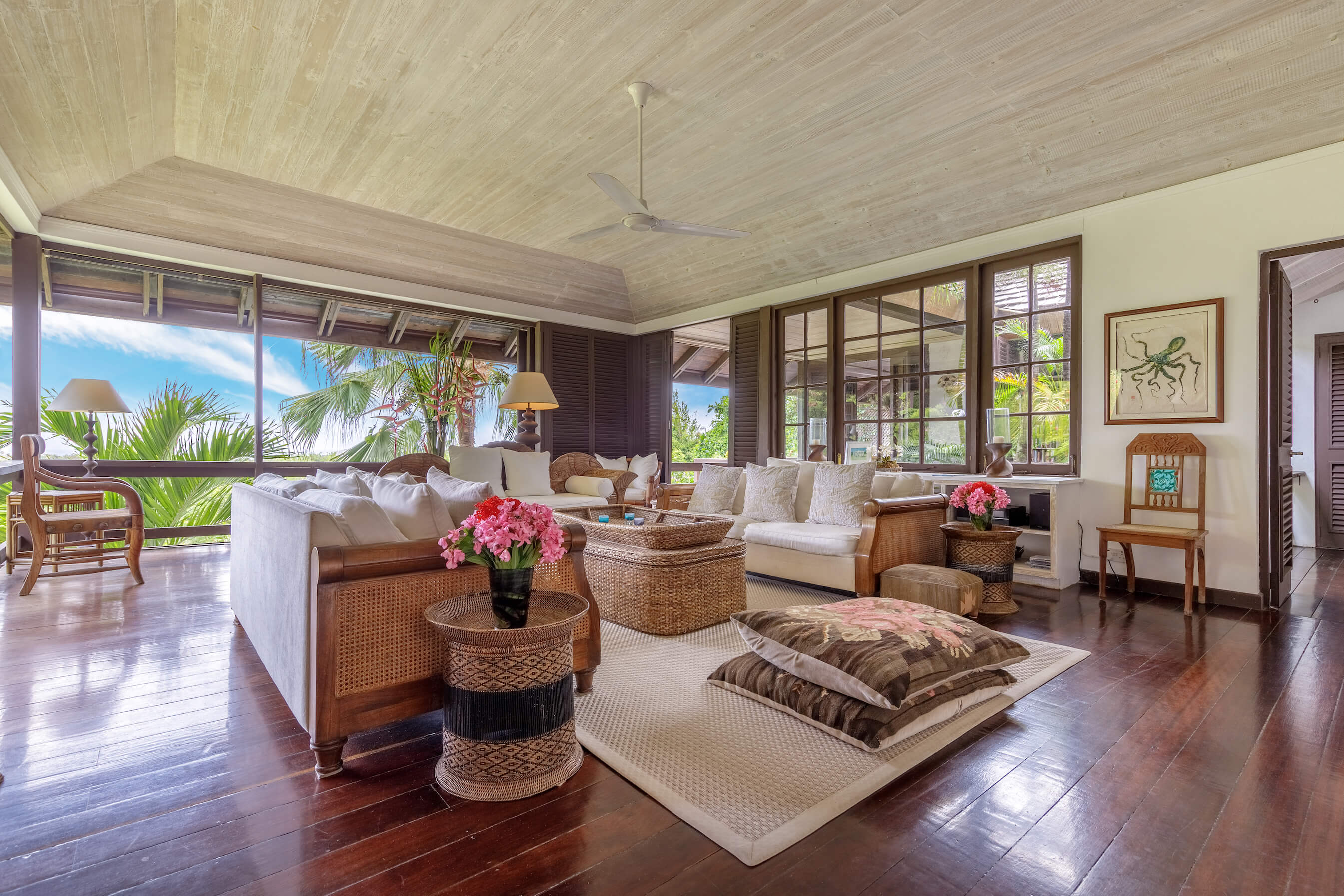 The villa was built in 1980 and has recently been refurbished and modernised. The living room at Tetto Rosso, also known as the Island Room, is designed in such a way as to provide a comfortable, relaxed yet atmospheric environment with it's unique inner garden fringed by tropical palms and shrubs. With polished dark-wood floors and comfortable cushions and rattan couches. Every window and door is framed by lush tropical foliage. This is a house that feels part of the landscape, shaded, natural and relaxing.
