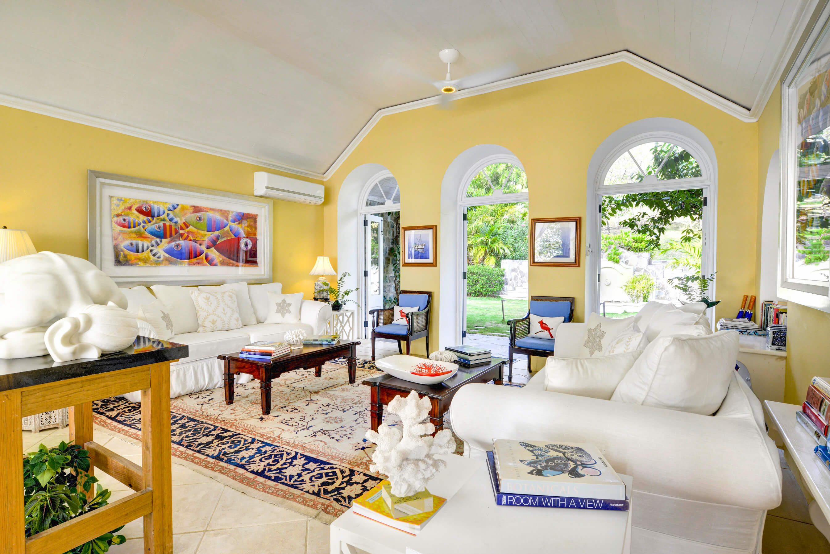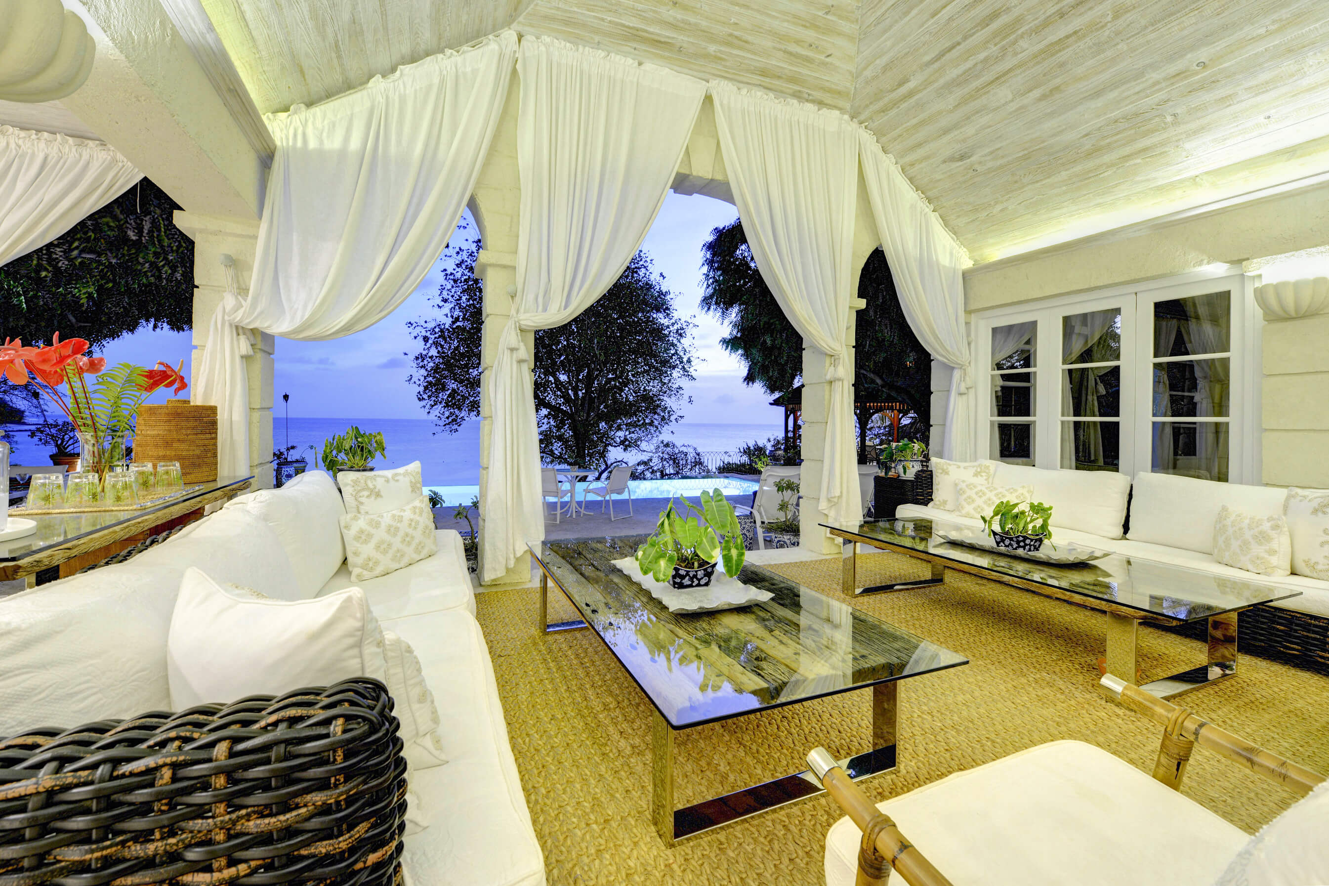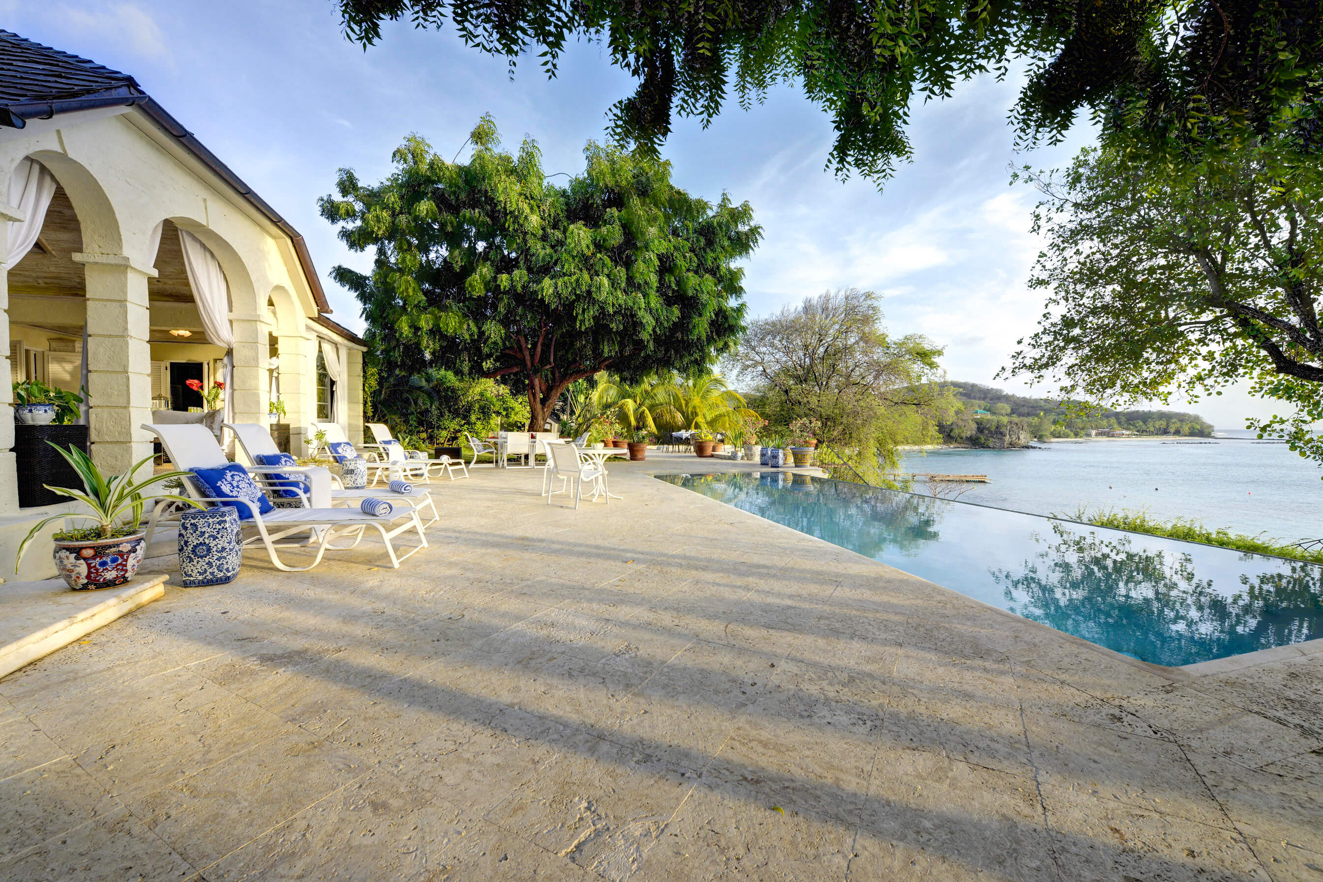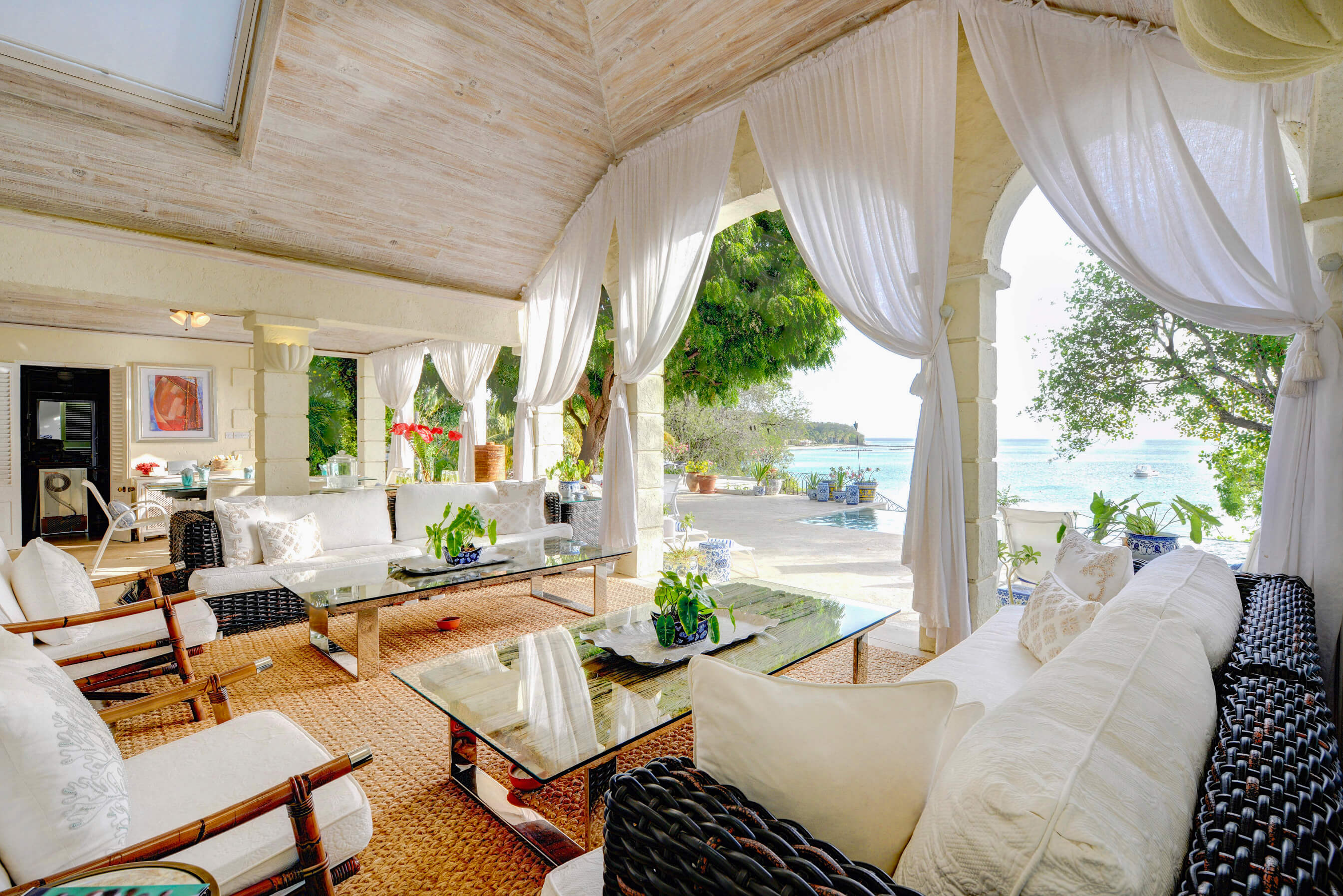 The stylish living room is located at the centre of the property, with impressive arched doors at either end leading onto an open verandah with both a family room and dining area, perfect areas to enjoy the expansive views in comfort. The central living space is flanked by two classically styled en suite bedrooms, furnished & tastefully decorated tastefully. The newer, seaside bedrooms, have simply wonderful views and the soothing rhythm of the Caribbean sea to enjoy.