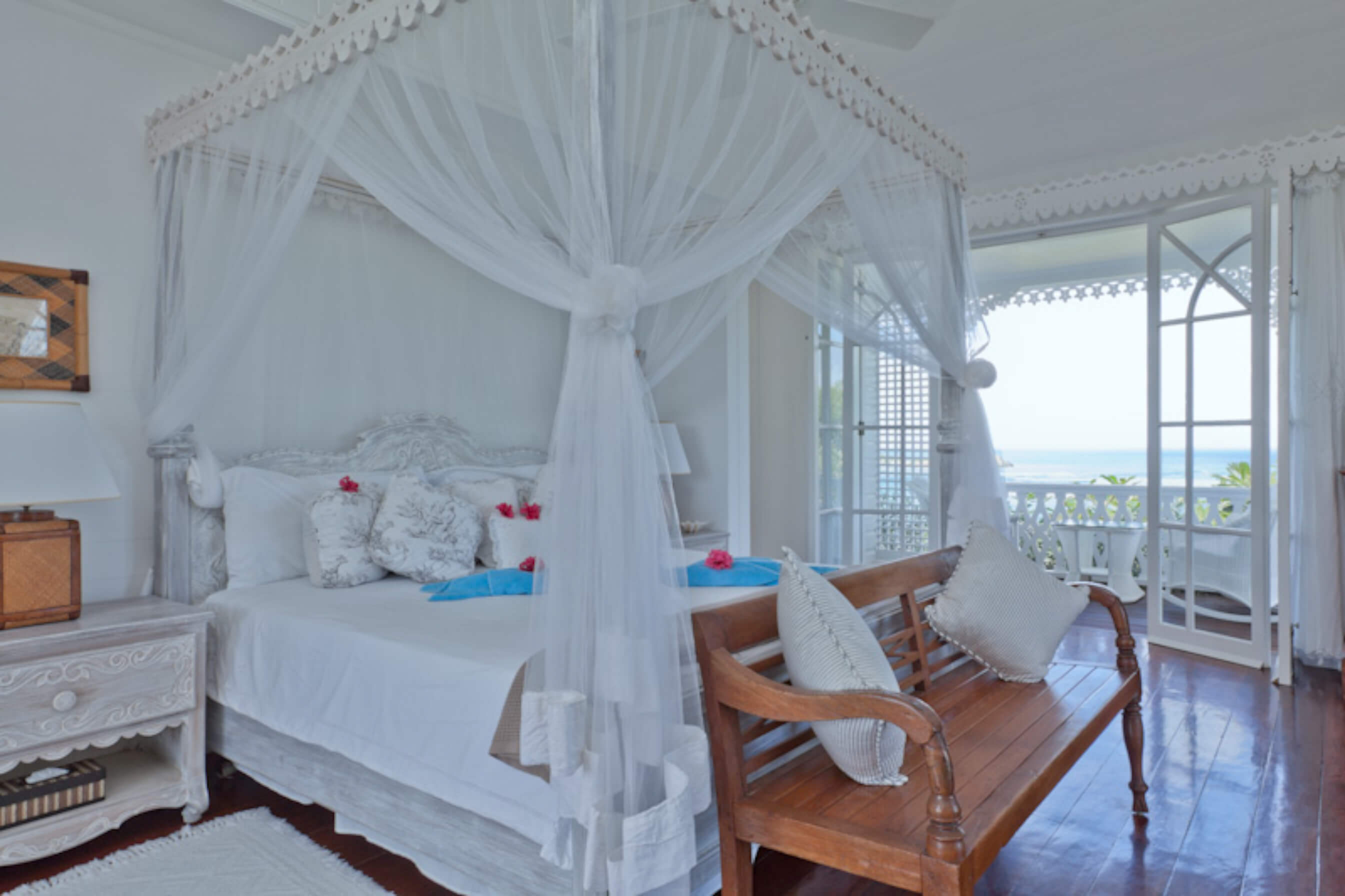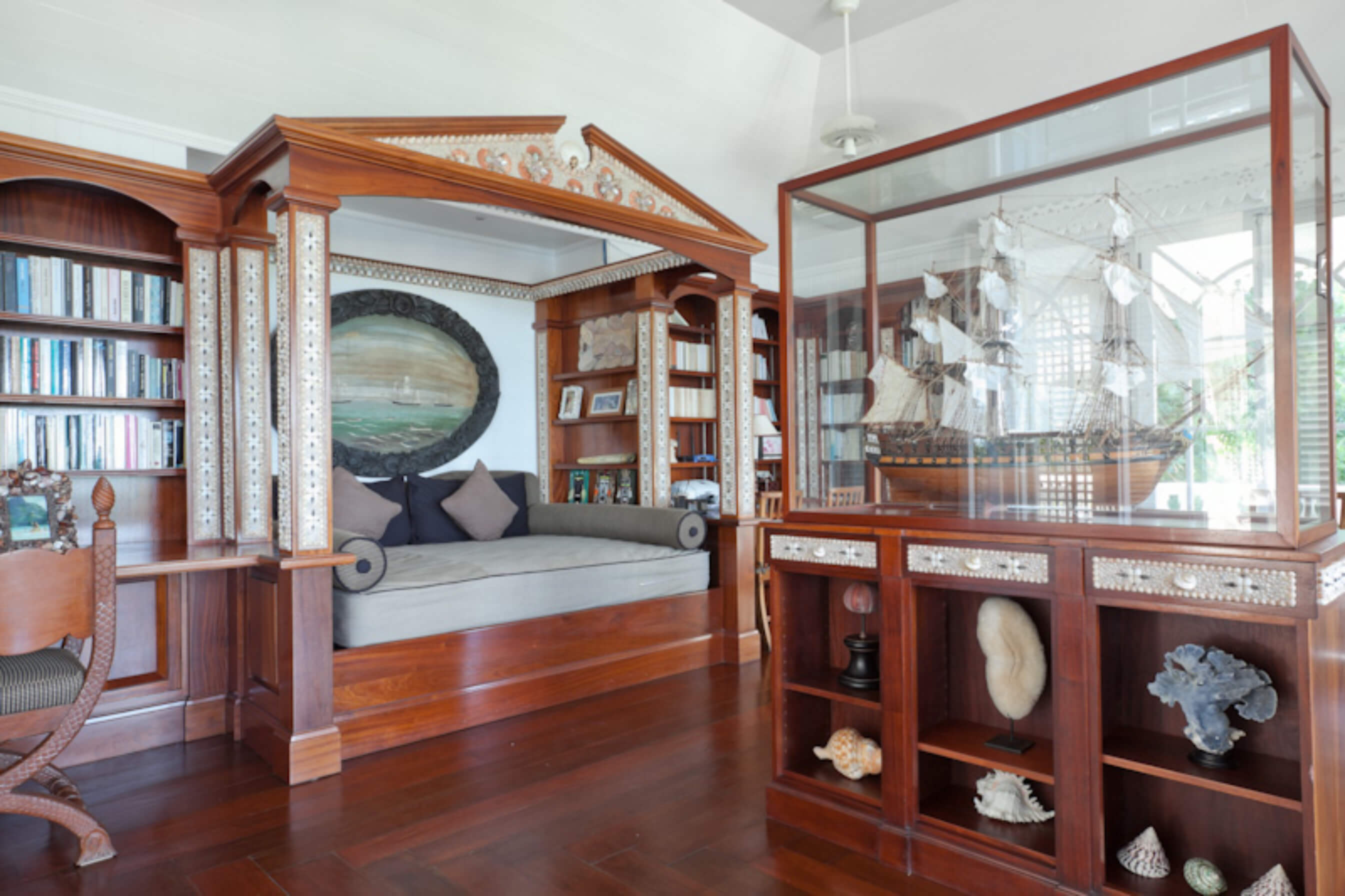 5 Double Suite Bedrooms plus 3 delightful childrens bedrooms all enjoying unparalleled views the island and ocean. This villa is perfect for a large group with children and can accommodate 10 adults plus 6 children. The layout of the rooms is ideal with several of the children’s rooms connected. When it comes to living space, there are board games aplenty in the living room, a pétanque court and a table tennis table for inter-family competitions. Frangipani boasts a 60 ft drawing room overlooking the splendid swimming pool and a glorious library with a vast mahongany day bed.