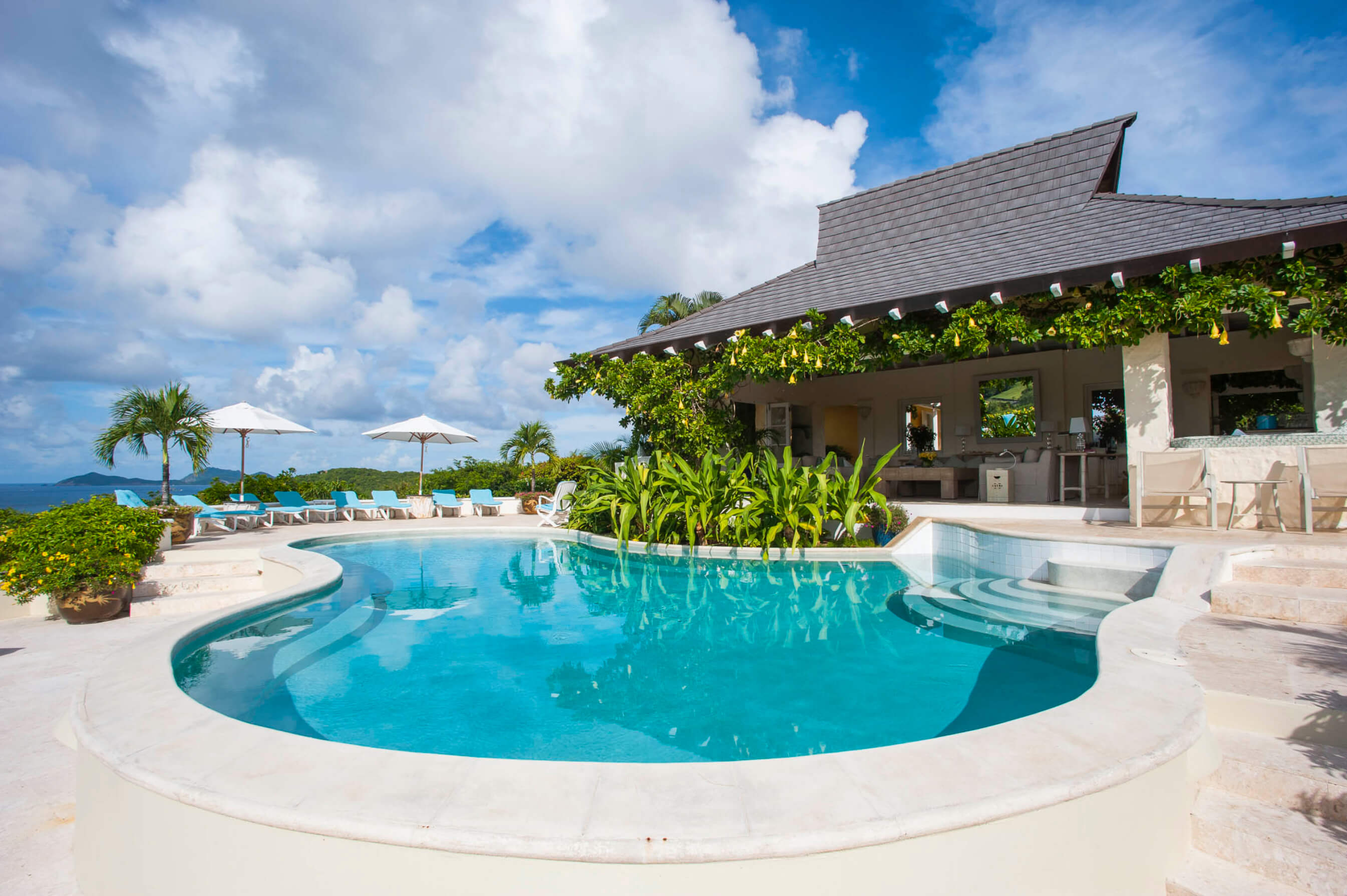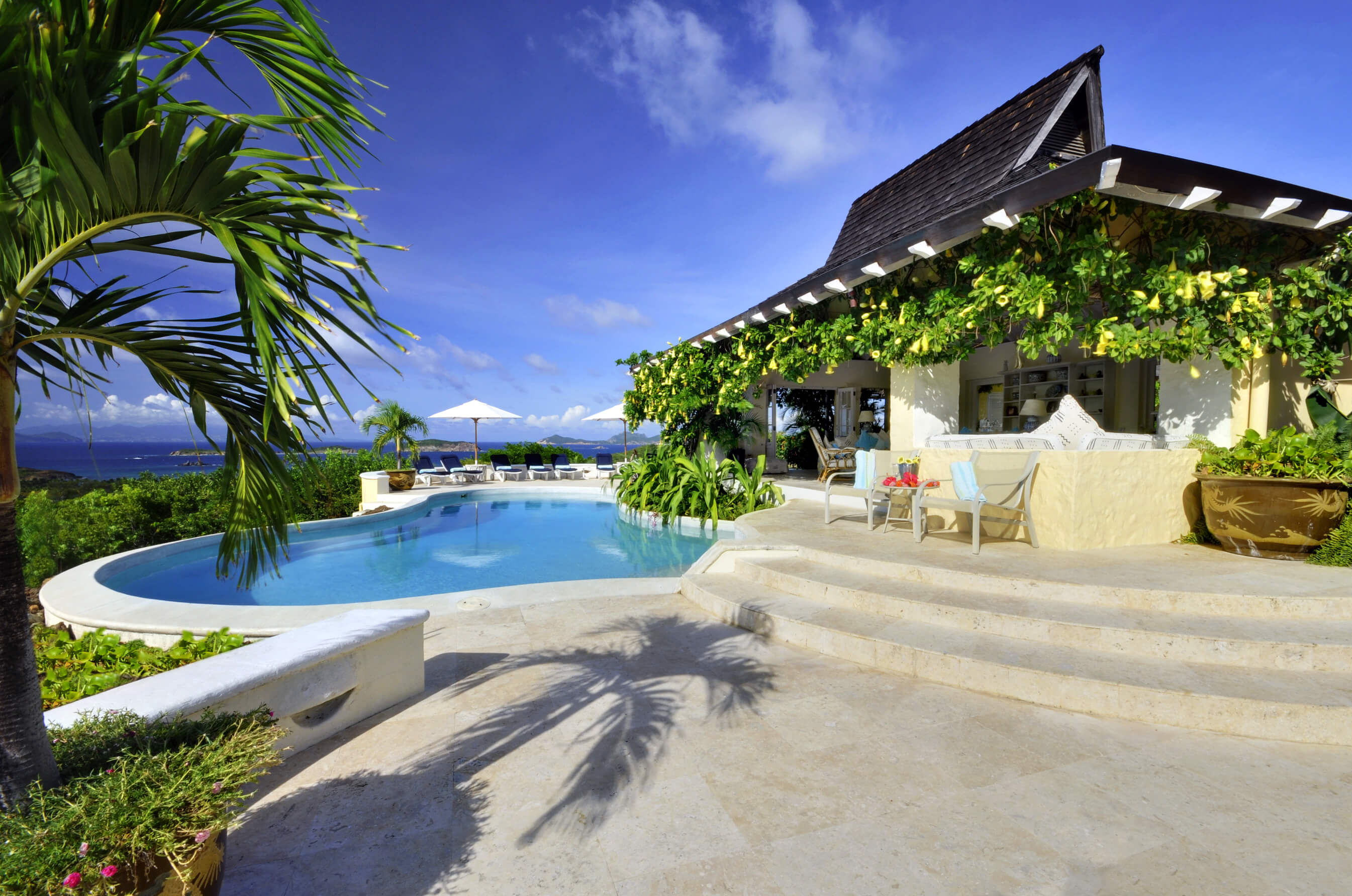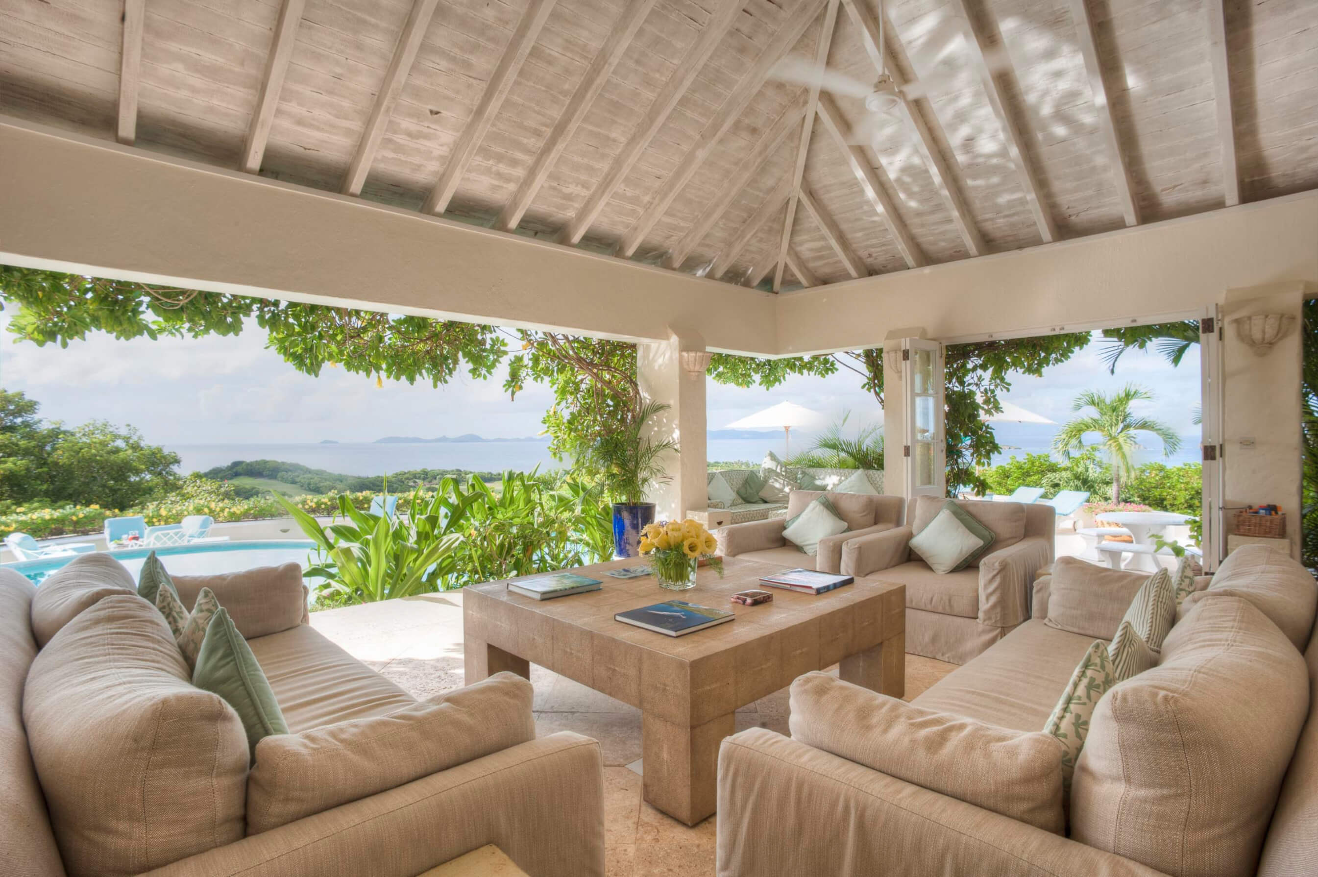 Renovated in 2010, the tasteful living and dining rooms are decorated in a chic Caribbean style with elegant English furnishings, connected to the villa's unique, pear-shaped swimming pool and surrounding sundeck.